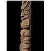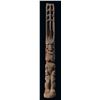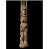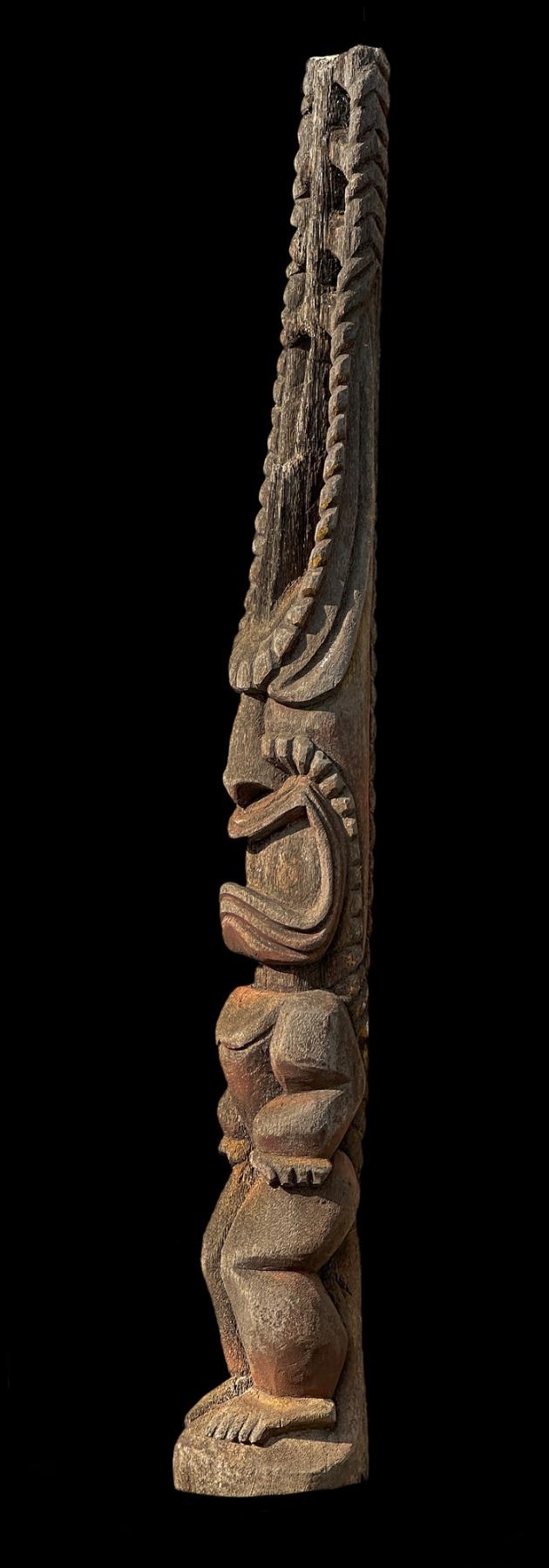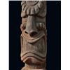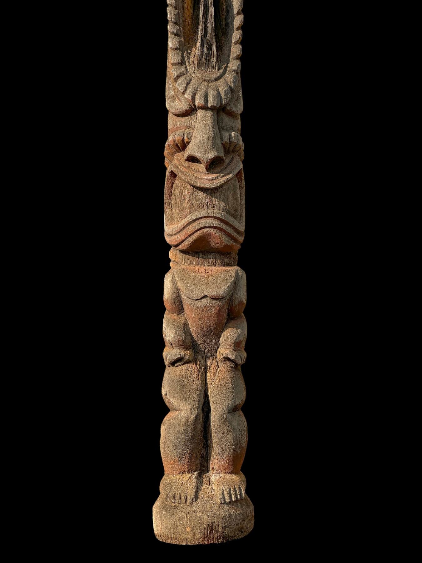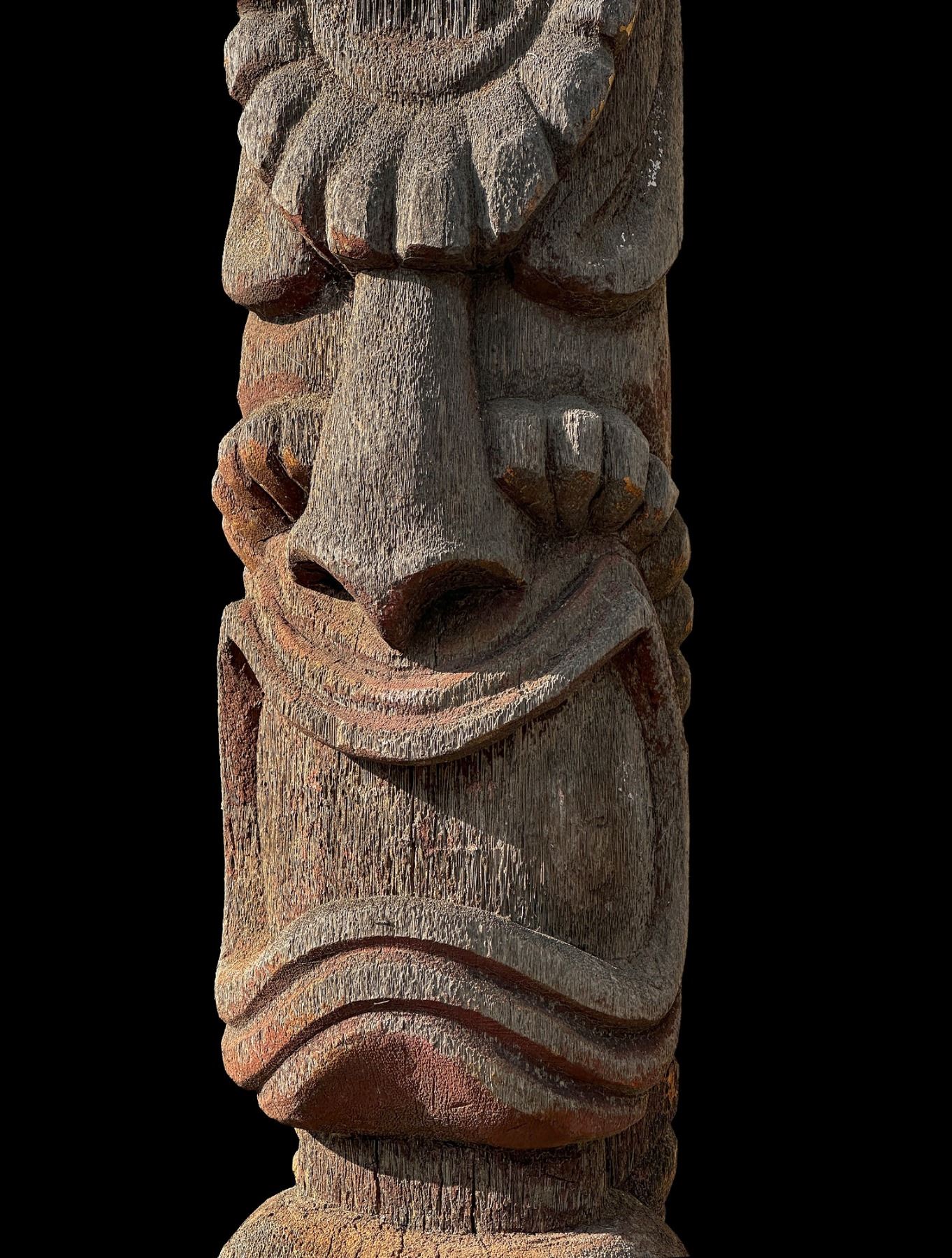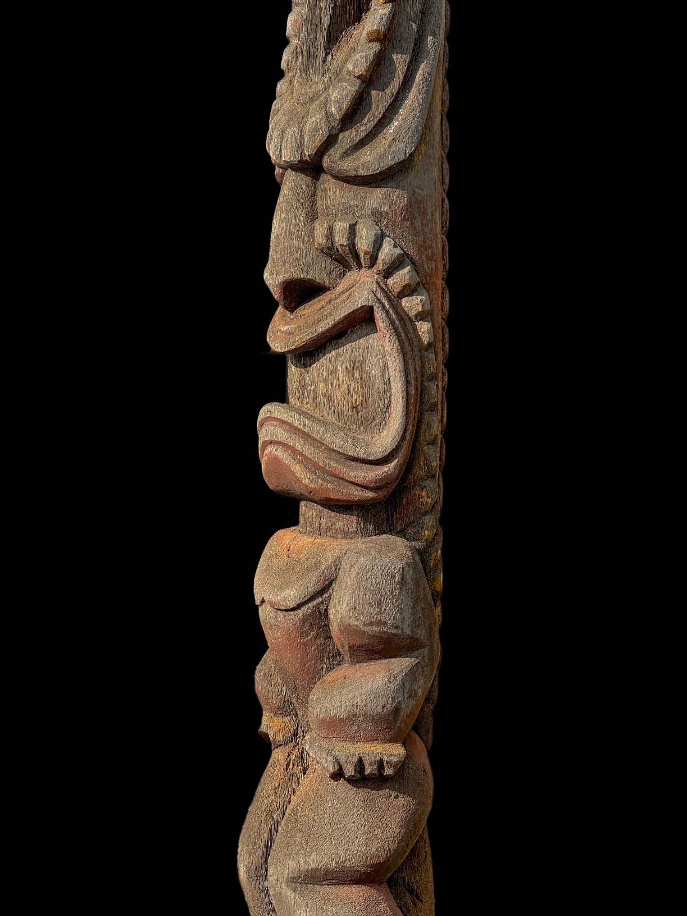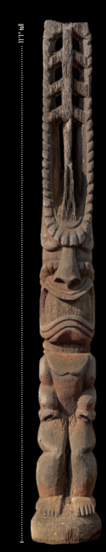 (1960s)* It simply does not get any better than this! On offer is a stunning, original carving from THE TIKIS theme park in Monterey Park and eventually moved to THE TIKIS II in Lake Elsinore. The carver is unknown however, the style is such that matched many of the Tiki carvings from the first iteration of THE TIKIS. This palm figure has classic 60s design with the full body on base, topped by a giant headdress commonly attributed to the Hawaiian god, LONO. This figure was copied by LeRoy Schmaltz of Oceanic Arts for the GIGANTIC version he created for the main stage at THE TIKIS and resurrected again at THE TIKIS II. Upon the repossession of the property, Danny sold this Tiki to Sven where it has resided in his front yard lanai ever since. Balsz once proclaimed, "The Hawaiians say the more Tikis you have around your place, the better luck you have, so I start carving Tikis!" If ever there was a signature Tiki to represent the dreamer of Daniel Blasz, this is it! The base wood has been treated and fortified. There is some wear to the palm fiber in areas such as the headdress. Overall, VG+ with solid wood and retention of some of the original 1960s paint. Obviously, this oversized item will require special shipping consideration. 17"dia x 133" (11'1").