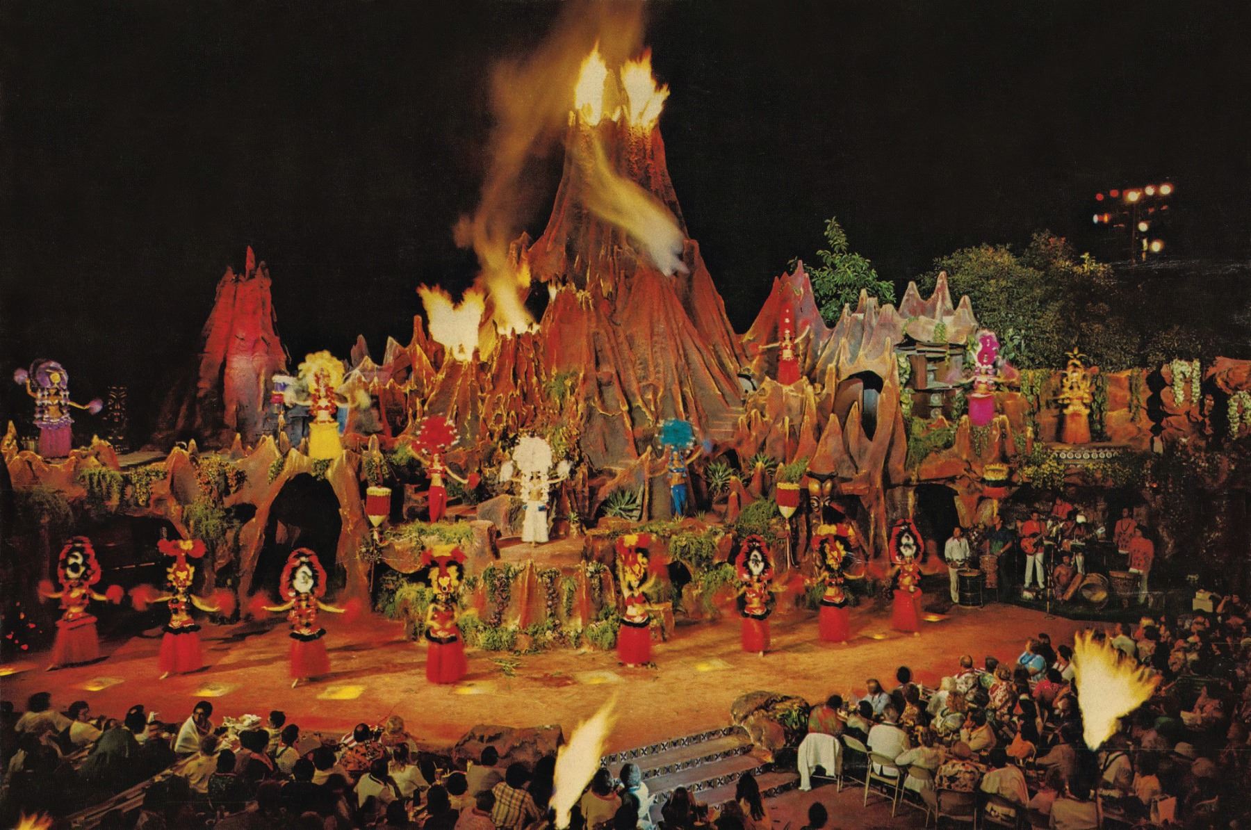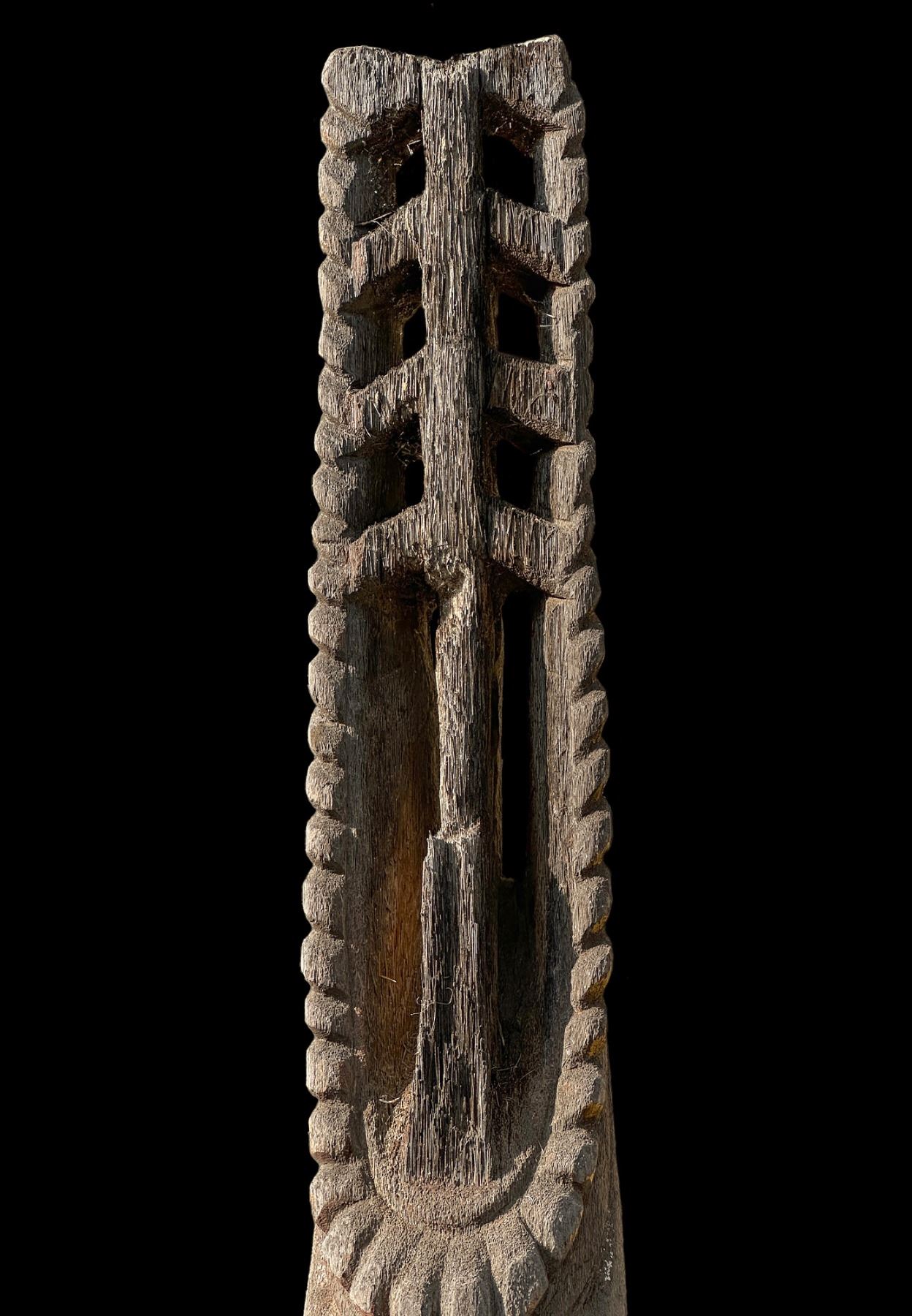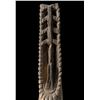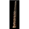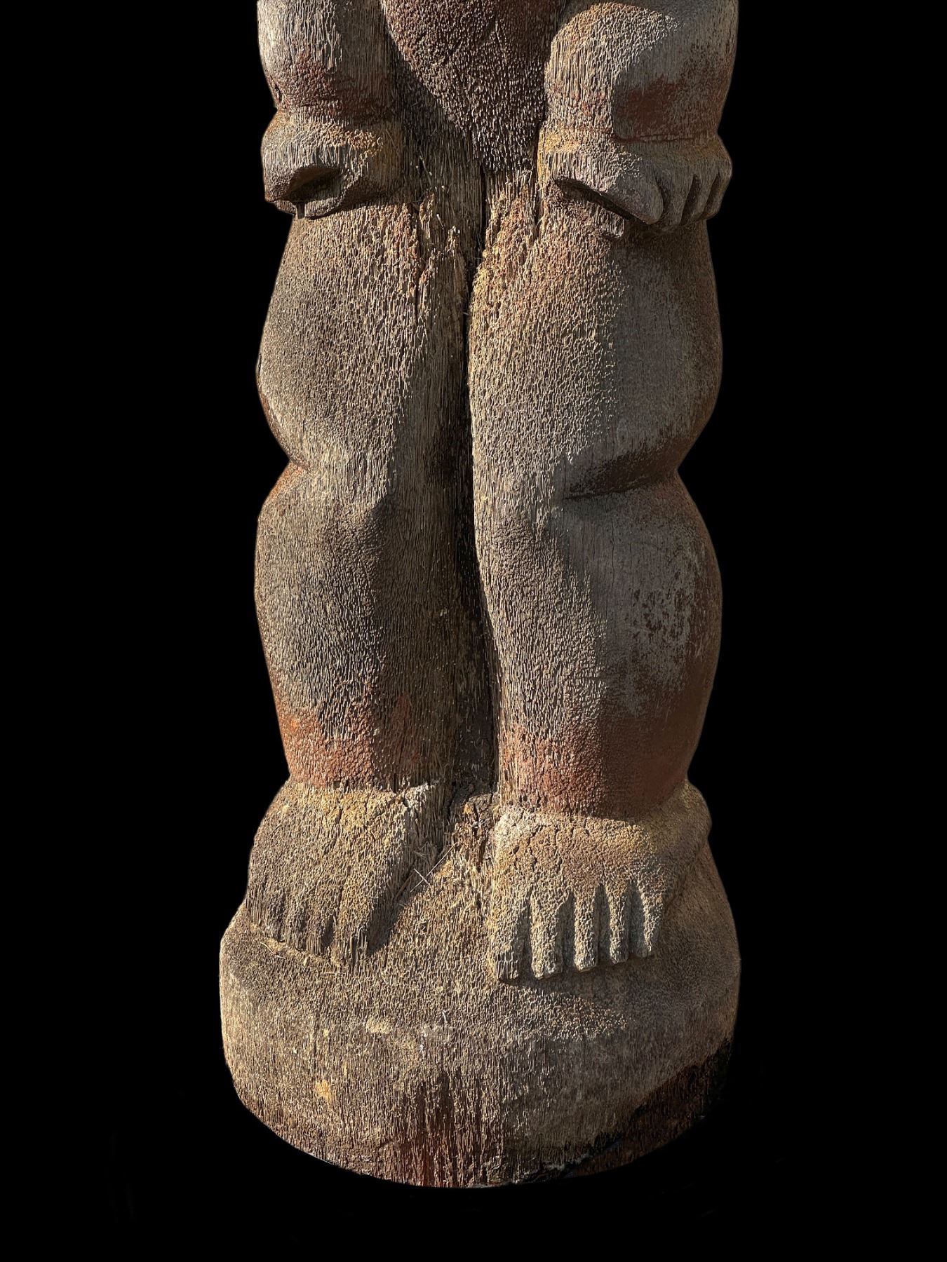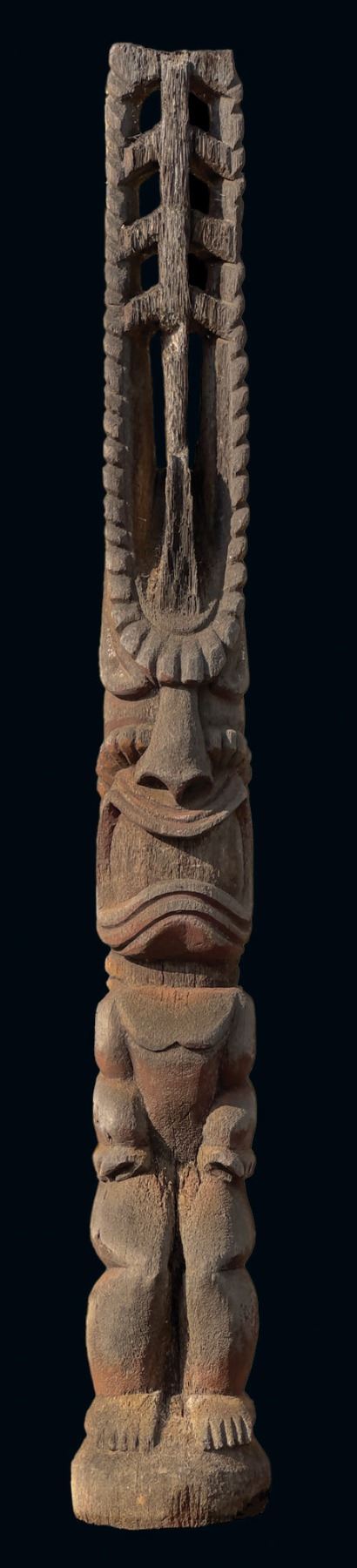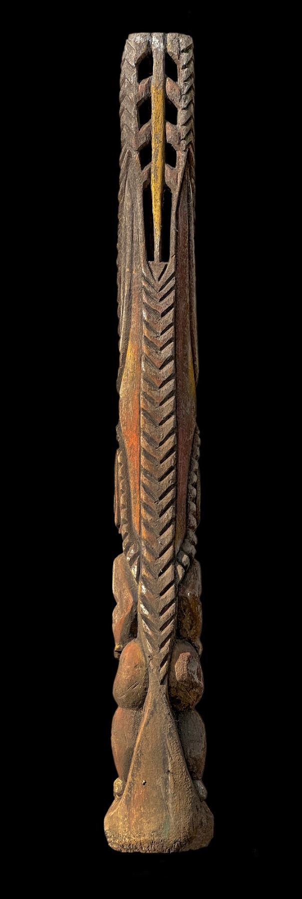 (1960s)* It simply does not get any better than this! On offer is a stunning, original carving from THE TIKIS theme park in Monterey Park and eventually moved to THE TIKIS II in Lake Elsinore. The carver is unknown however, the style is such that matched many of the Tiki carvings from the first iteration of THE TIKIS. This palm figure has classic 60s design with the full body on base, topped by a giant headdress commonly attributed to the Hawaiian god, LONO. This figure was copied by LeRoy Schmaltz of Oceanic Arts for the GIGANTIC version he created for the main stage at THE TIKIS and resurrected again at THE TIKIS II. Upon the repossession of the property, Danny sold this Tiki to Sven where it has resided in his front yard lanai ever since. Balsz once proclaimed, "The Hawaiians say the more Tikis you have around your place, the better luck you have, so I start carving Tikis!" If ever there was a signature Tiki to represent the dreamer of Daniel Blasz, this is it! The base wood has been treated and fortified. There is some wear to the palm fiber in areas such as the headdress. Overall, VG+ with solid wood and retention of some of the original 1960s paint. Obviously, this oversized item will require special shipping consideration. 17"dia x 133" (11'1").