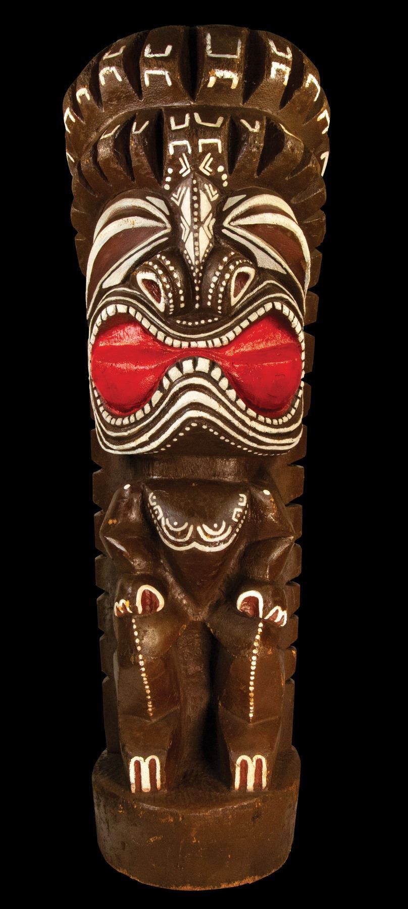 (1970s) This is a one-of-a-kind original carving by LeRoy Schmaltz. The ICONIC OA Hawaiian Ku Tiki God! It is substantial, standing at 8 feet tall. In the first OA auction, we sold the beautiful fiberglass casting of this tiki. Here is the original! The carving is exquisite and makes quite the impression. It also features an exceptional, classic OA polychrome scheme. This tiki has been in the OA Rental Department for decades, seeing much action everything from backyard luas, weddings, music videos and movies. A true treasure of Poly-Pop history. This piece is large and will will require special freight considerations. Please keep in mind the size on this one! 95.5"x29"x24". VG+ with typical wear.
