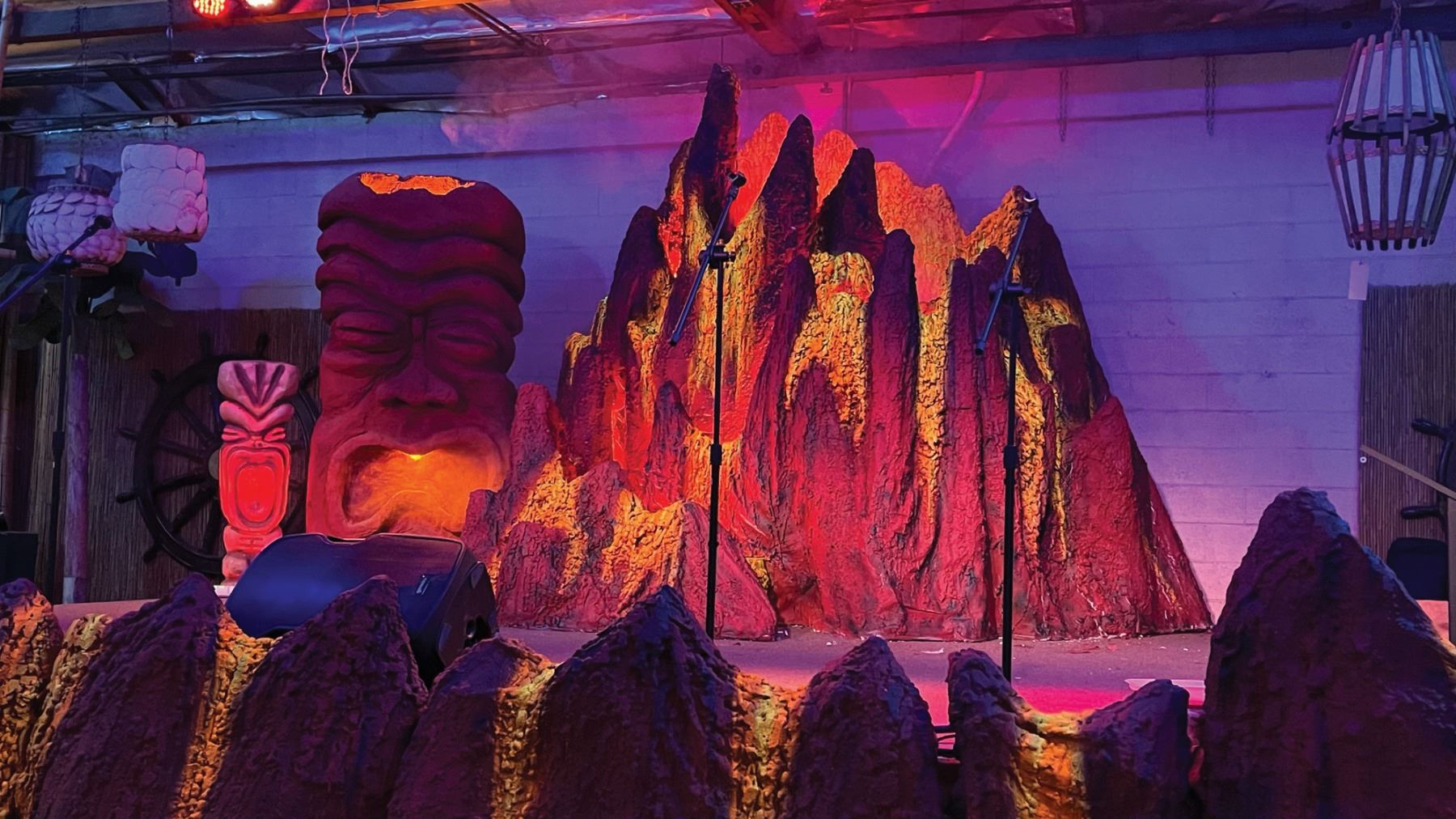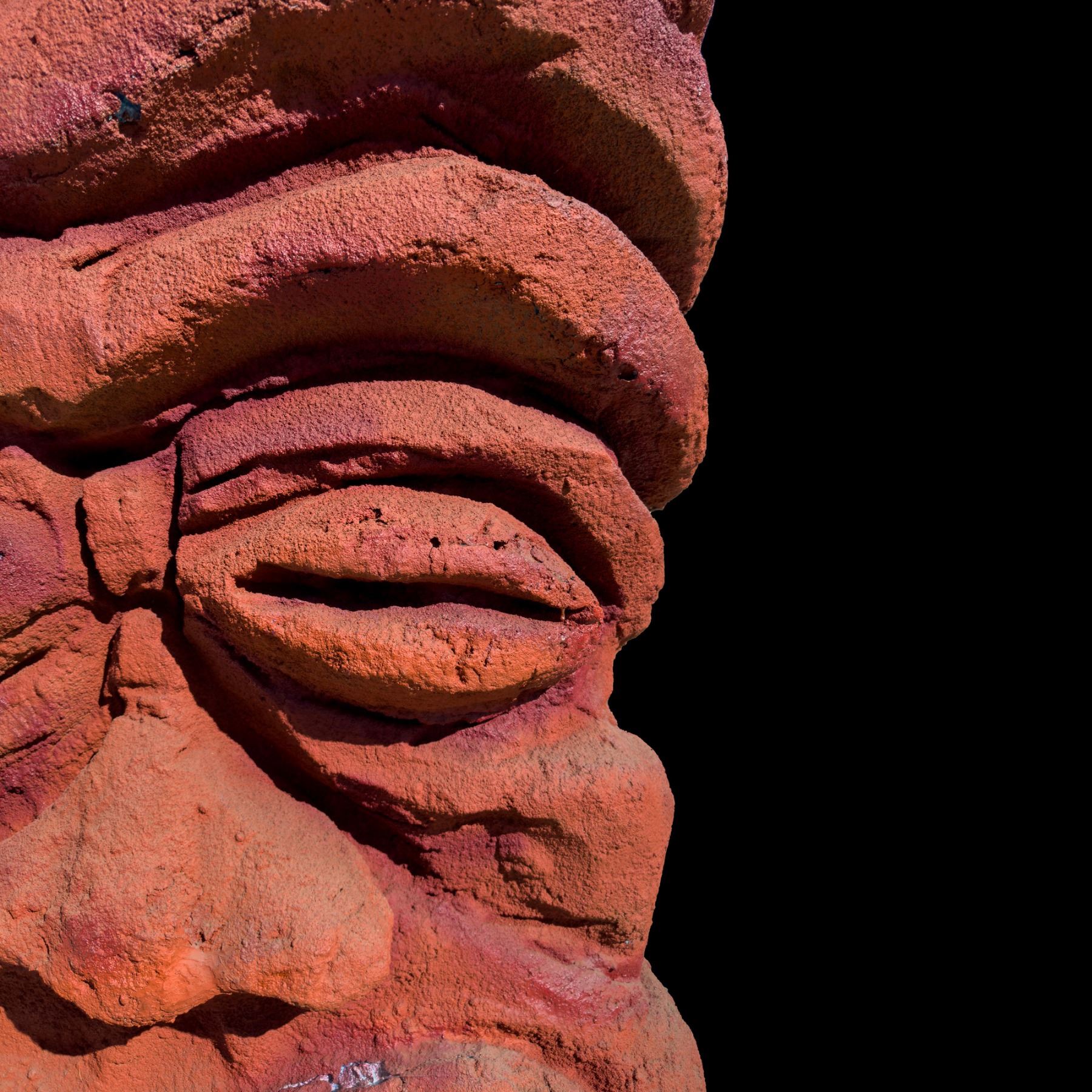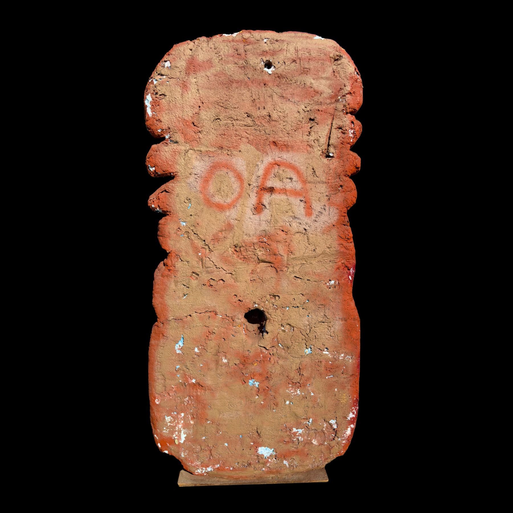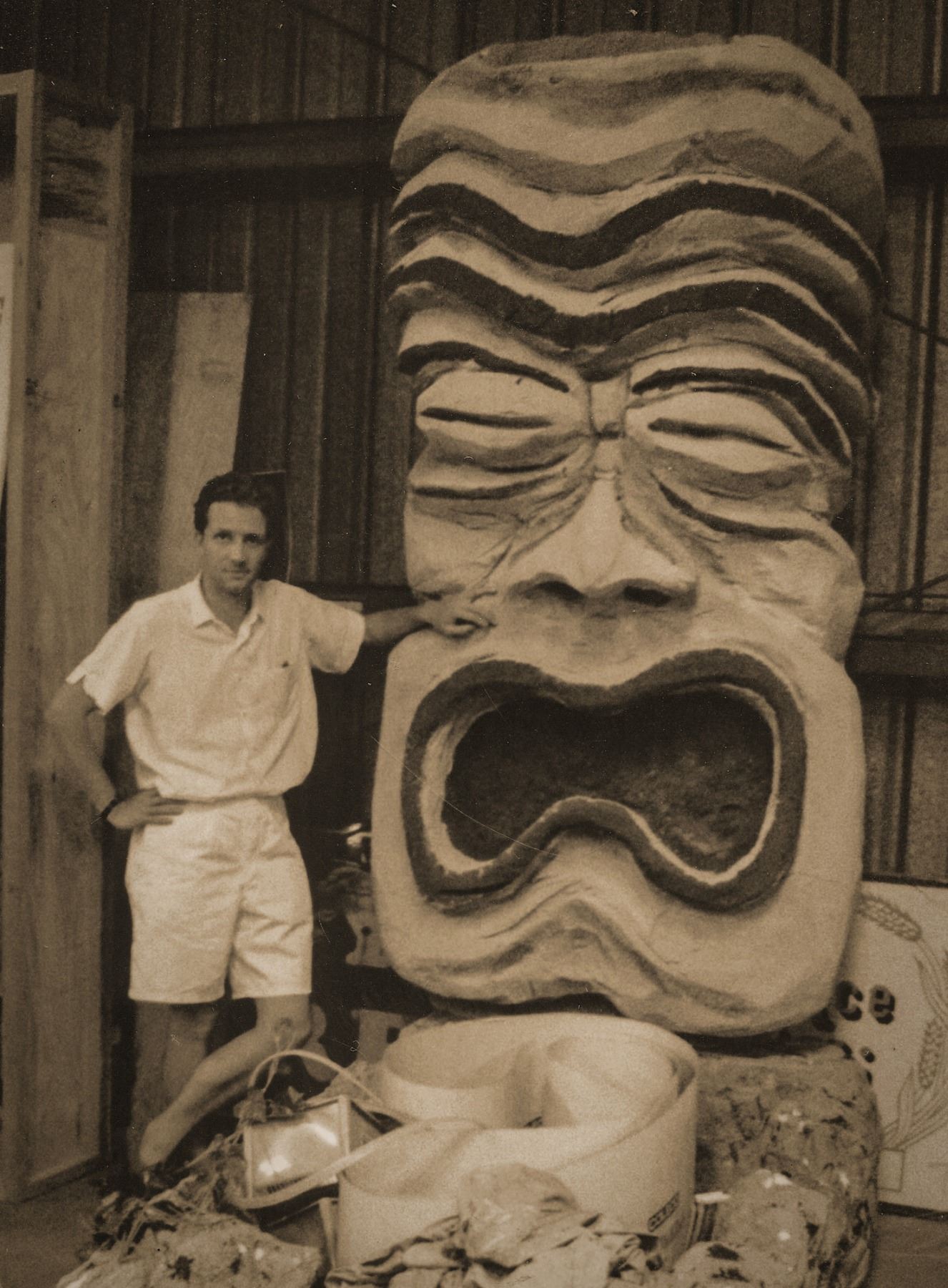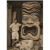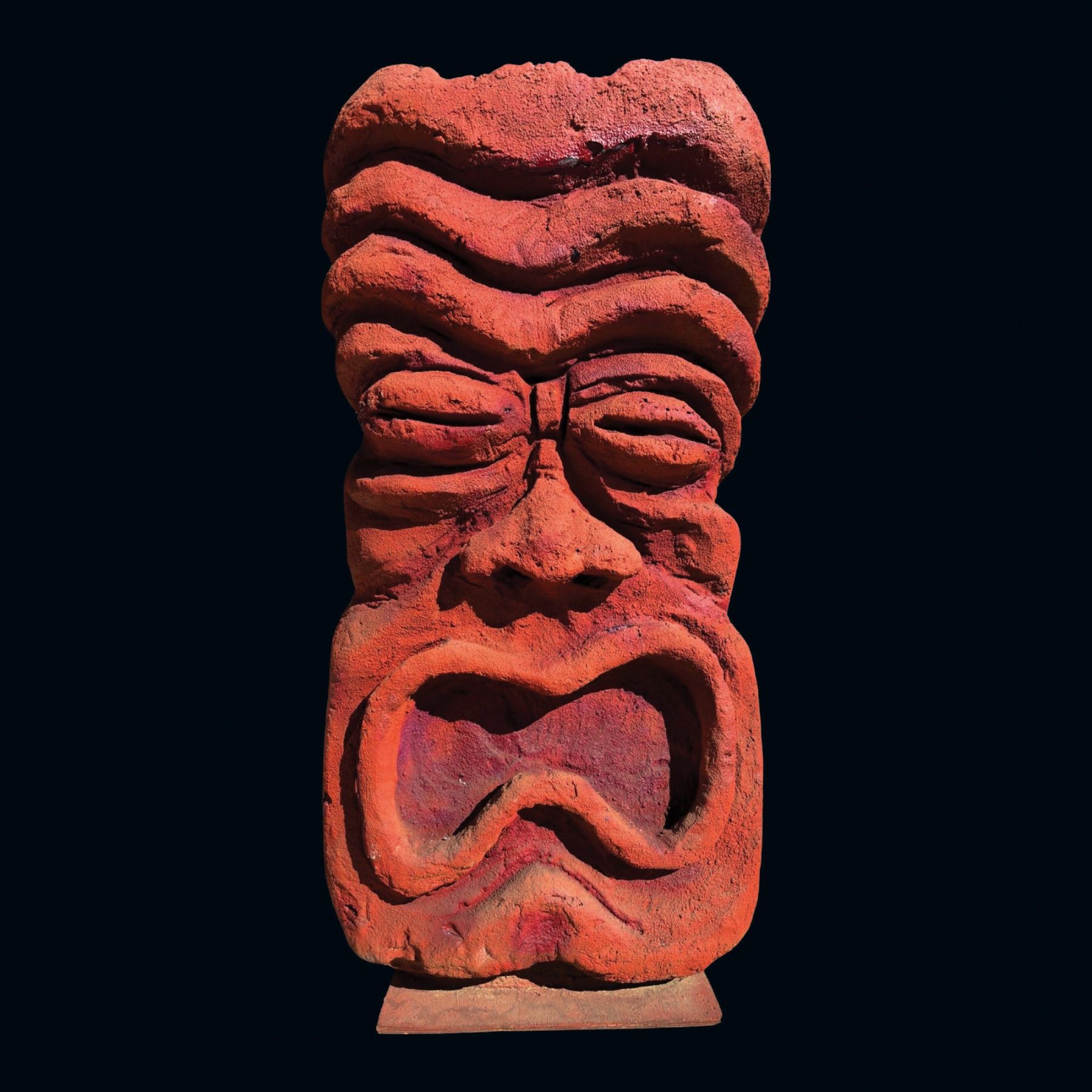 (1980s) This giant Tiki head has been a staple at the Oceanic Arts warehouse for decades. Made of a solid foam material, the figure is mounted on a plywood base stand. There is a recess in the mouth and head for lighting and smoke effects. For many years, this was a rental Tiki at OA and finally saw service on-stage at the ALOHA, OA! events celebrating Oceanic Arts' 65 years of operation. VG+ with typical wear from use such as chipping and general wear. As a composite foam material, it is easily touched up as OA did for decades! An oversize item will require special shipping considerations. 44"x96"x17".