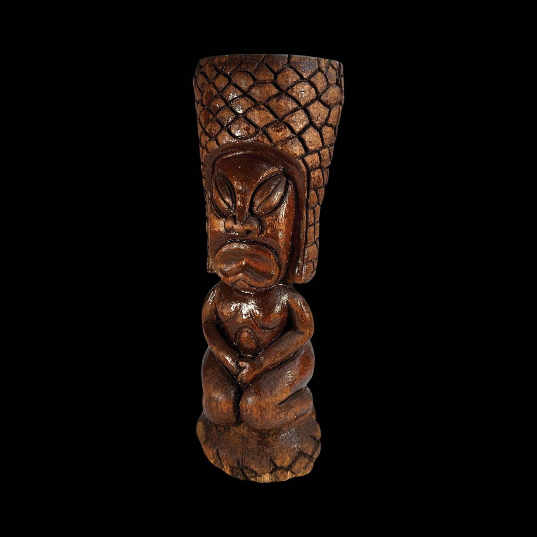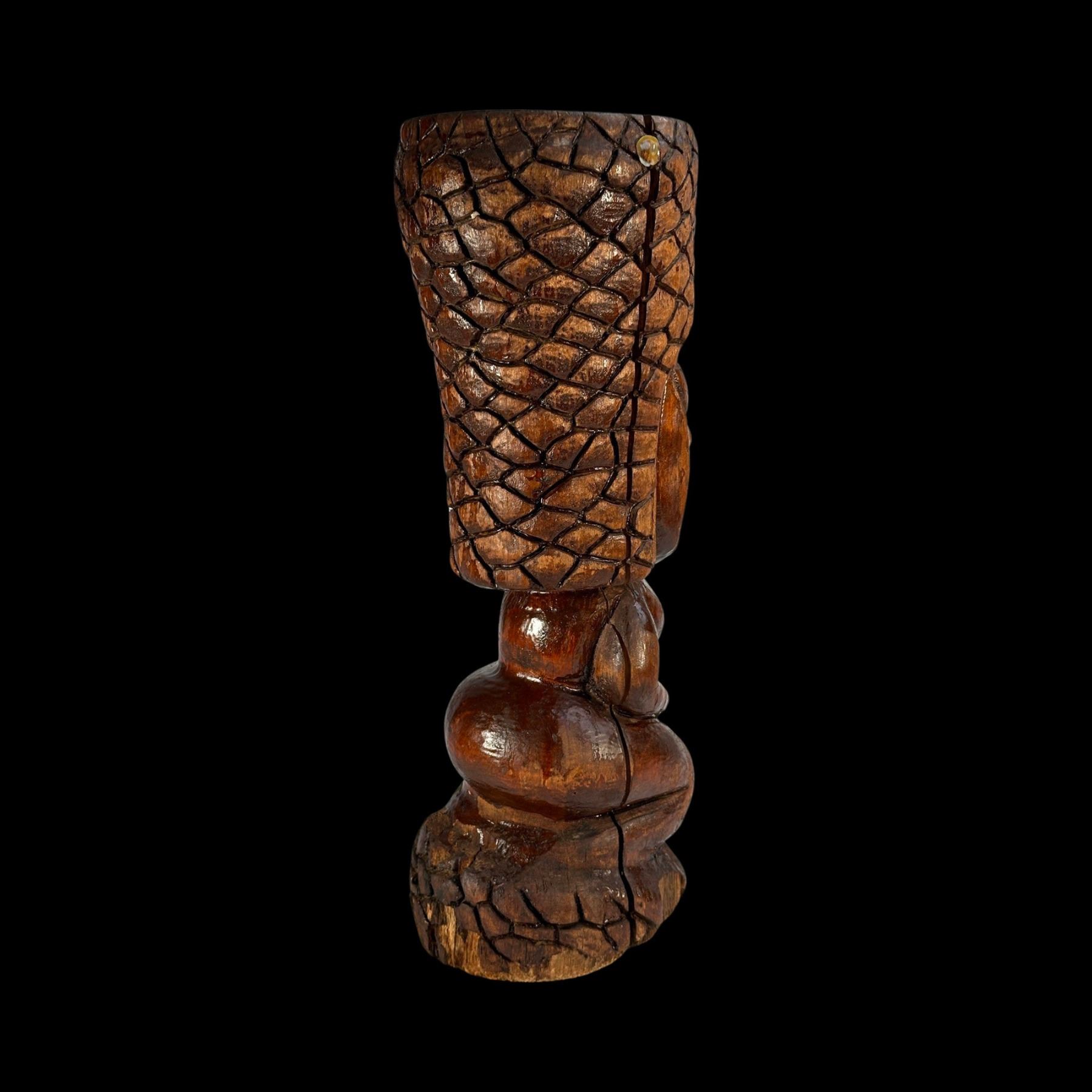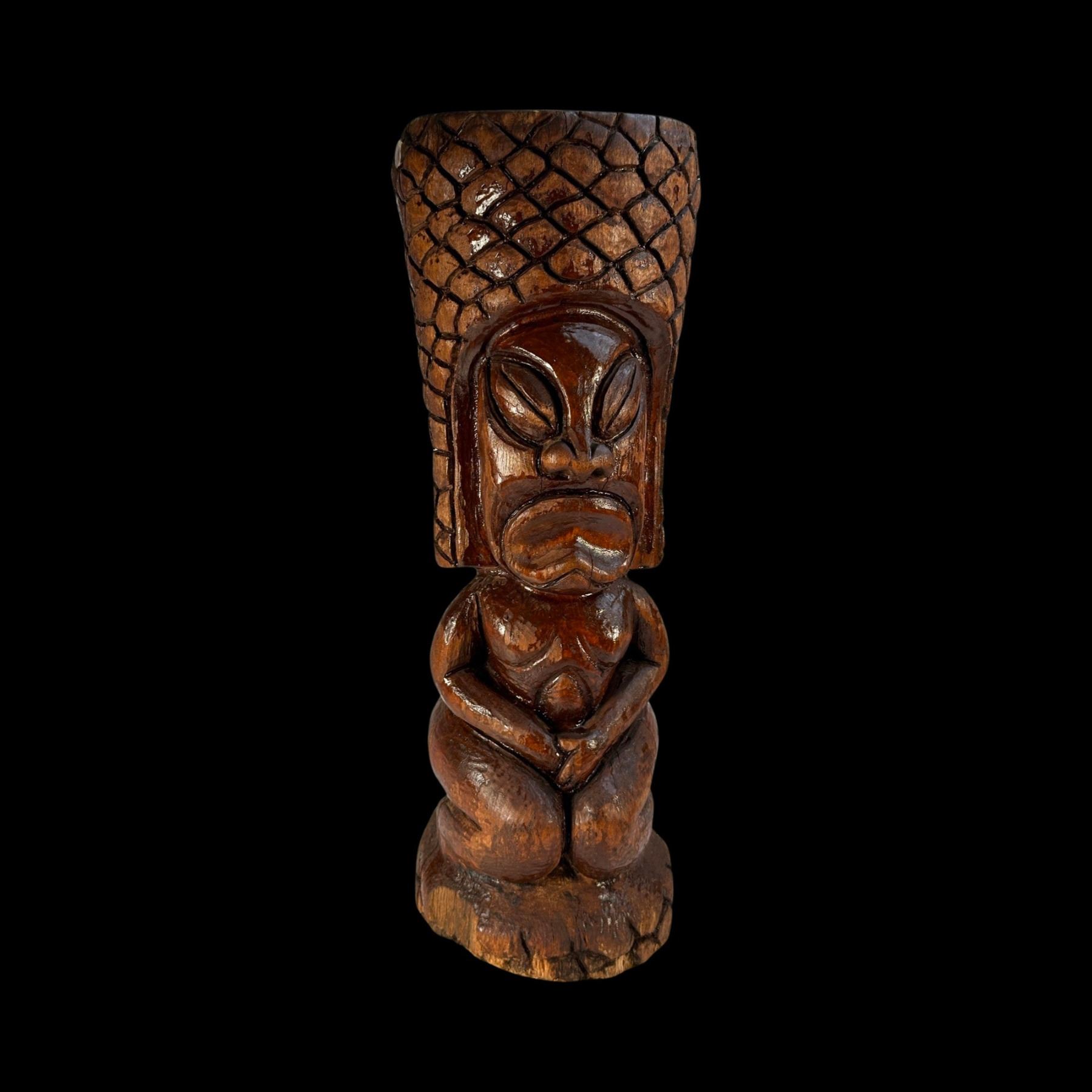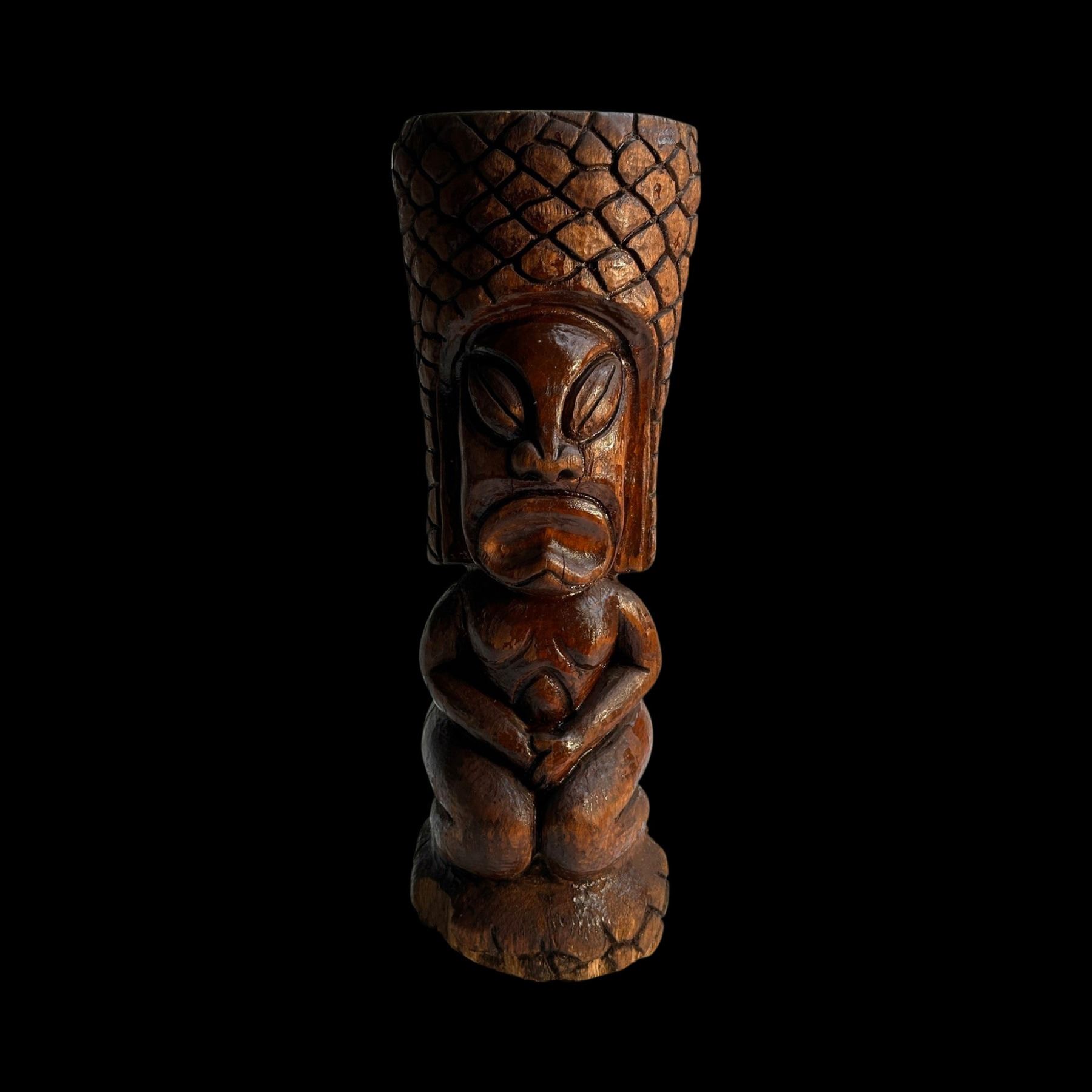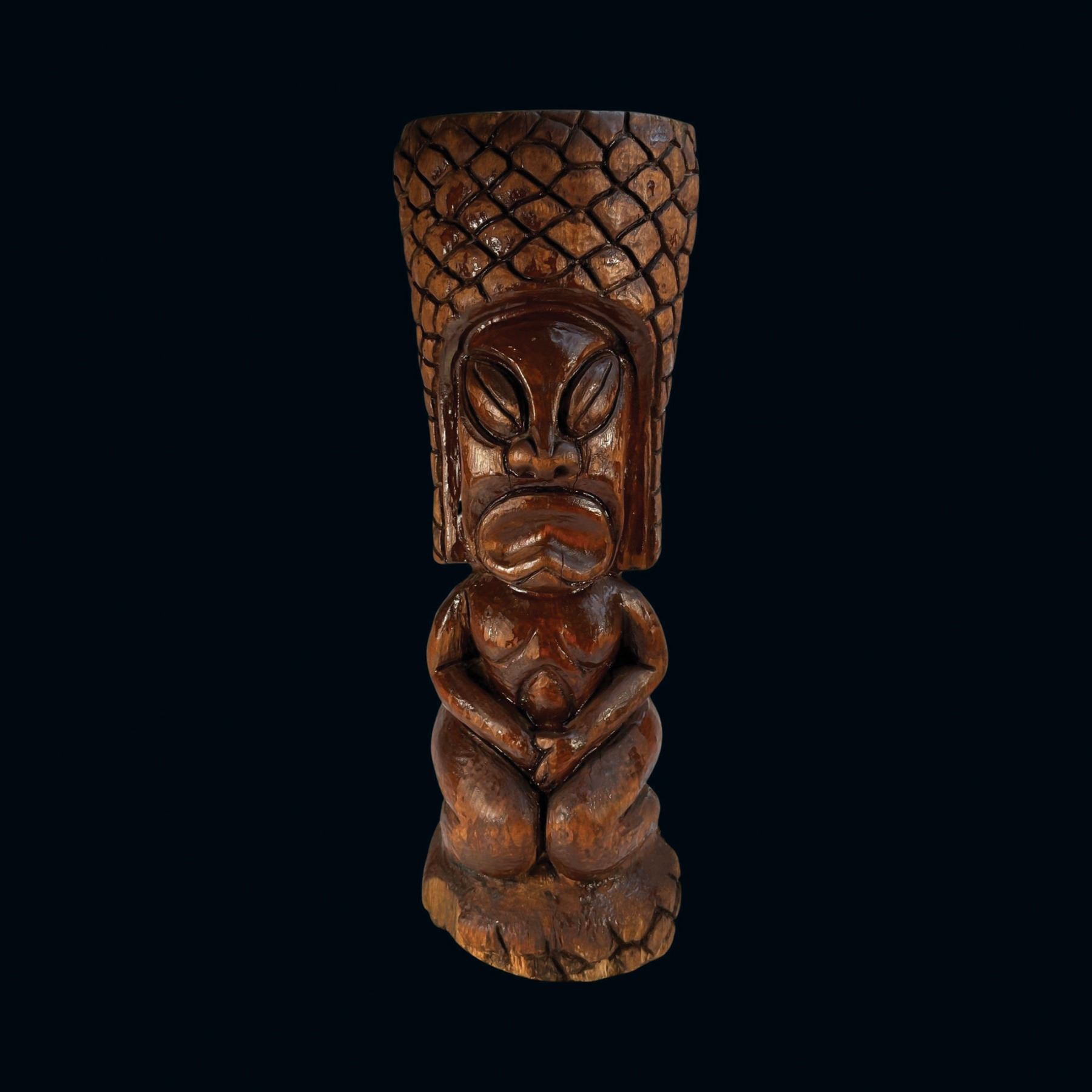 (1960s)* This STYLE Tiki appears in the TV series Gilligan™s Island in the episode Waiting for Watubi and also as a table lamp in a Mission Impossible episode. It was modelled after a Milan Guanko Tiki that stood outside the Miramar Hotels Tiki-Jo restaurant in Santa Monica. Guanko produced these in the 1960s and a similar carving to this was most probably acquired by the production prop department directly from Guanko. Small chunks missing from base. See online photos for turns. Overall VG+ with some typical chipping and wear to the main body of the figure and a small chunk of wood missing from the base. 7"dia x 19".