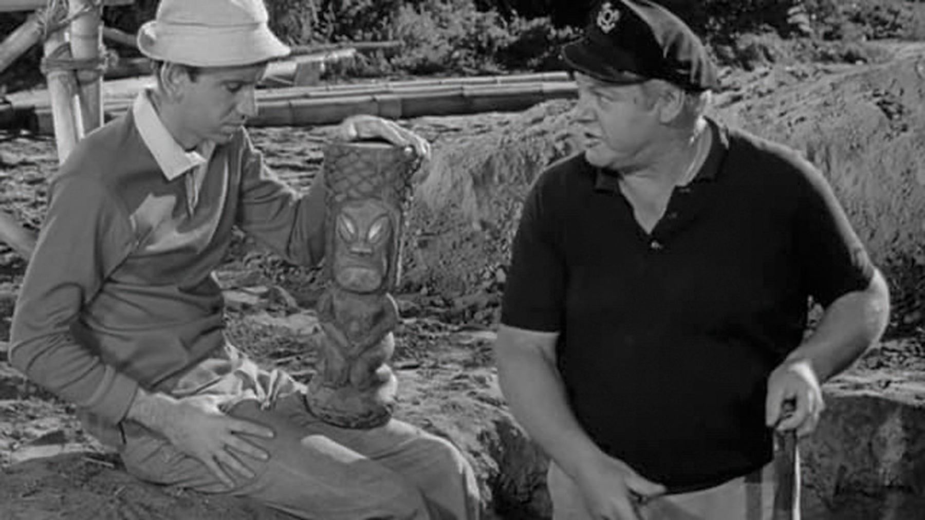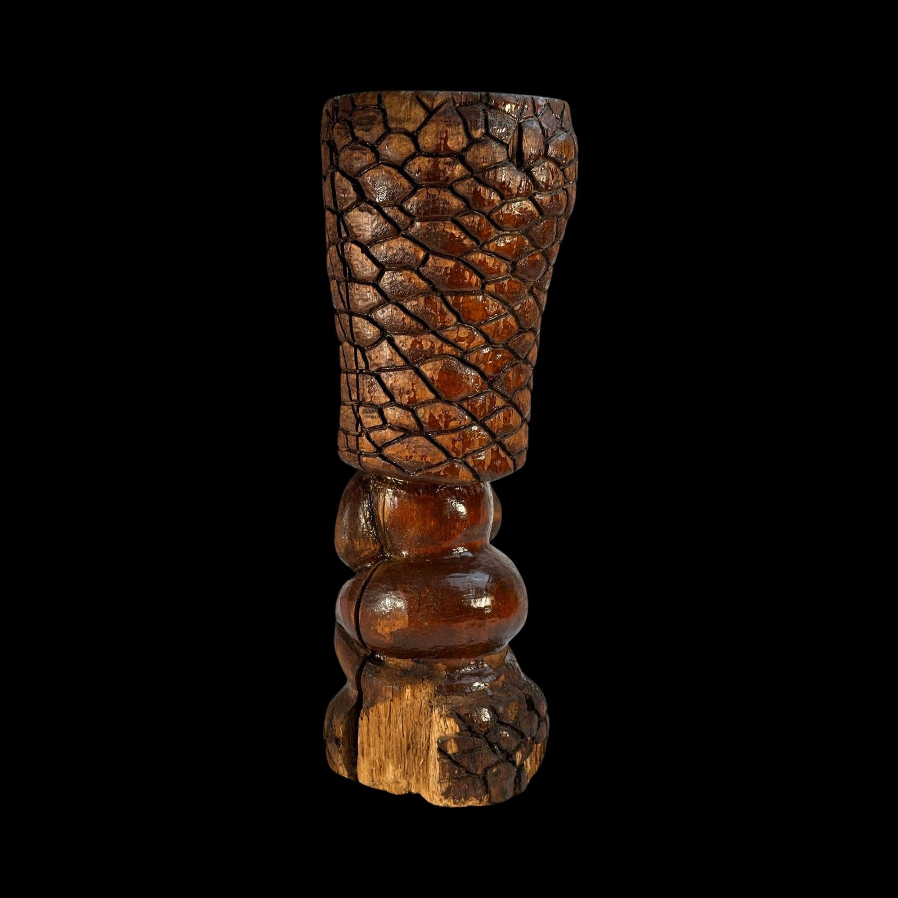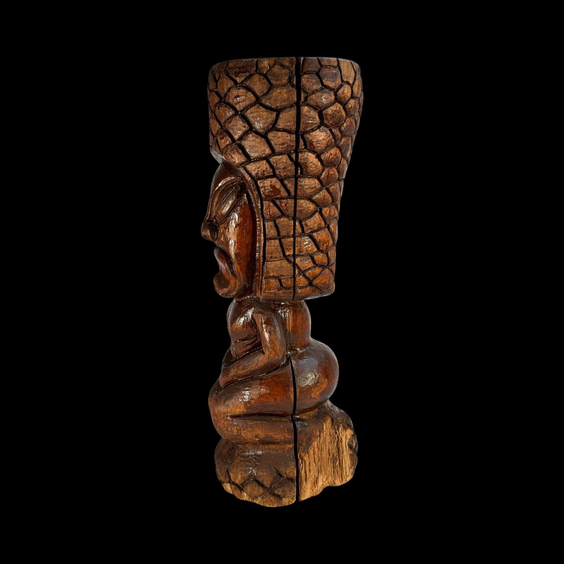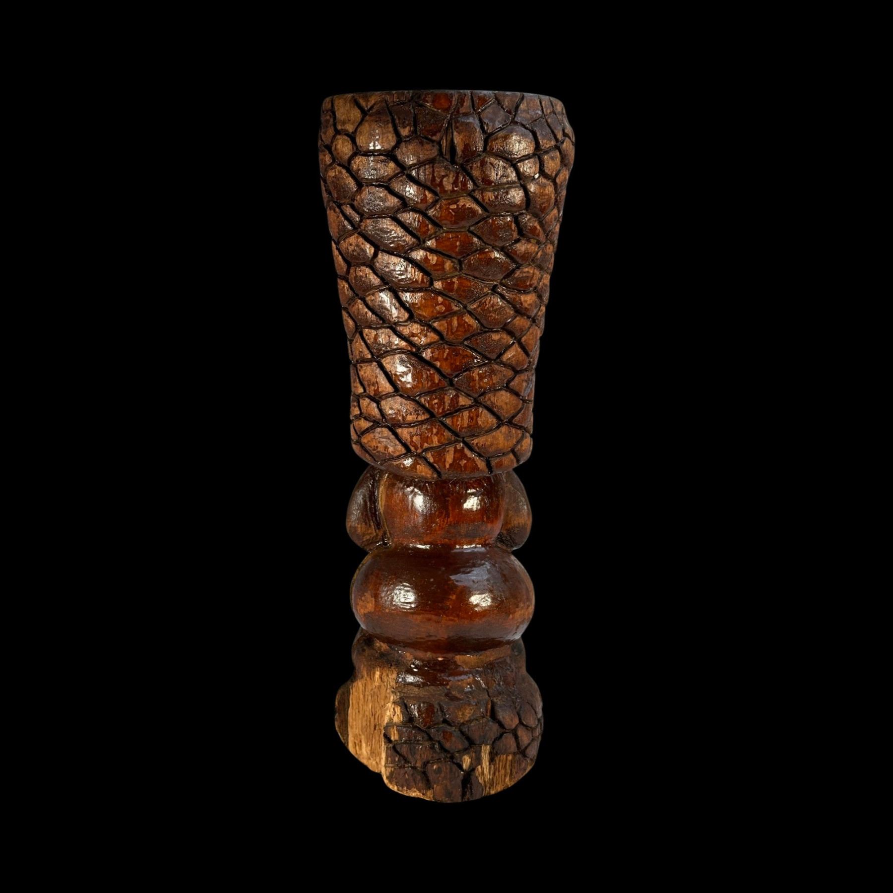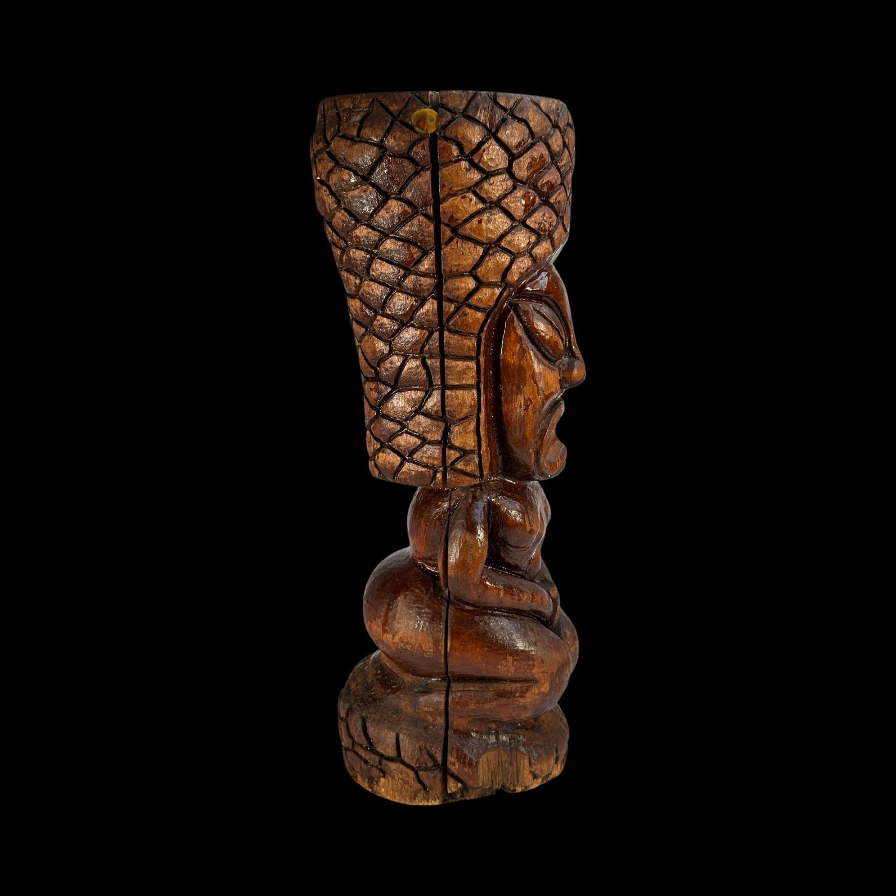 (1960s)* This STYLE Tiki appears in the TV series Gilligan™s Island in the episode Waiting for Watubi and also as a table lamp in a Mission Impossible episode. It was modelled after a Milan Guanko Tiki that stood outside the Miramar Hotels Tiki-Jo restaurant in Santa Monica. Guanko produced these in the 1960s and a similar carving to this was most probably acquired by the production prop department directly from Guanko. Small chunks missing from base. See online photos for turns. Overall VG+ with some typical chipping and wear to the main body of the figure and a small chunk of wood missing from the base. 7"dia x 19".