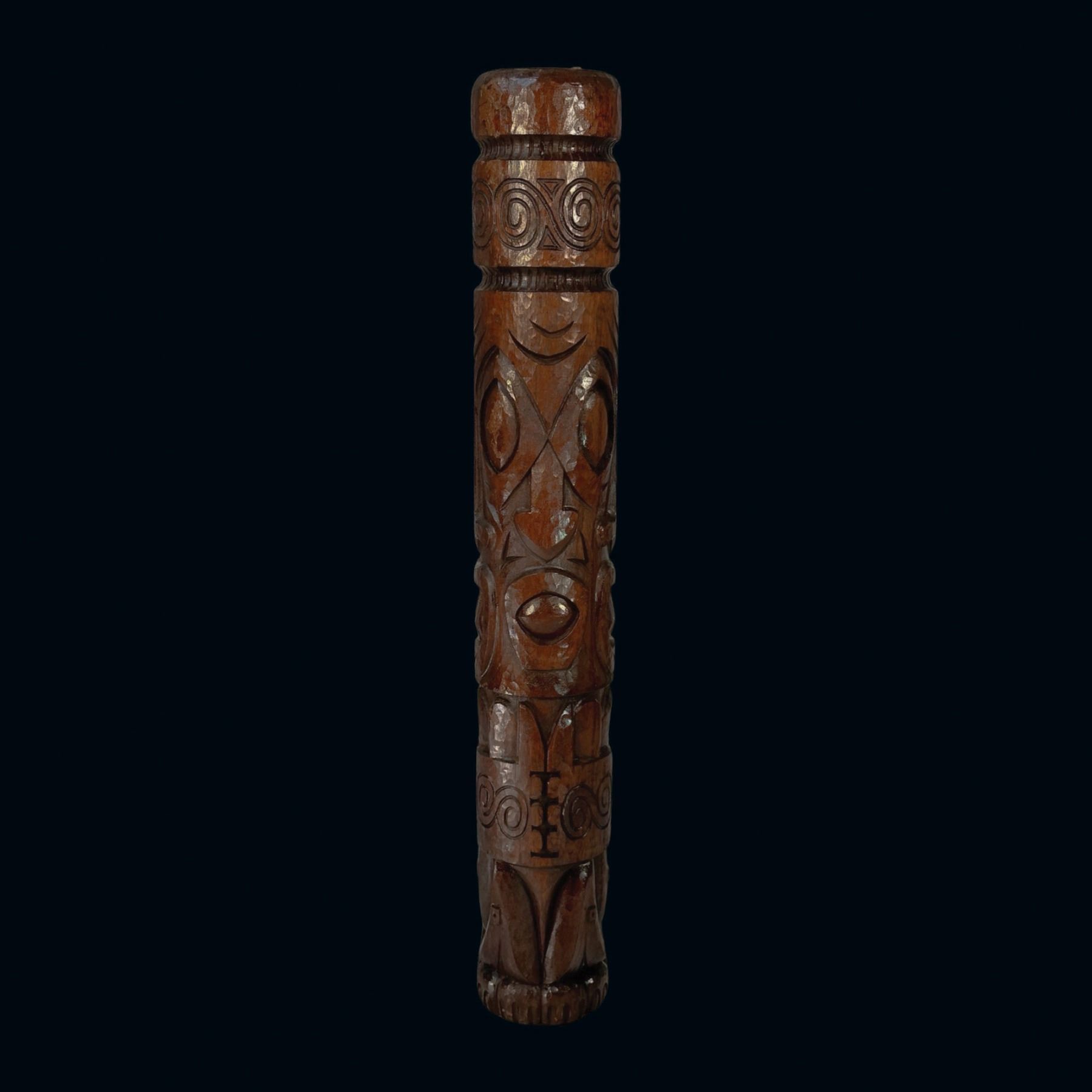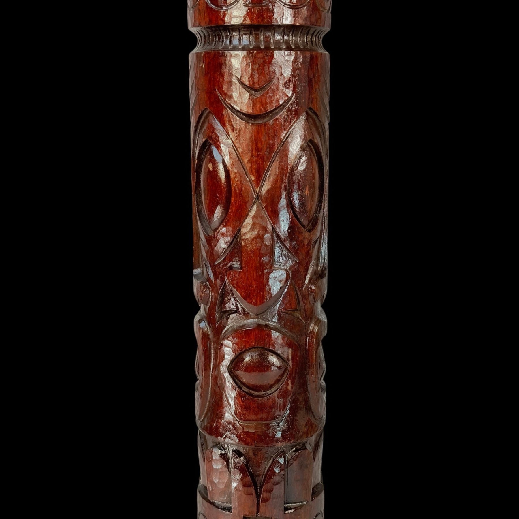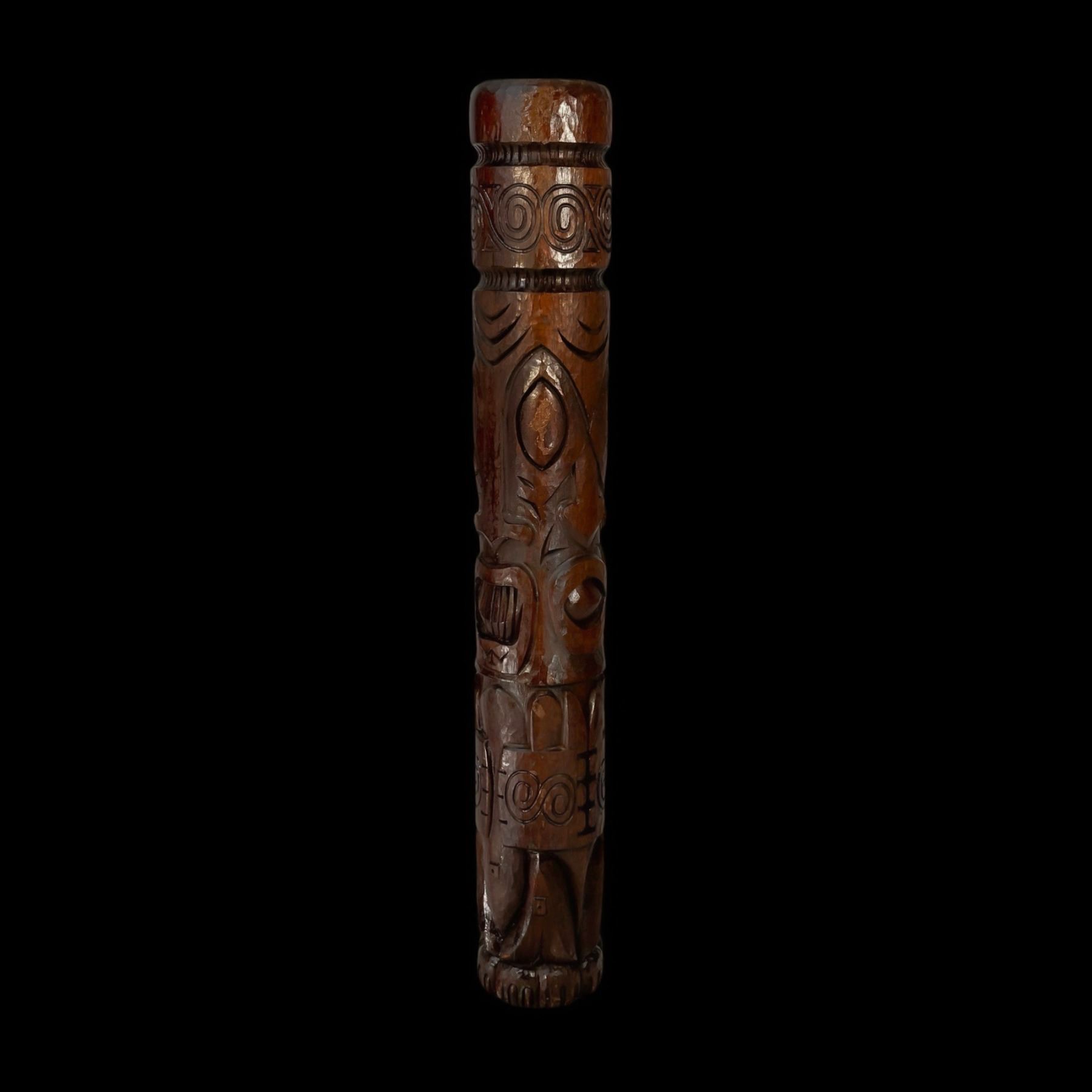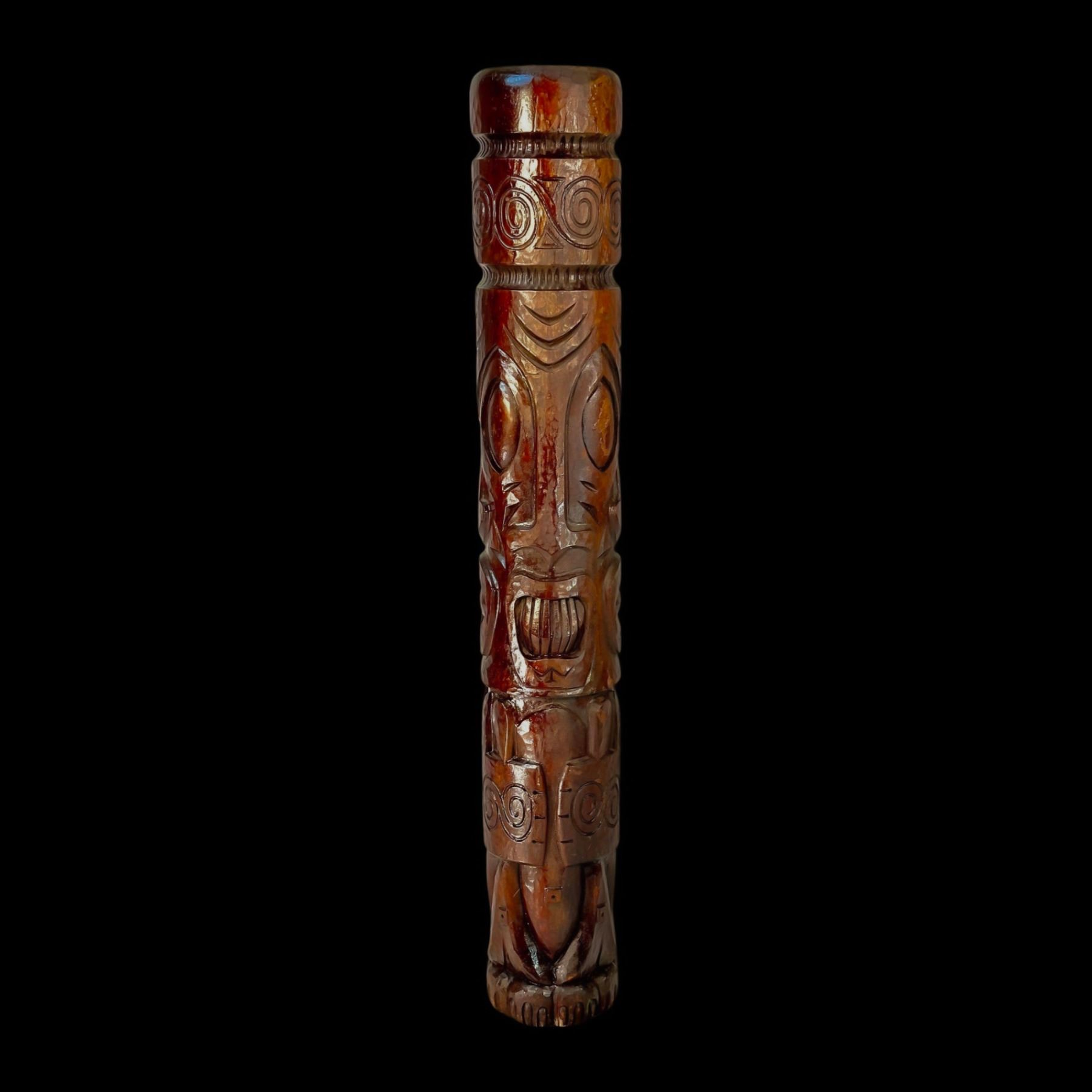 (1960s) The decor made for the flagship location on Marriott's KONA KAI chain in Philadelphia is perhaps one of THE most elaborate Tiki temples of the Poly-Pop era. George Nakashima working with Armet & Davis commercial architecture firm left no stone unturned. Every tiki and incidental carving was drawn out on blueprints and executed by Cass Carving and Oceanic Arts. This carving is a stunner and is very rare in that this was the only location where these specific designs were used. VG+ with typical wear. 7.5"dia x 50".