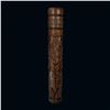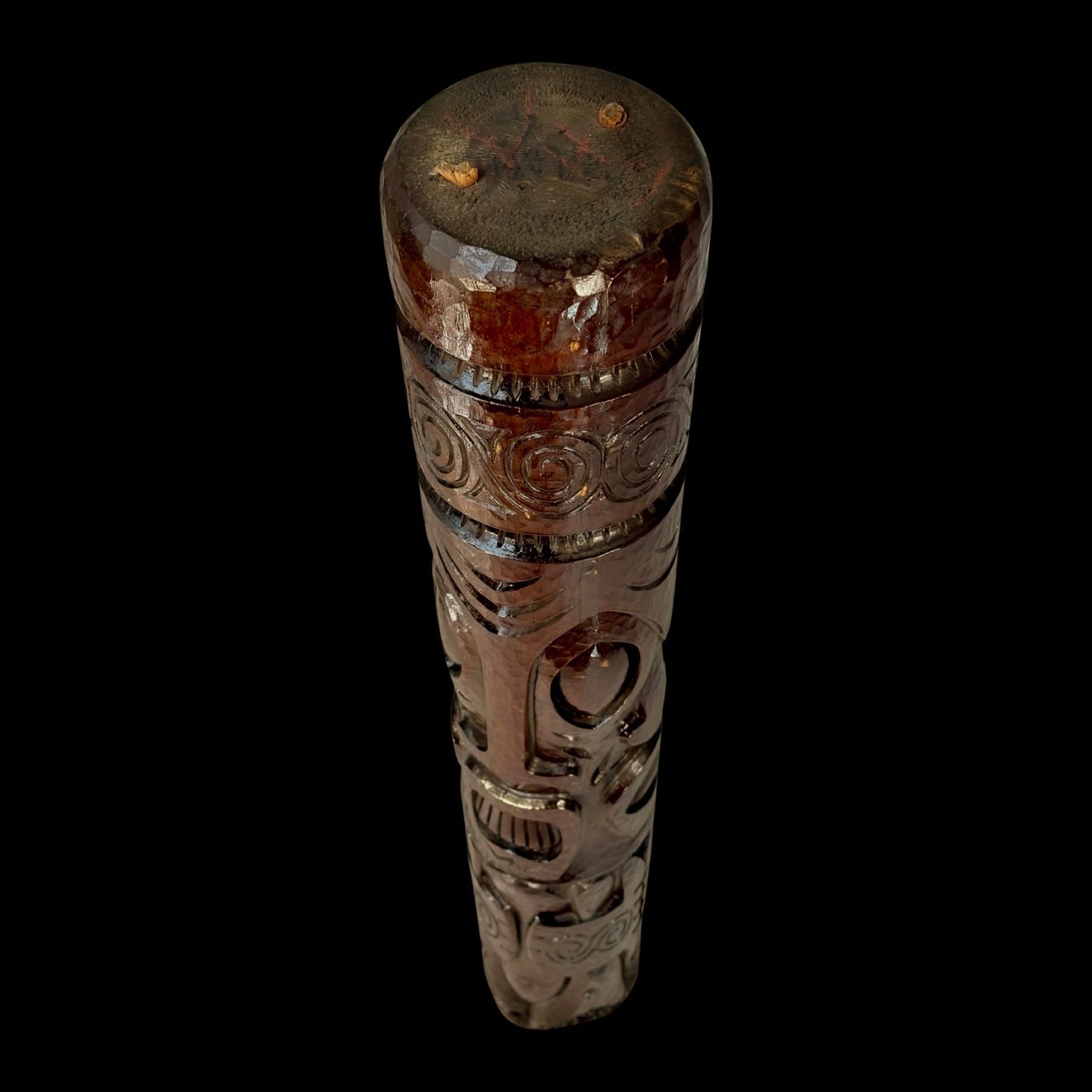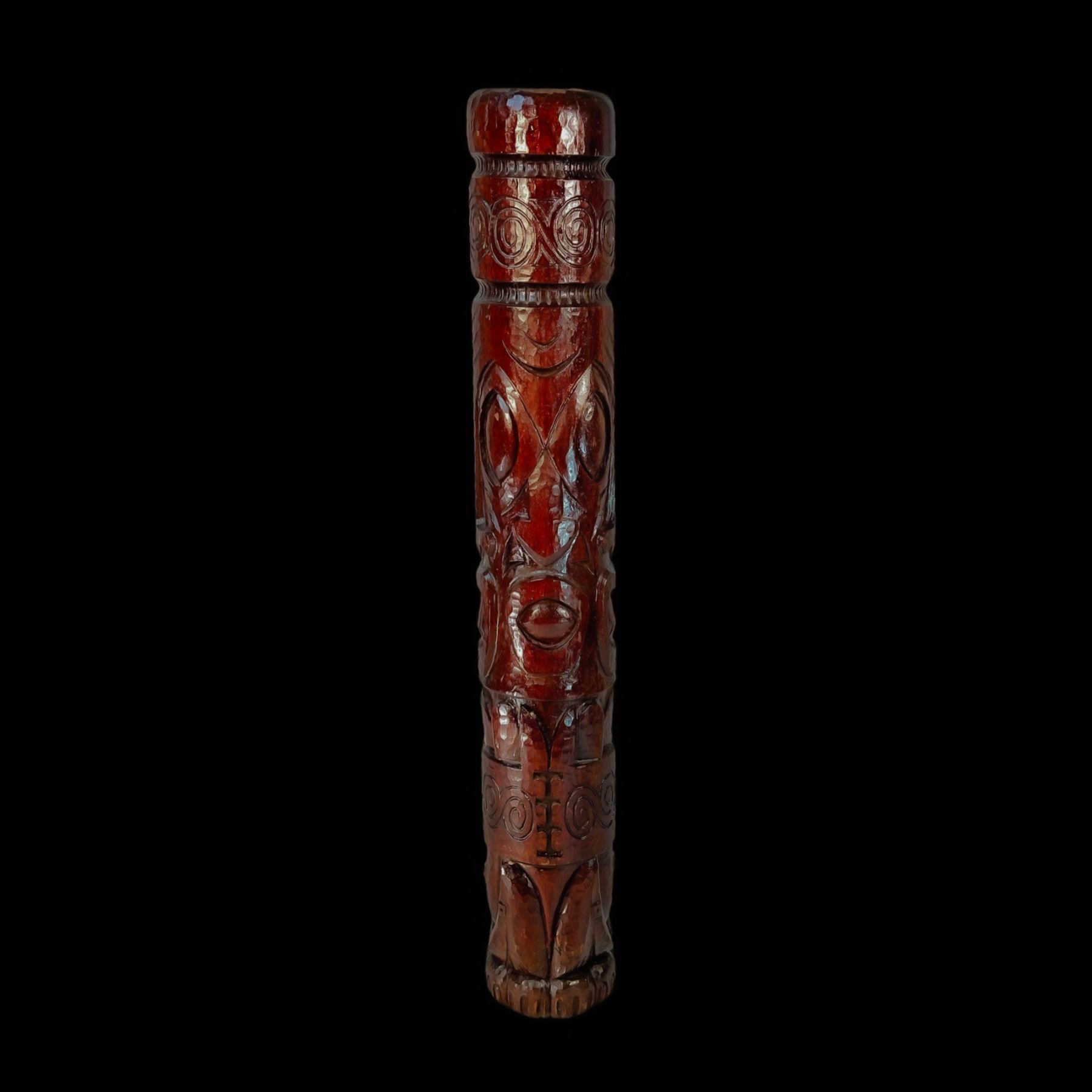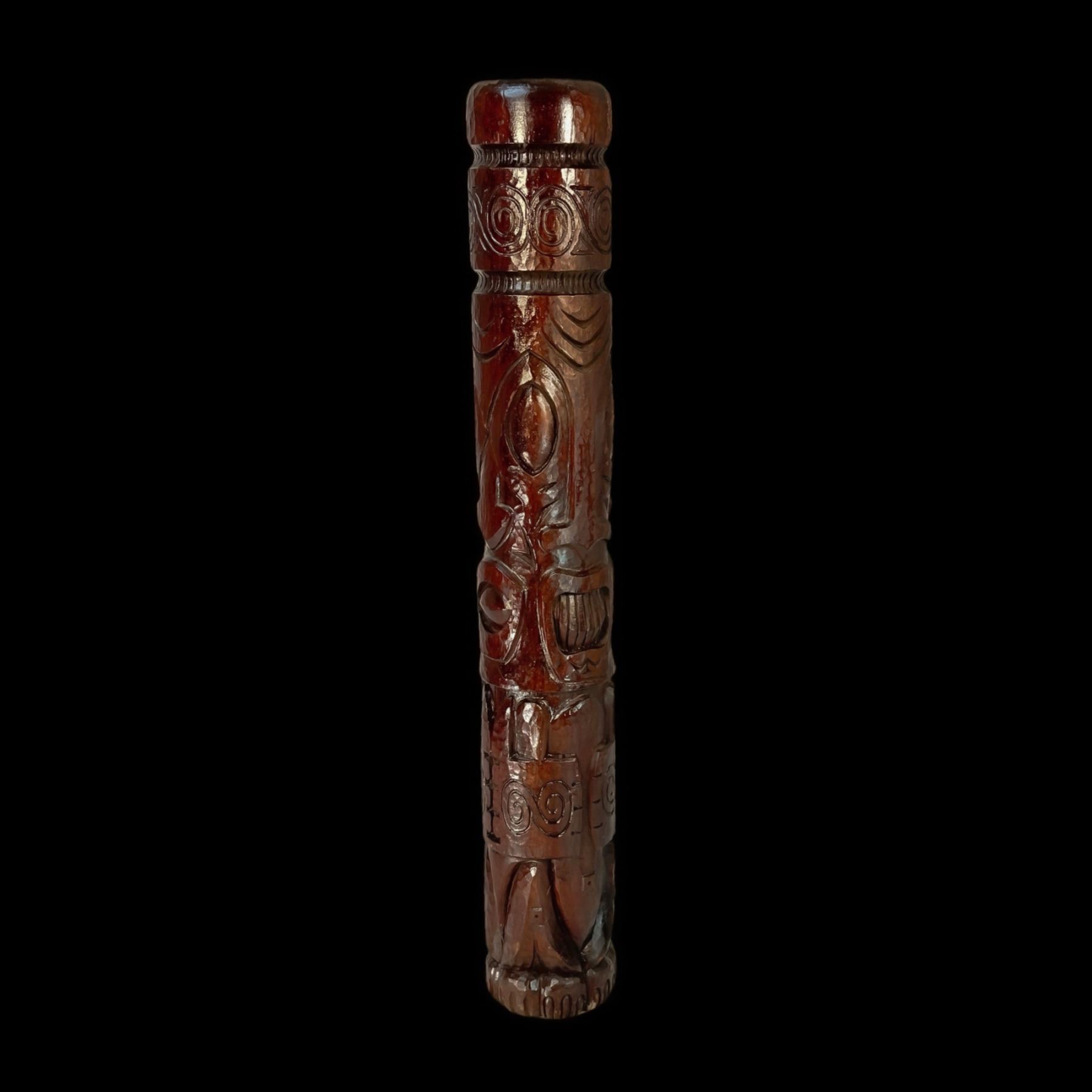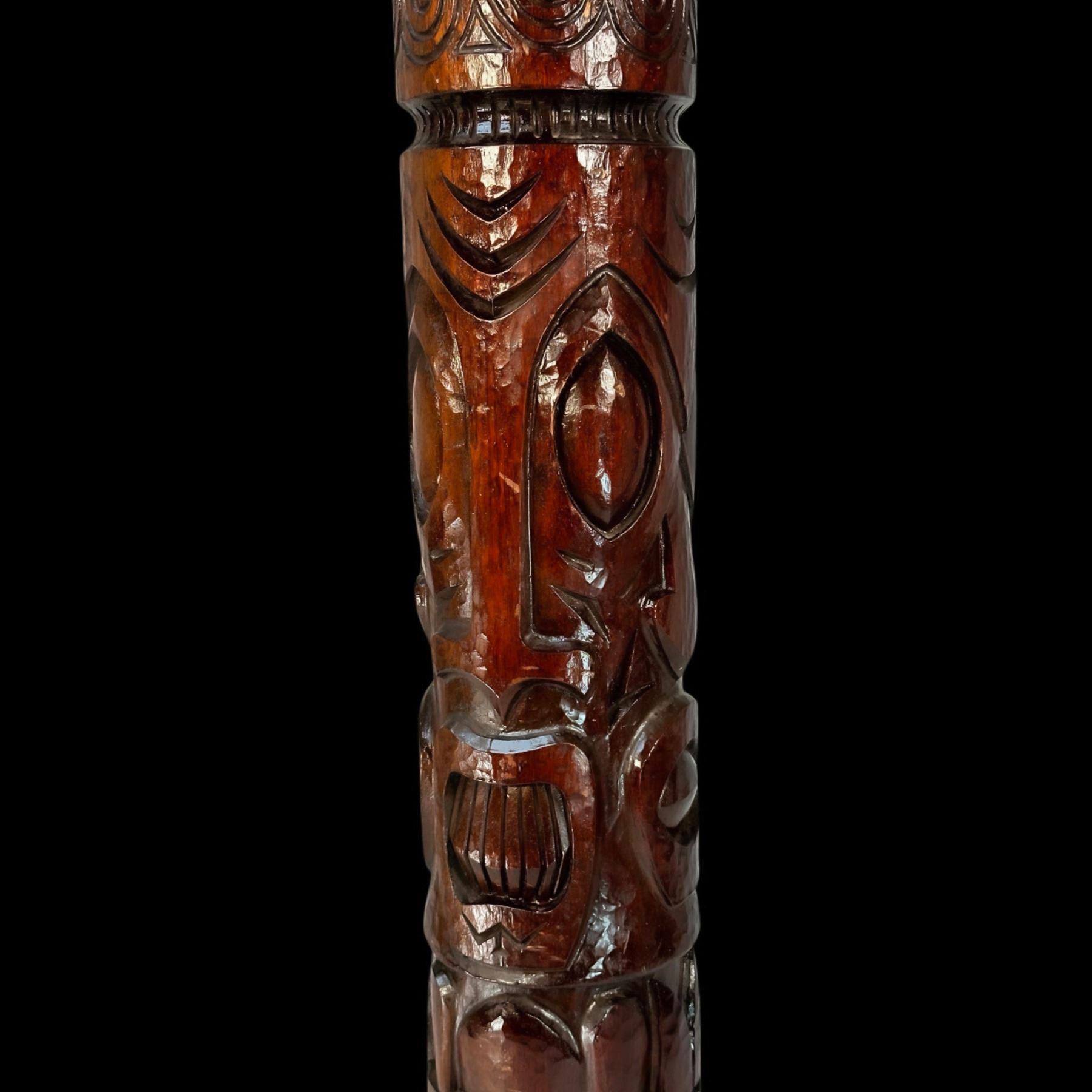 (1960s) The decor made for the flagship location on Marriott's KONA KAI chain in Philadelphia is perhaps one of THE most elaborate Tiki temples of the Poly-Pop era. George Nakashima working with Armet & Davis commercial architecture firm left no stone unturned. Every tiki and incidental carving was drawn out on blueprints and executed by Cass Carving and Oceanic Arts. This carving is a stunner and is very rare in that this was the only location where these specific designs were used. VG+ with typical wear. 7.5"dia x 50".