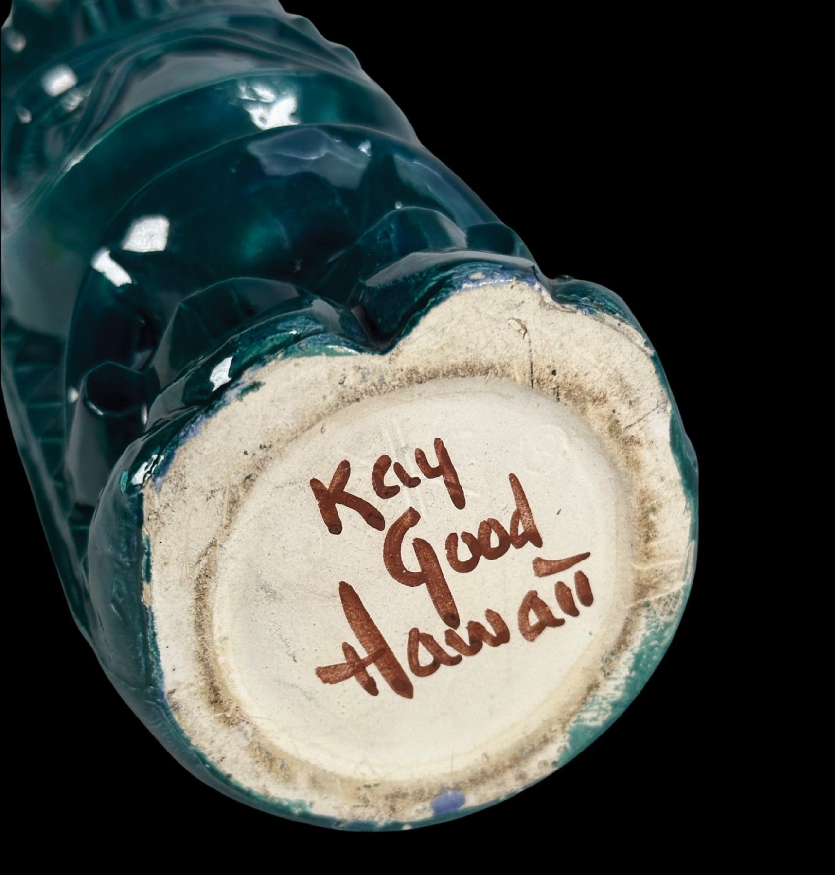(1960s)* Fired ceramic bottle. Signed under base KAY GOOD HAWAII. VG+ with some chipping to overglaze on bottom. 3.75"dia x 13".