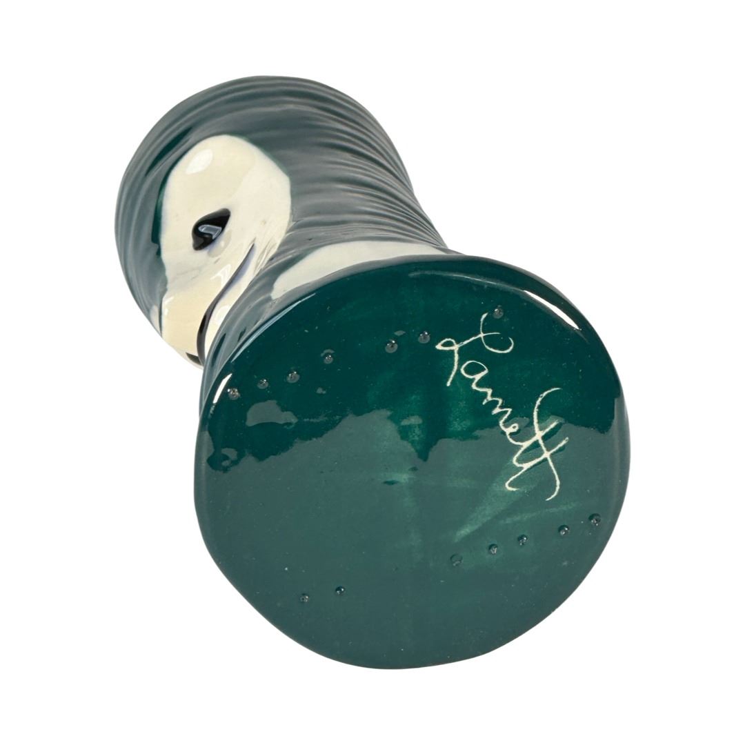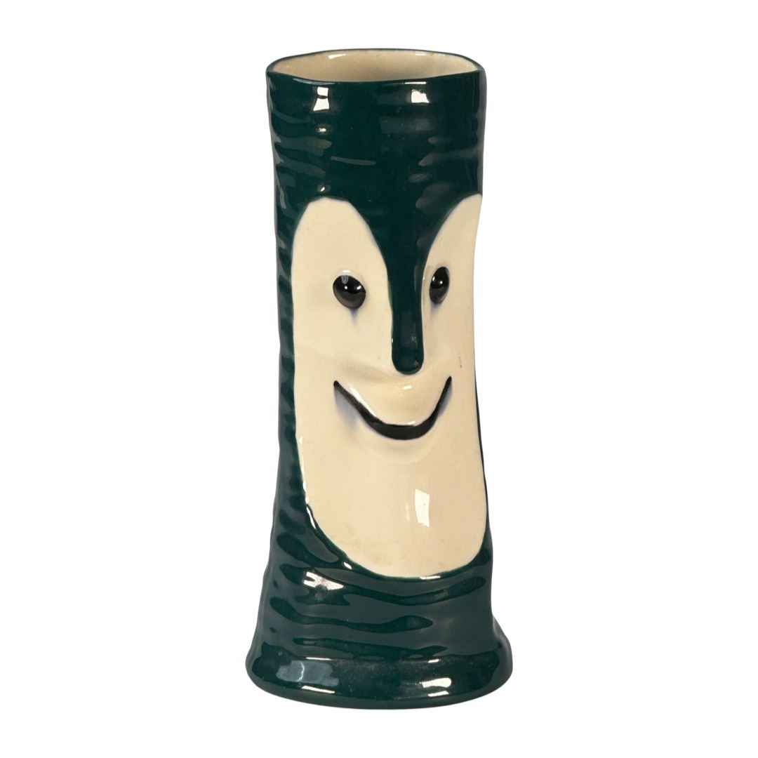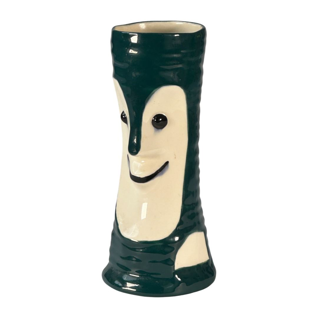(1960s) A very well executed home or hobbyist ceramic casting of a classic "Tiki Bob" mug. Nice details and rich forest green glaze. Signed on base LAMETT. 7.25"x3.25". VG+.