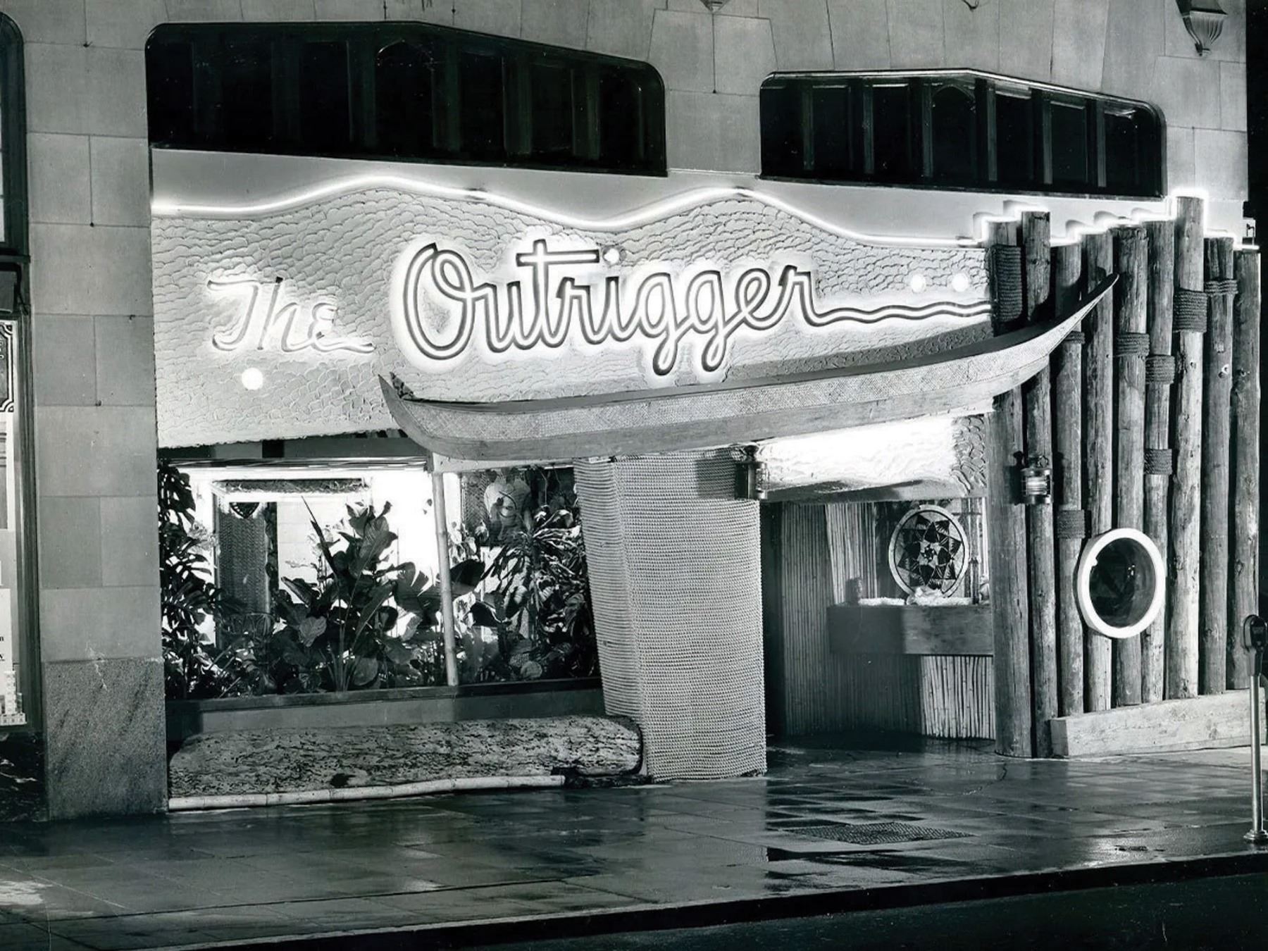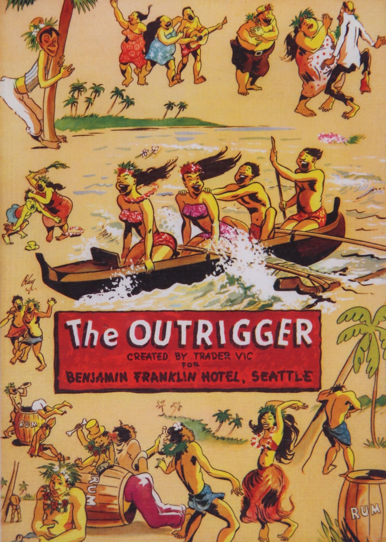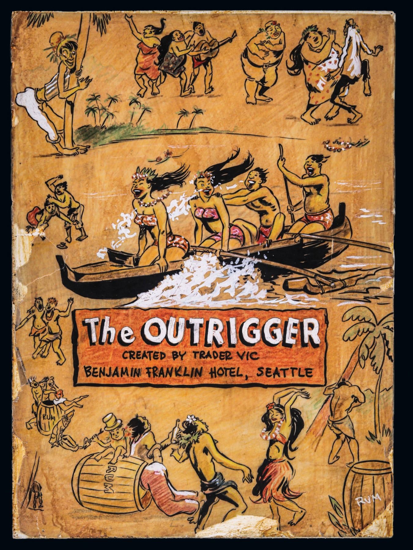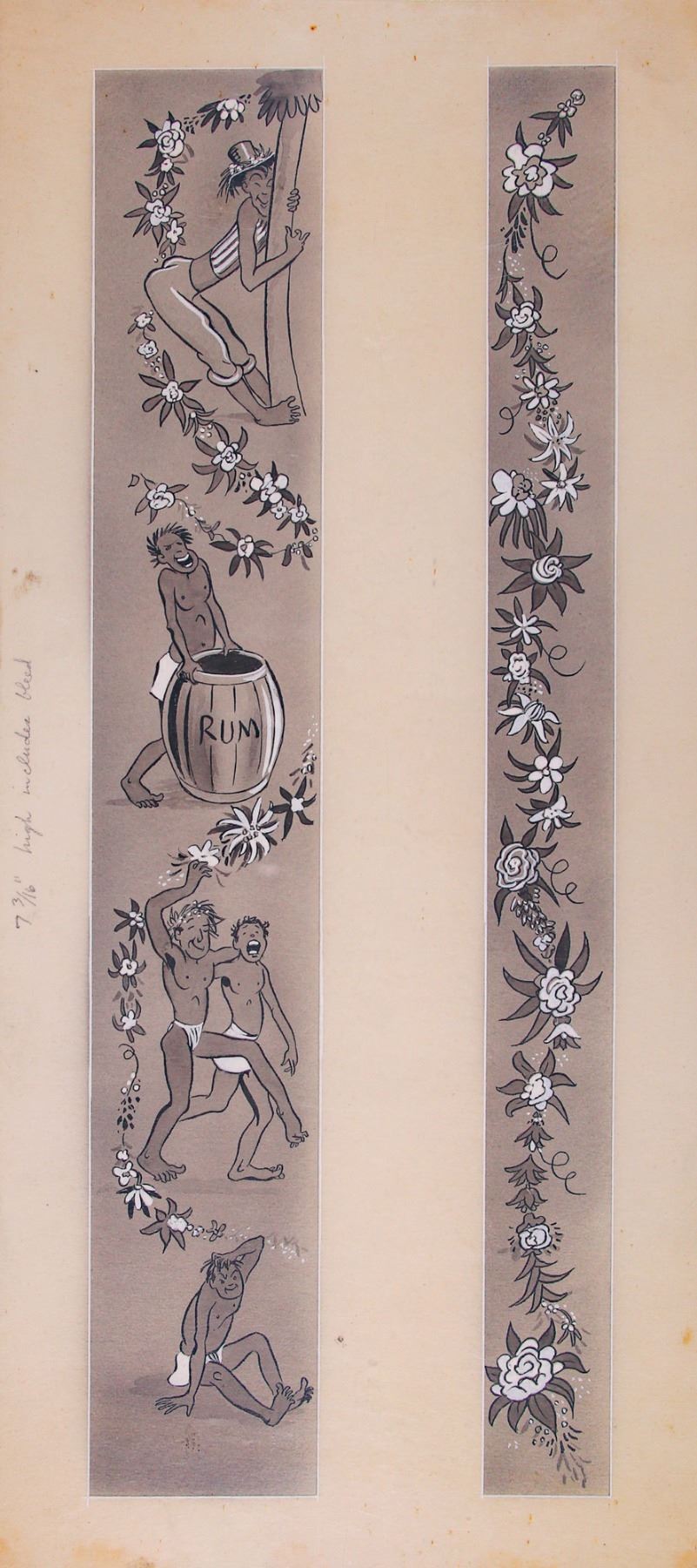 (1948) Incredible opportunity to own historic, original artwork from Trader Vic's! Many will recognize this lively art style used extensively by Trader Vic's in the 1940s and 50s. Vic Bergeron met French artist and cartoonist, Guy Huze in New Zealand in the late 1940s. Huze attended the Paris School of Fine Arts and soon after left his home country to travel the world. He ultimately setted in Australia and New Zealand. From that South Pacific base, he continued his travels extensively from Tahiti to Africa. Immediately taken with his European perspective of native lifestyle, Vic hired Huze to begin creating illustrations for his chain of restaurants and bars. Soon, Huze art became the signature style for Trader Vic's and it was used extensively in marketing and merchandise. Here is a fantastic cache of art created by Guy Huze for a menu cover and interior accents. The lot includes a comprehensive mock-up of the menu cover for The Outrigger (Trader Vic's) in Seattle, Washington at the Benjamin Franklin Hotel. This art is very close to the final art, accomplished in gouache on onionskin and mounted on cardstock. The interior border artwork is also in gouache on illustration board. A mailer promo copy of the final menu is included in the lot. This art was used for other location menus of The Outrigger. Art such as this is a true treasure and very difficult to find. Overall VG+ woth toning and chipping to the onionskin. 8.5"x11.75" closed cover art, 15"x6.75" & 13.5"x5" border art, 4"x7" & 4.75"x7.5" cards.