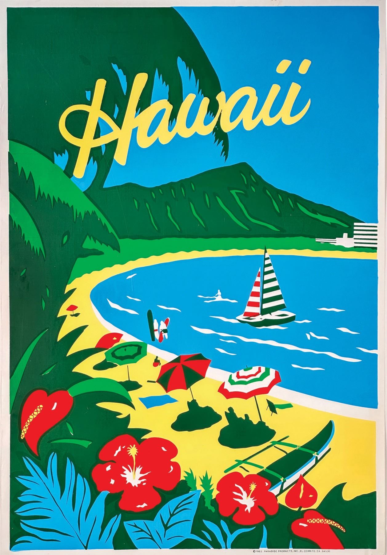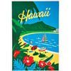 (1983) Same as the previous lot, this time featuring the beach at Waikiki with Diamondhead prominent in the distance. VG+ with light wear and edge creasing in margins. 22"x32".