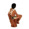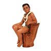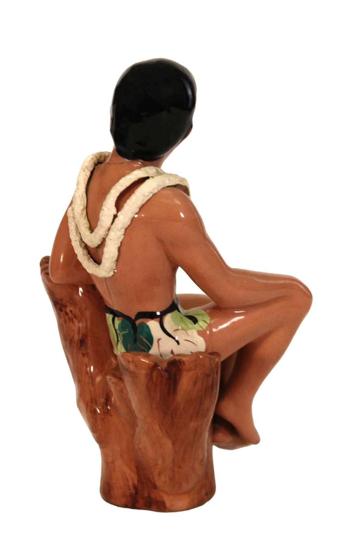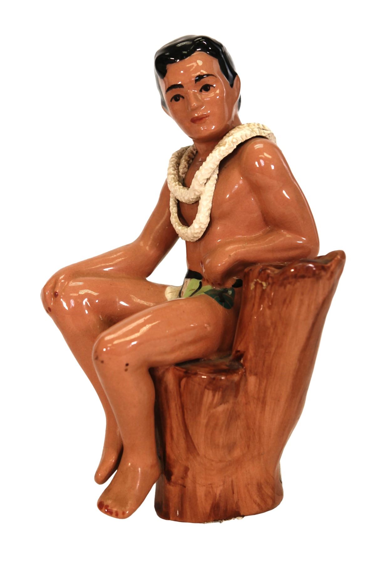 (1950s) Ceramic figurine of a Hawaiian male resting in a cut tree wearing a lei and loincloth. Detailed red polished finger and toenails. Glazed ceramic material. 9.5"x6"x5.5". VG with repair to neck.