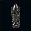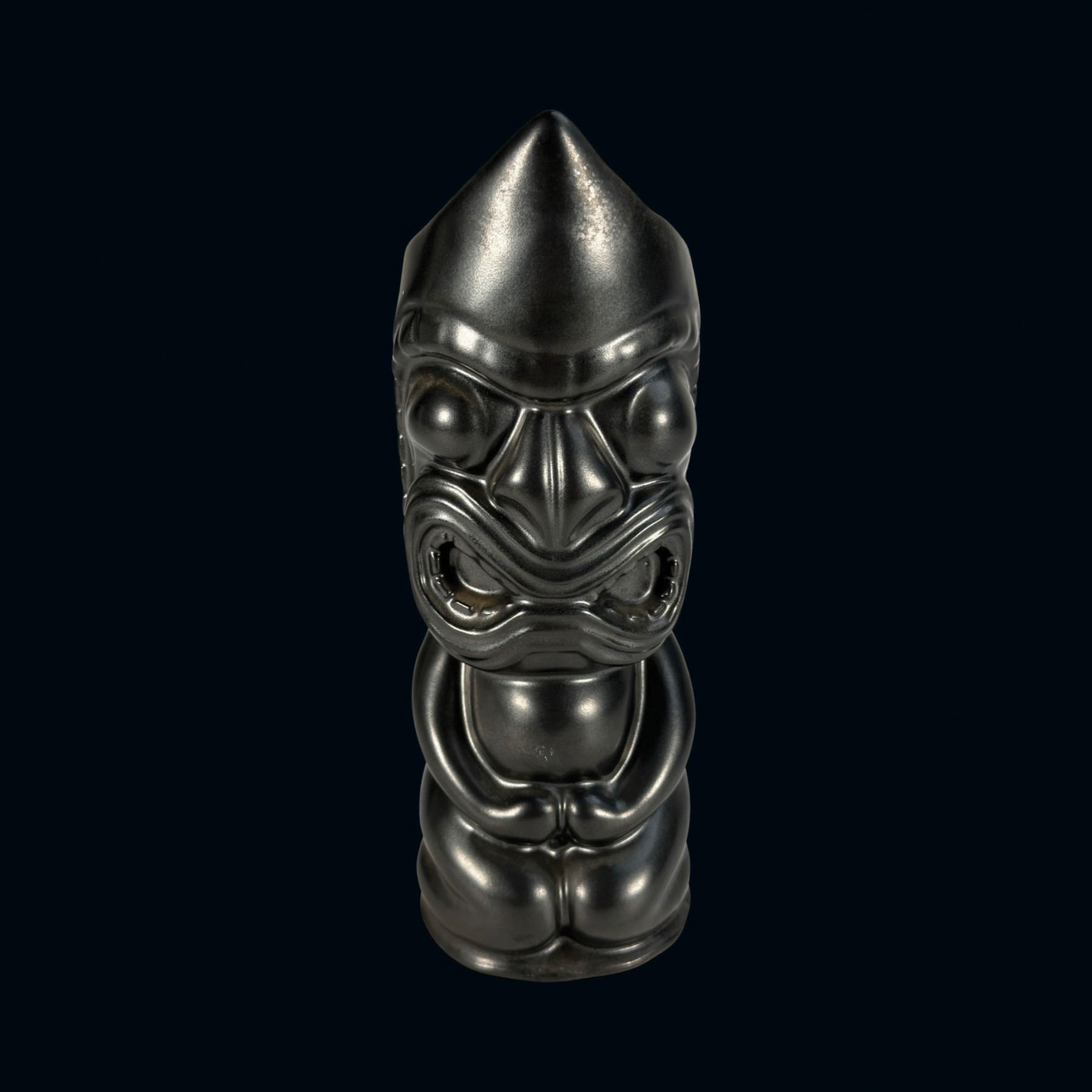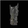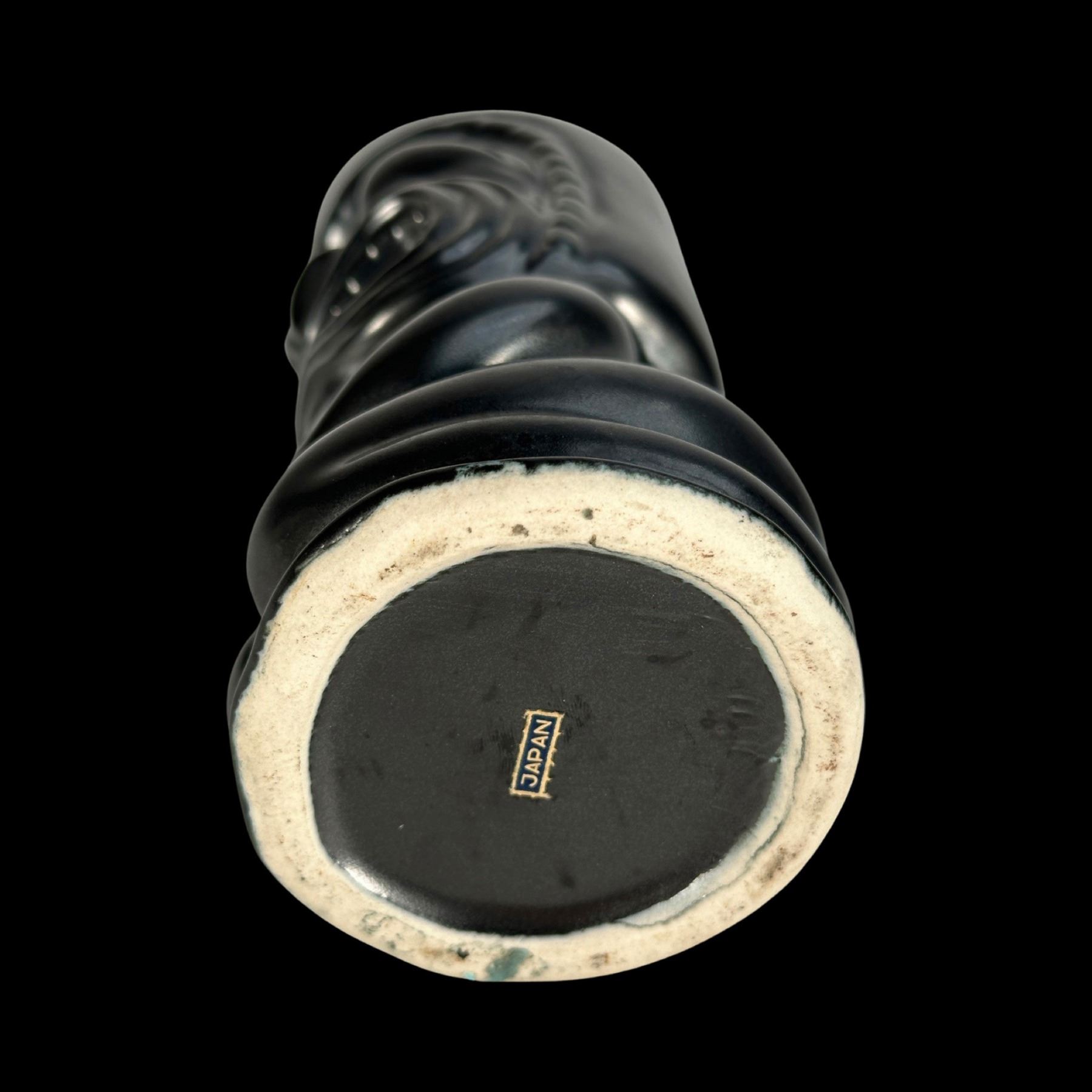 (1960s)* A very striking satin black glaze mug by OMC. These were a catalog item but were first used as the second version of the famous "Husband Killer" mug made by Stella Bodey of Spurlin Ceramics for The Islander of Los Angeles, California. VG+ with typical wear and a hairline stress crack on the back. 3"dia x 8.75".