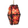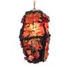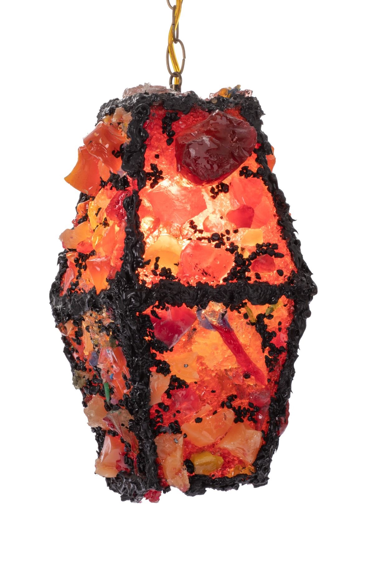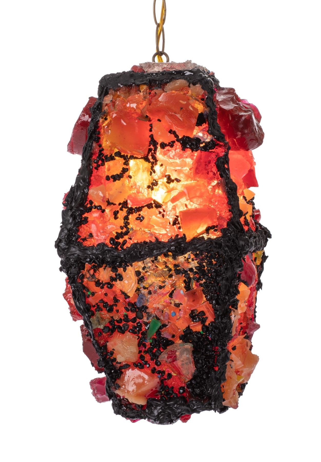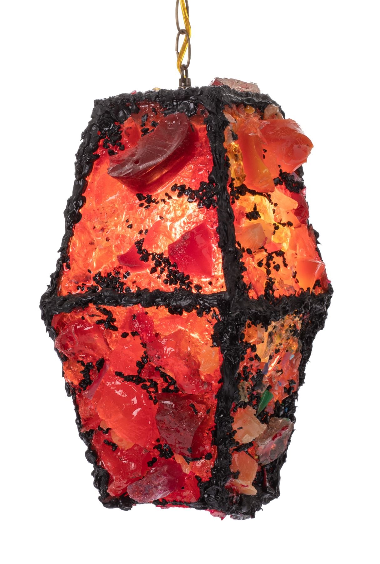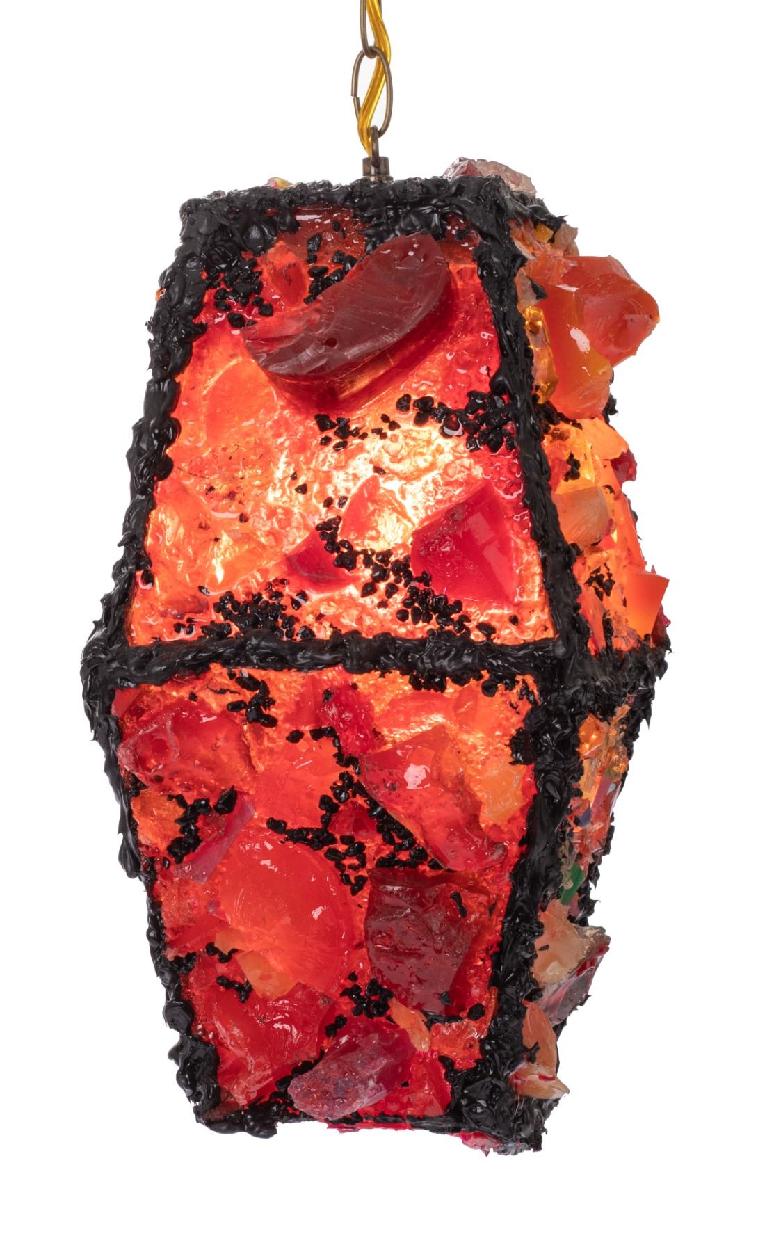 (2023) Highly original all-resin hanging lamp features large chunks of red and orange resin, surrounded by multiple colored smaller pieces and outlined in streams of black. Fully functional with electric cord and hanging chain. 16.5"x8.5"x8.5". VG+.