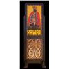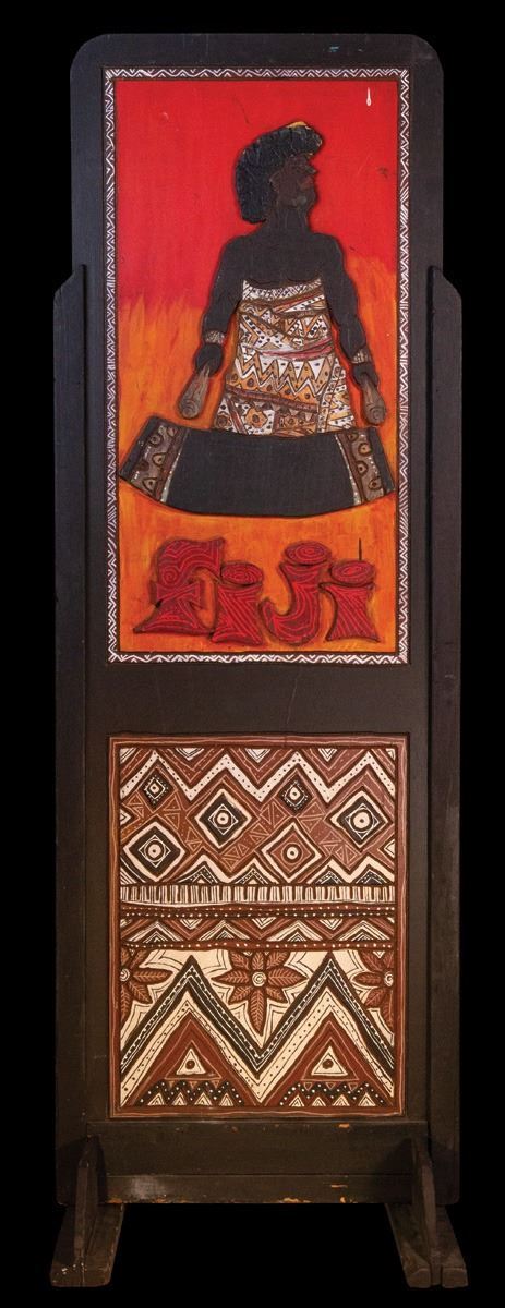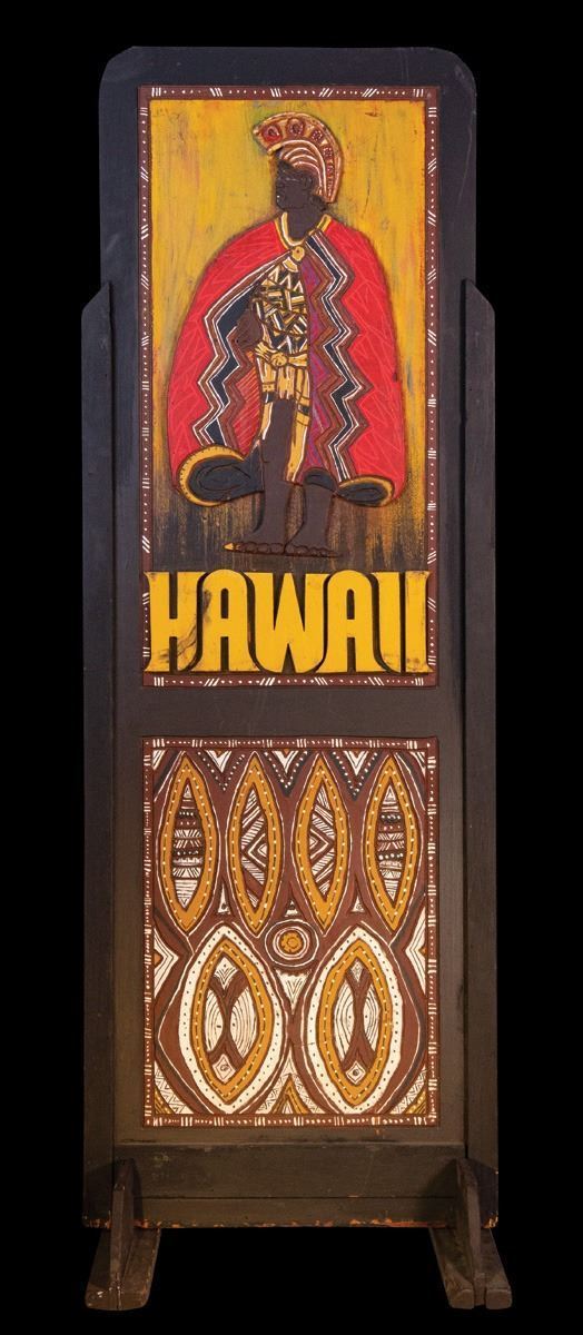 (1970s) A gorgeous example of LeRoy Schmaltz's "carved paintings." The next three lots are of these decorative themed panels with one or two different national, tribal or thematic subjects on each side. Each one comes with a custom wedge stand.74.5"x26"VG+ with typical wear from use