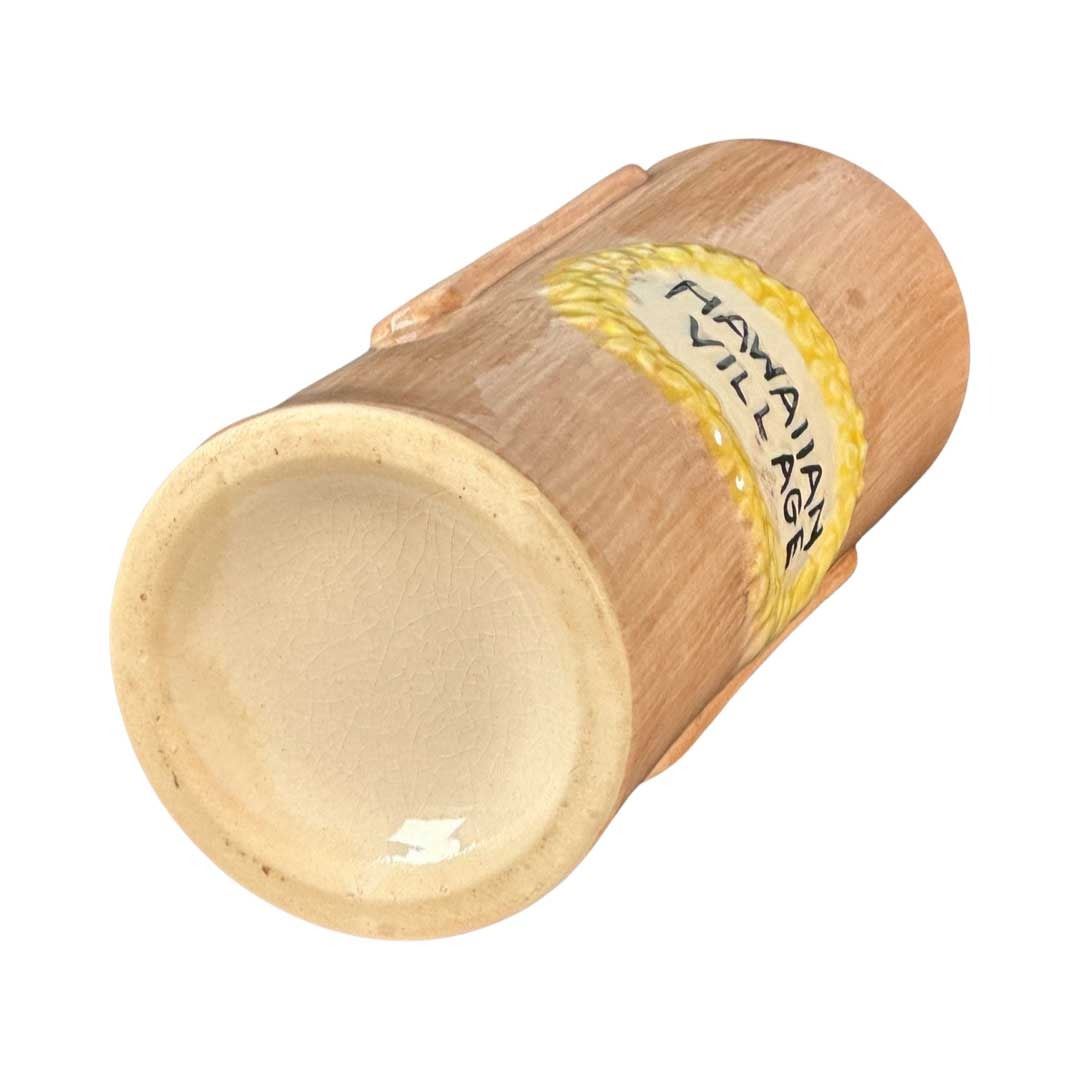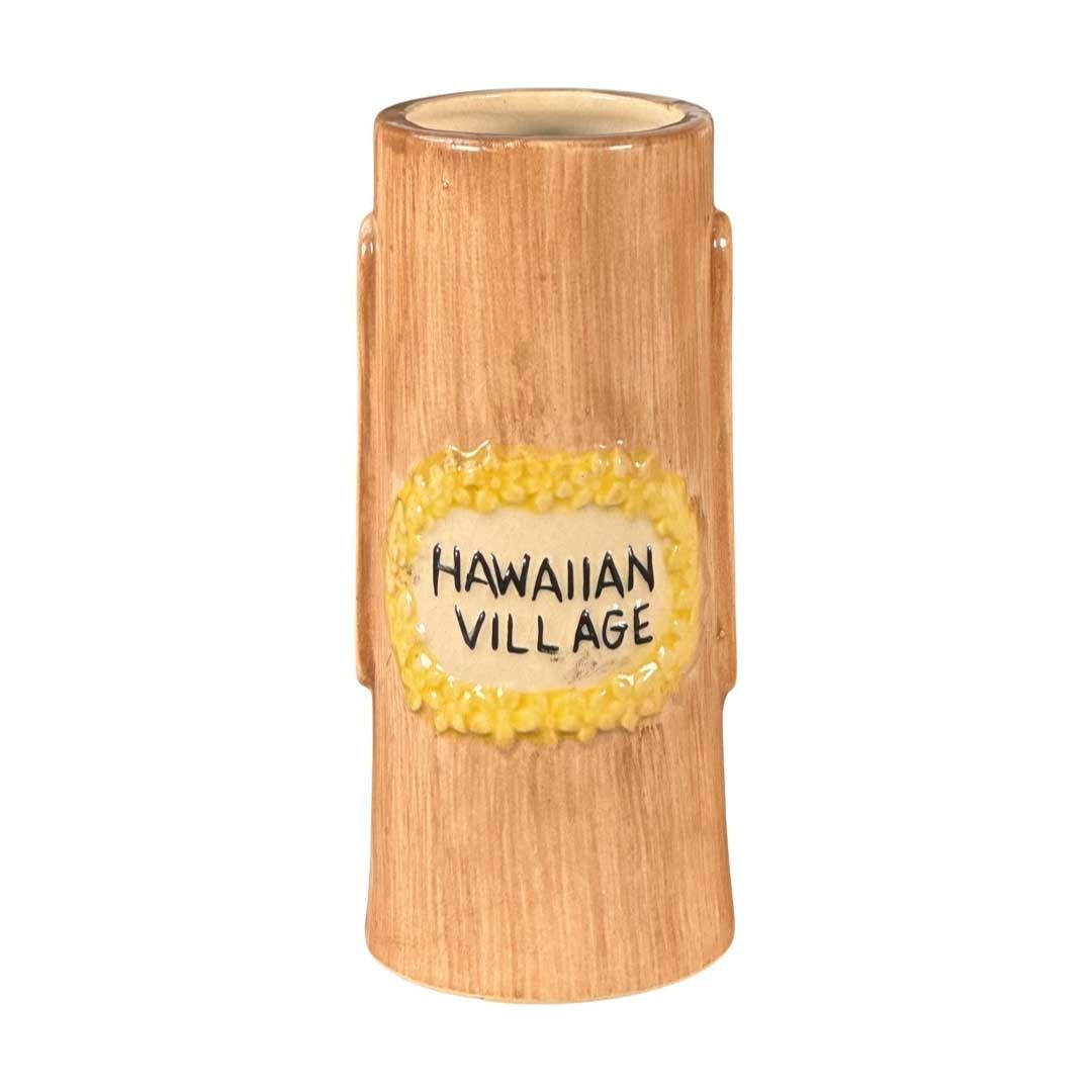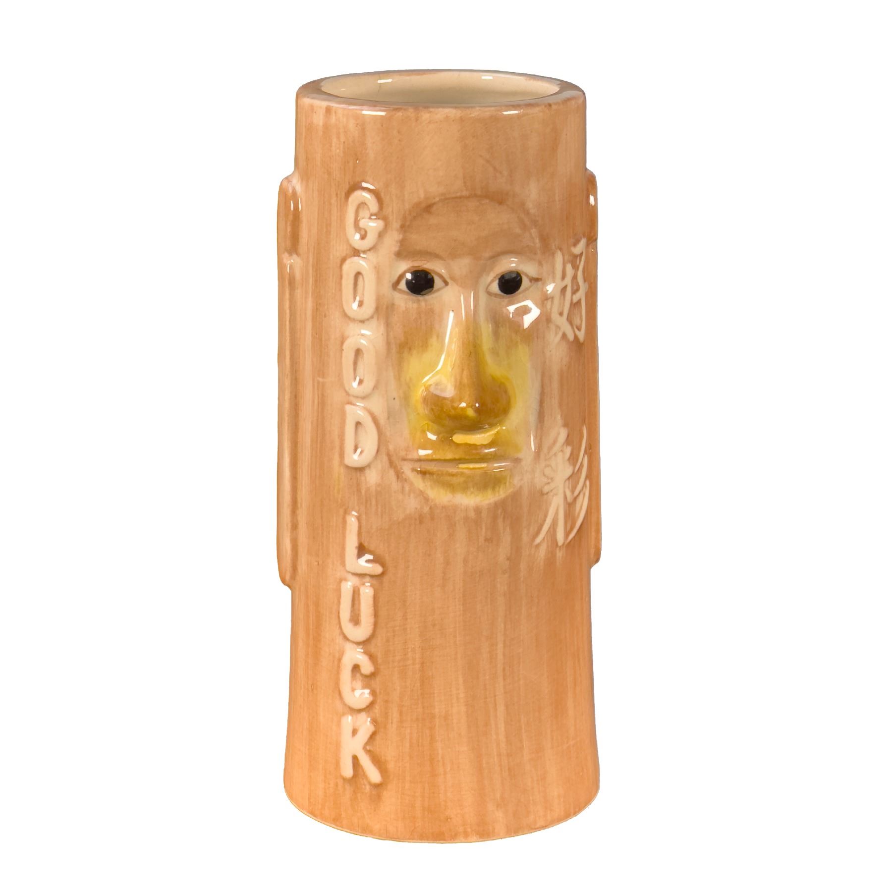 (1960s) Rare and unusual OMC Tiki mug for Hawaiian Village. A combo Polynesian/Asian theme with Moai and Hanzi-Chinese symbols for GOOD LUCK! 6"x2.75". VG with light crazing from age.