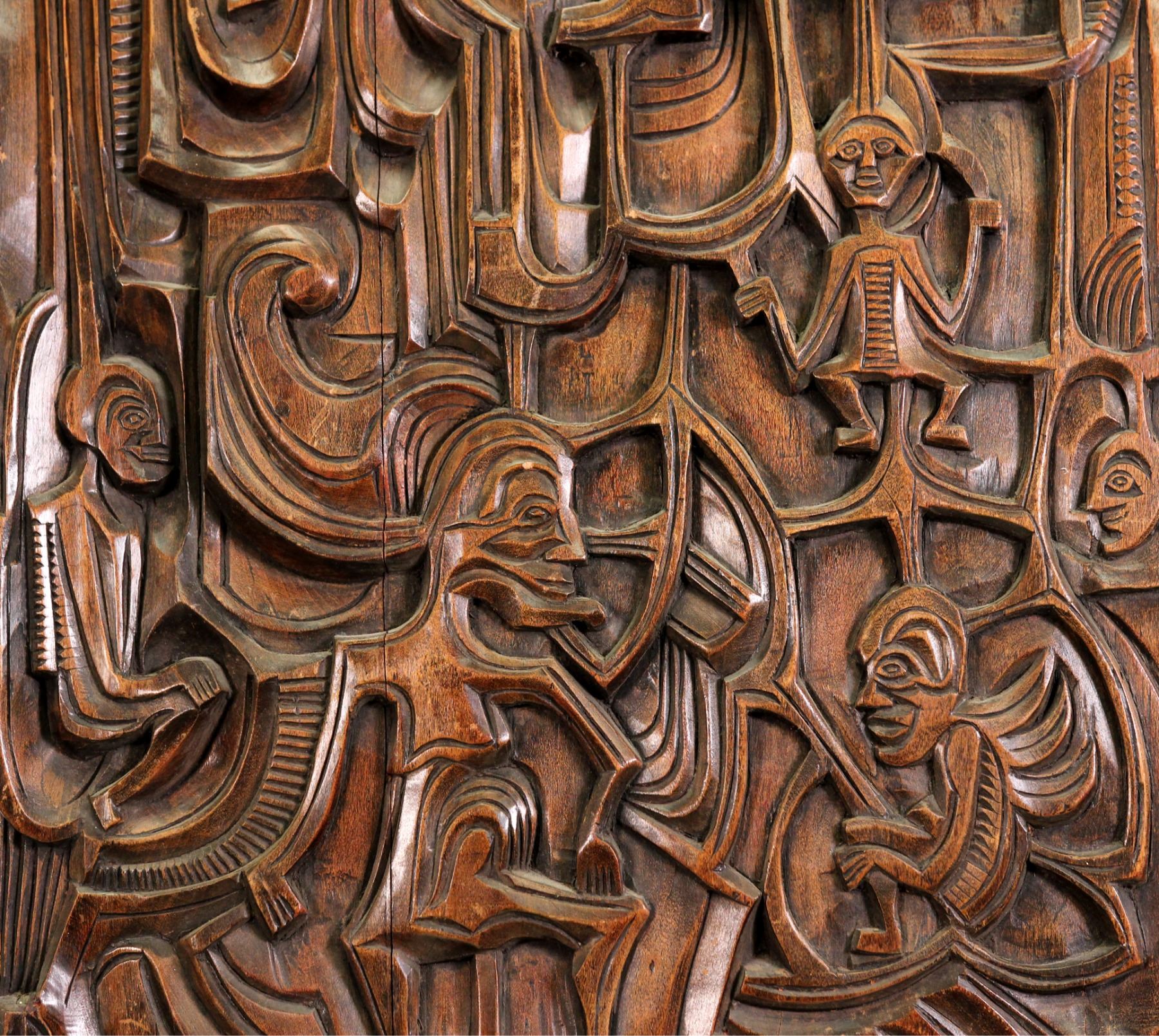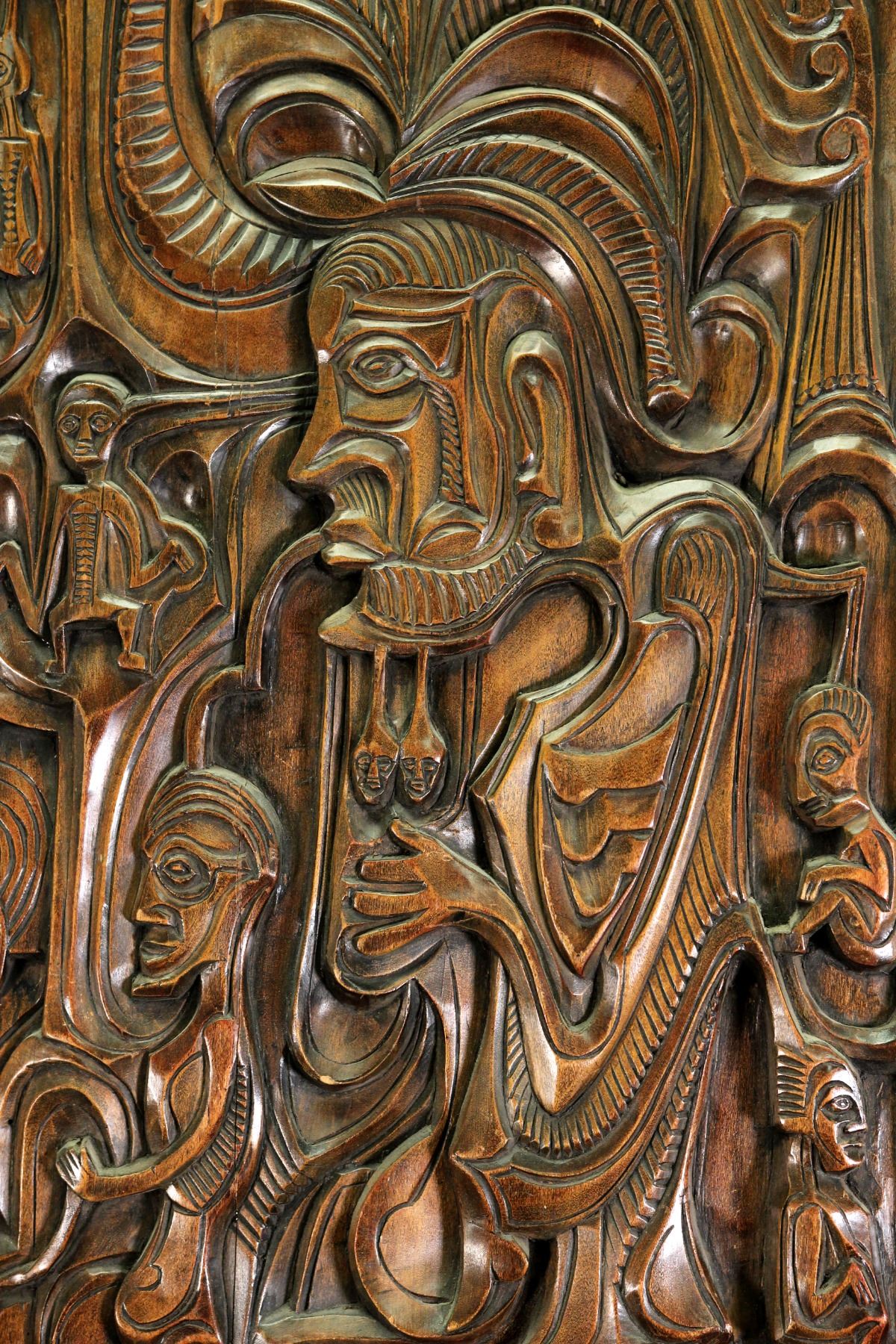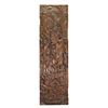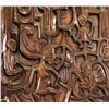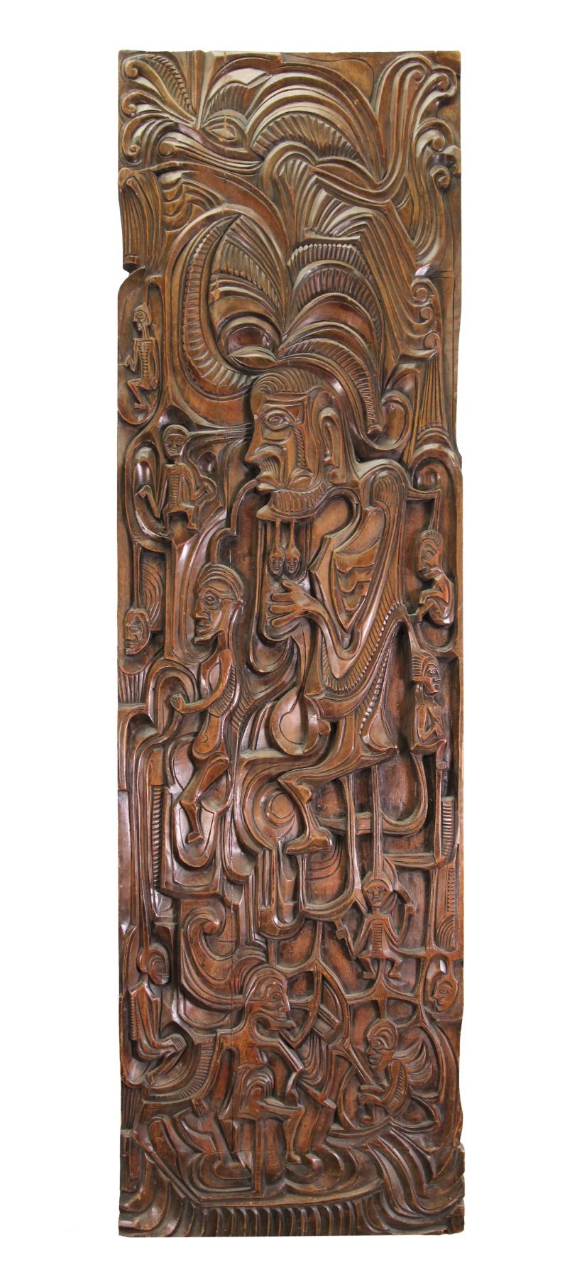 (1960s) Exquisite large hand carved, likely rosewood wood panel features an intricate design on a feathered headdress and tattooed chieftain figure surrounded by smaller Tiki idols. Of Oceanic and or South Seas origin. 48"x 14.5". VG+.