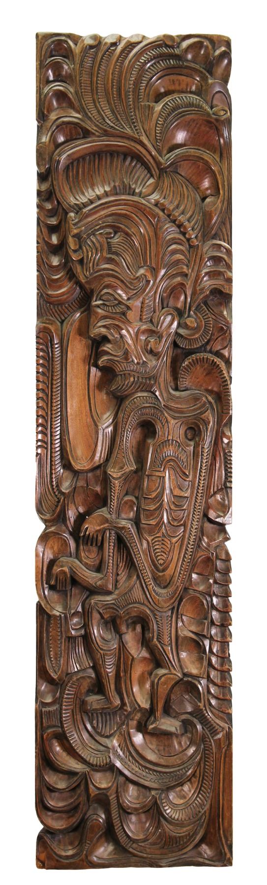 (1960s) Astonishingly detailed hand carved, likely rosewood storyboard panel. Of Oceanic and or South Seas origin. Features a primary tattooed Tiki or figural chieftain figure adorned with an elaborate feathered headdress. The depth and detail of the carving is first rate. With proper lighting, a fine accent piece to any bar decor. 39.5"x9.5". VG+ with minor wear.