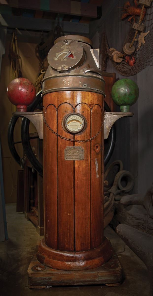 (1930s) A brass and oak ships binnacle manufactured by Henry Browne & Son, Station Works, Barking, Essex. Brass plate reads COMPASS No. 3667 N and the manufacturer's tag reads TYPE 88991/B. Intact with brass hood and original Sestrel list gauge. The compass itself appears to be a replacement, manufacturer's mark reads KELVIN & HUGHES, Ltd. A nice decor piece of the type seen on display at Trader Vic's and higher end establishments. Features interior compass lamp.57"x32"x19".VG+ with typical wear from use.