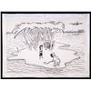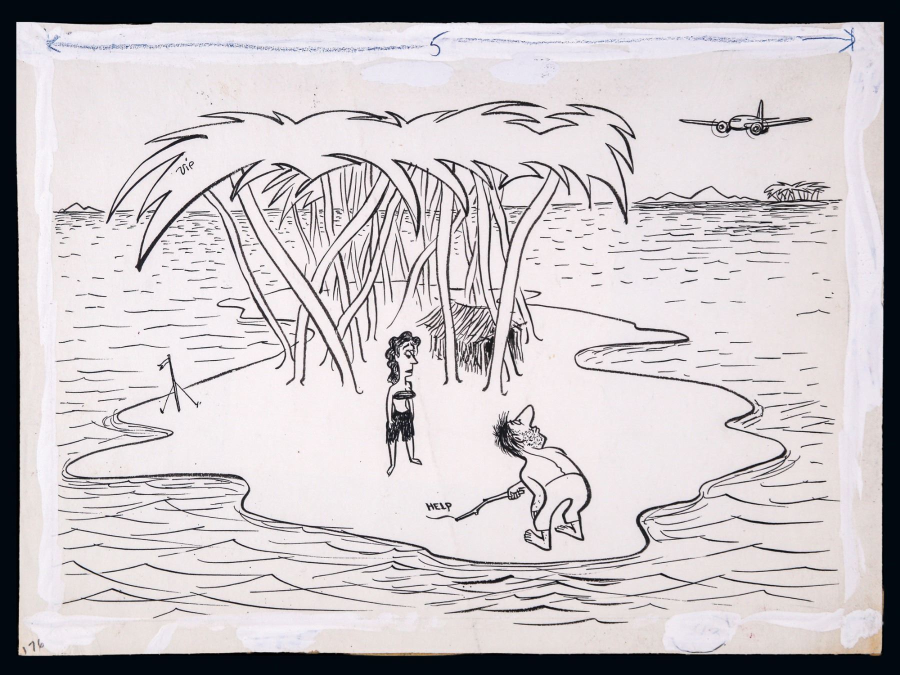 (1960s) Virgil "VIP" Partch was a prolific satirist and cartoonist in the 1940s into the 1980s. He was a story man at the Walt Disney Studio for a period before going off on his own with a series of hilarious "drunk humor" books. His hit syndicated strip was BIG GEORGE but it is his specialty spot gag illustrations in periodicals such as Playboy Magazine that are remembered. Here is one such illustration. A hilarious gag of a young couple marooned on a tiny desert island in the Pacific, where the male castaway really doesn't want to be found! Unknown where it was published. VG+. 11.5"x8.5".