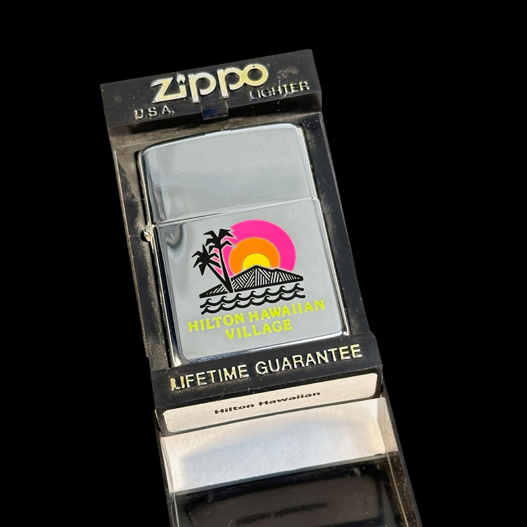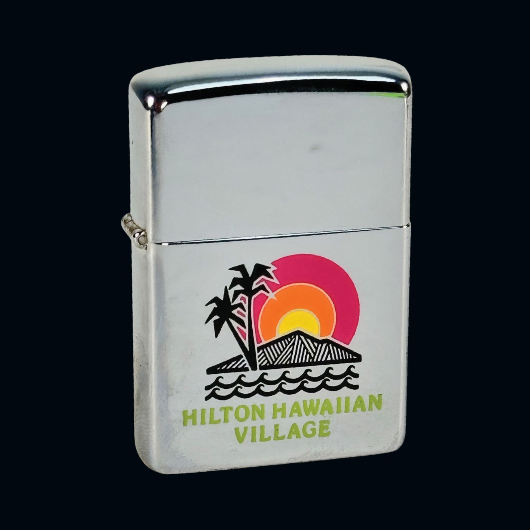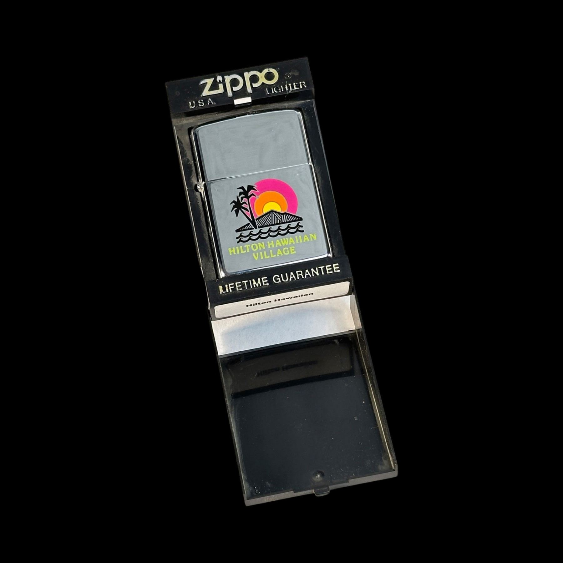 (1970s) Beautiful vintage Zippo New-Old-Stock lighter for the Hilton Hawaiian Village, still in sales packaging. EX. Not tested. 2"x3"x.75" in box.