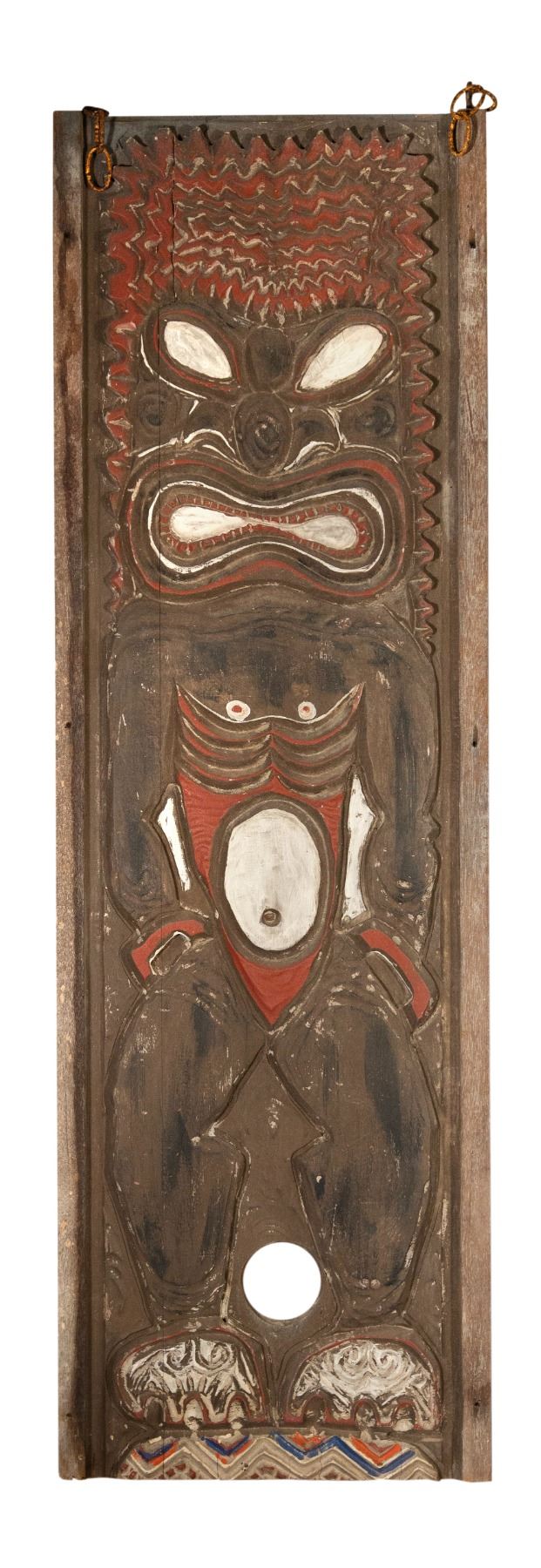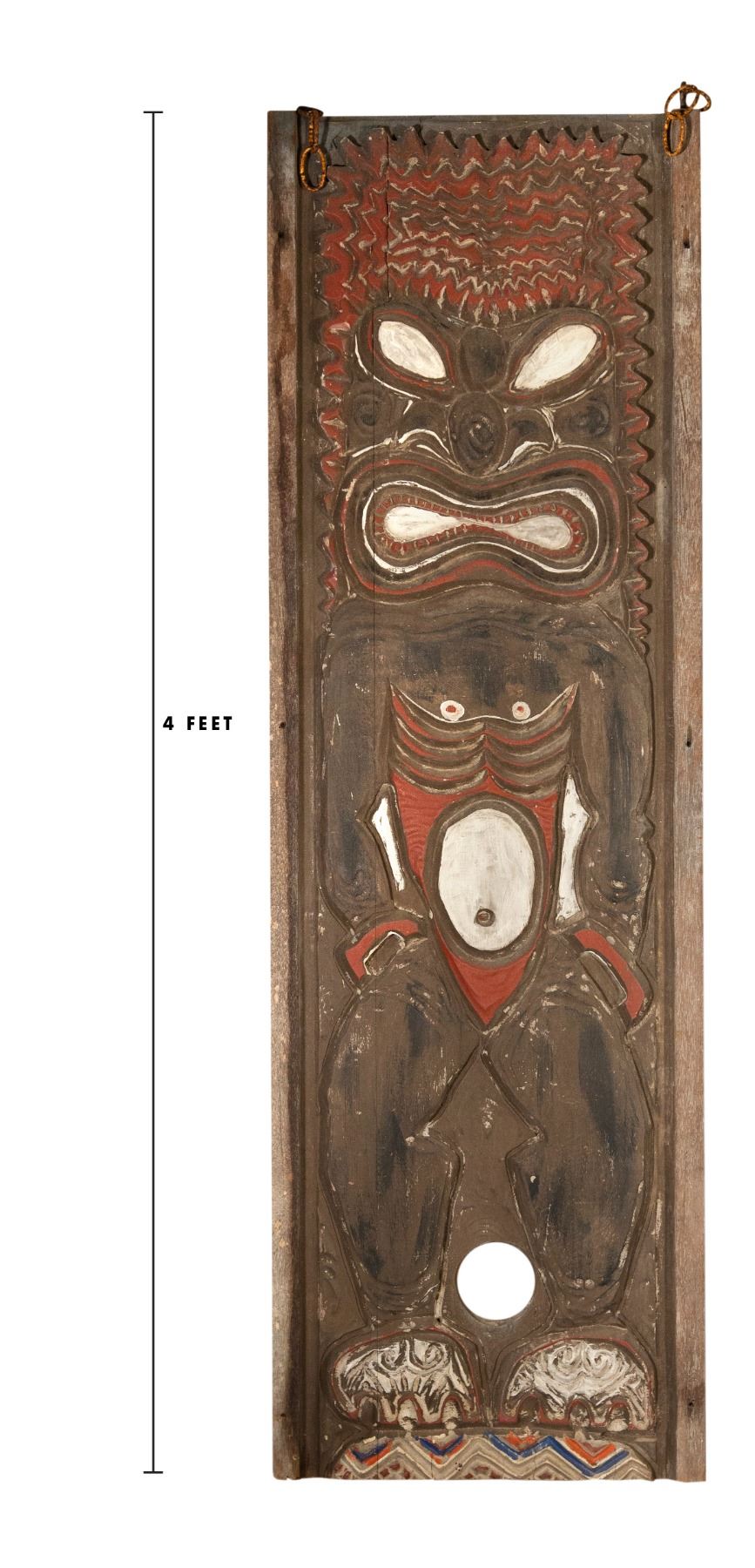 (1950s) From one of the Grand-Daddy locations in Polynesian Pop history! This gorgeous double sided carved hanging panel comes from the long extinct Don the Beachcomber location in Waikiki at the International Market Place. Proto-Tikis from this location are few and far between in the world today. This is a gorgeous example of the high end decor found at this mythic venue. The two sides of Hawaiian God of War, KU with this hand carved and painted Tiki double sided panel complete with metal hooks on top corners with hanging chains. Wood. 15"x48.25". VG some minor wear and chipping. It simply doesn't get more rare than this.