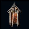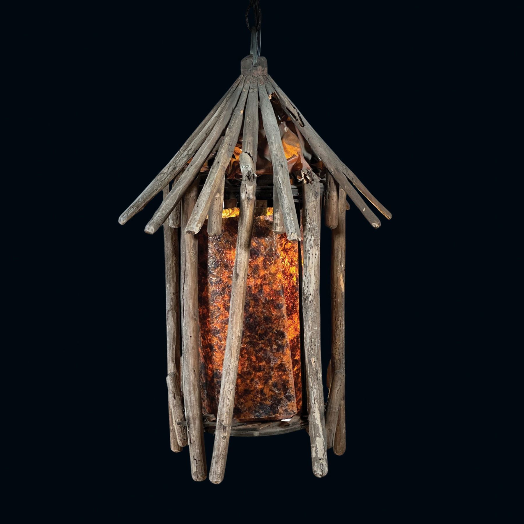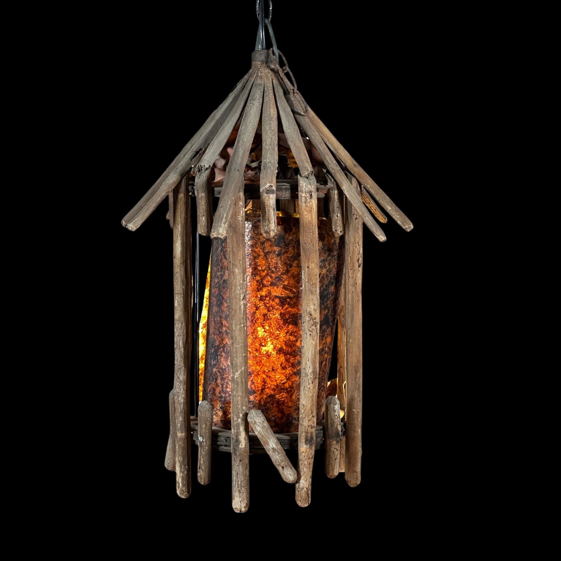 (1940s)* Here is a fragile, yet highly historic original lamp made by the guy who started it all. This is one of Eli Hedley's original "beachcomber" style hanging lamps. Hedley was know specifically for taking materials found 'adrift' along the beaches of Southern California and fashioning them, literally into a new way of life. This rustic lamp is very fragile and is being sold as that. Remember, these were not made on a commercial/industrial level. Underwriter Laboratories, be damned! It was created with found materials such as driftwood sticks and some type of celluloid shade in the interior to diffuse light. Old iron nails hold it together. When Kelbo's opened in Los Angeles in 1946, Hedley was one of the first suppliers to offer decor. Although we are not certain, it is estimated that this was from that first round of decor. This piece was acquired by Sven when Kelbo's went out of business. It has a unique look onto itself and really sums up the creativity of the Polynesian Pop movement Eli Hedley conjured out of thin air. Aagin, this is fragile and the starting bid takes that into consideration. GOOD with some broken pieces and general wear. 15"dia x 21".
