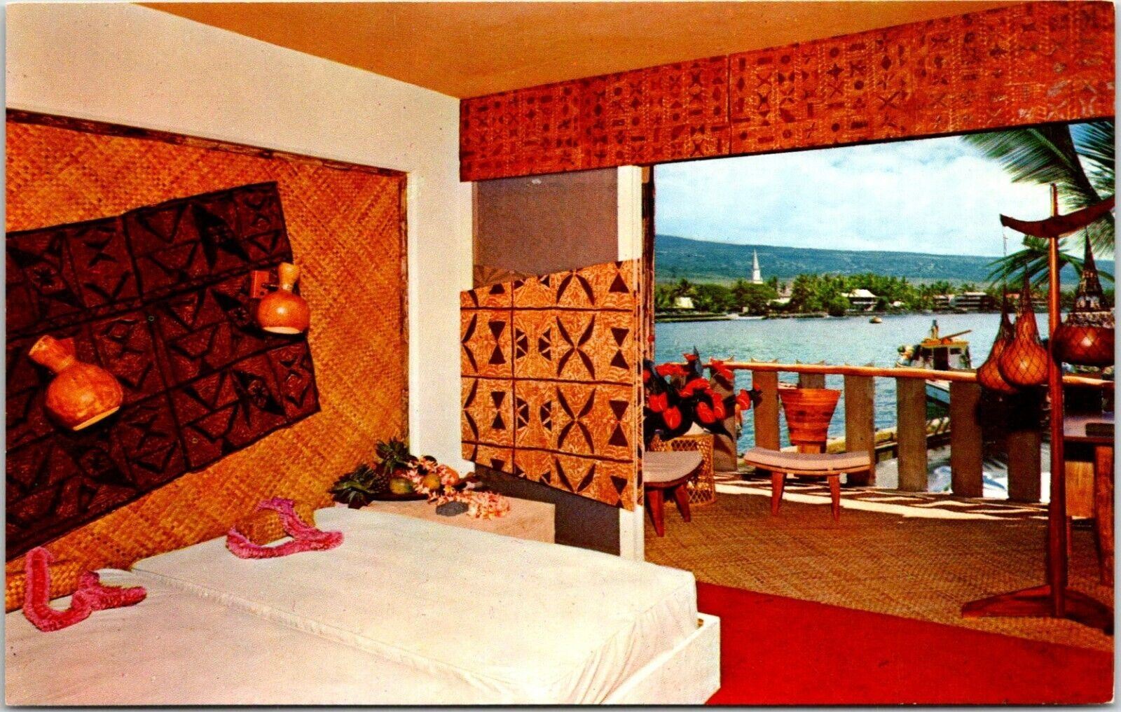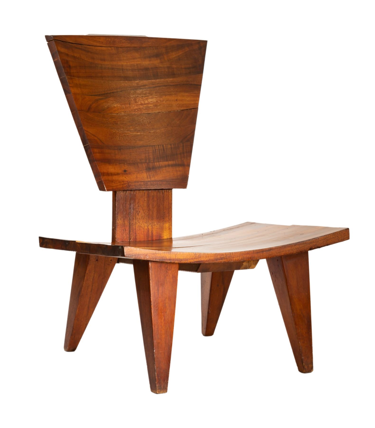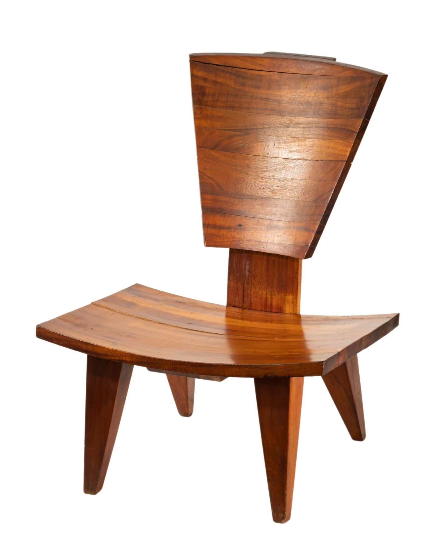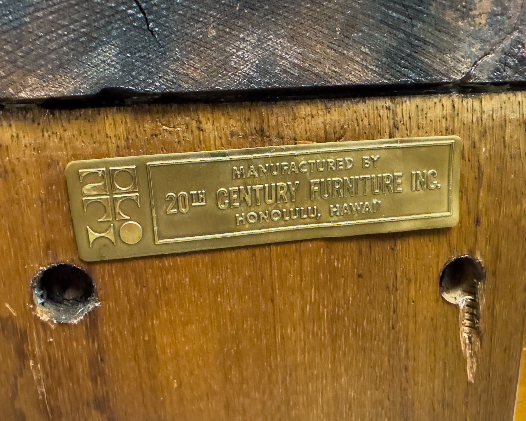 (1950s) A fabulous Eames-era inspired wooden chair in the best traditions of early modernist furniture. Manufactured exclusively by 20th Century Furniture Inc of Honolulu, Hawaii for the Hotel King Kamehameha in Kona on the Big Island. This striking chair shows the swooping and geometric design of the period. These were located throughout the resort used in both suite interior spaces as well as the verandas of the king suites. Incredibly scarce. Solid wood. 29.5"x22.25"x23".VG+ with some restoration and repaired chip on the seat. Otherwise, typical patina and wear from use. Retains embossed foil manufacturer's label. VG+ with typical wear and some restoration.