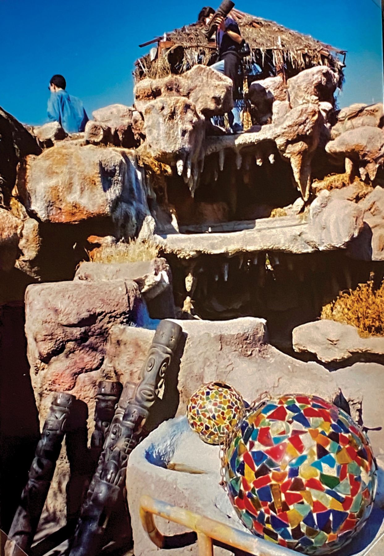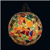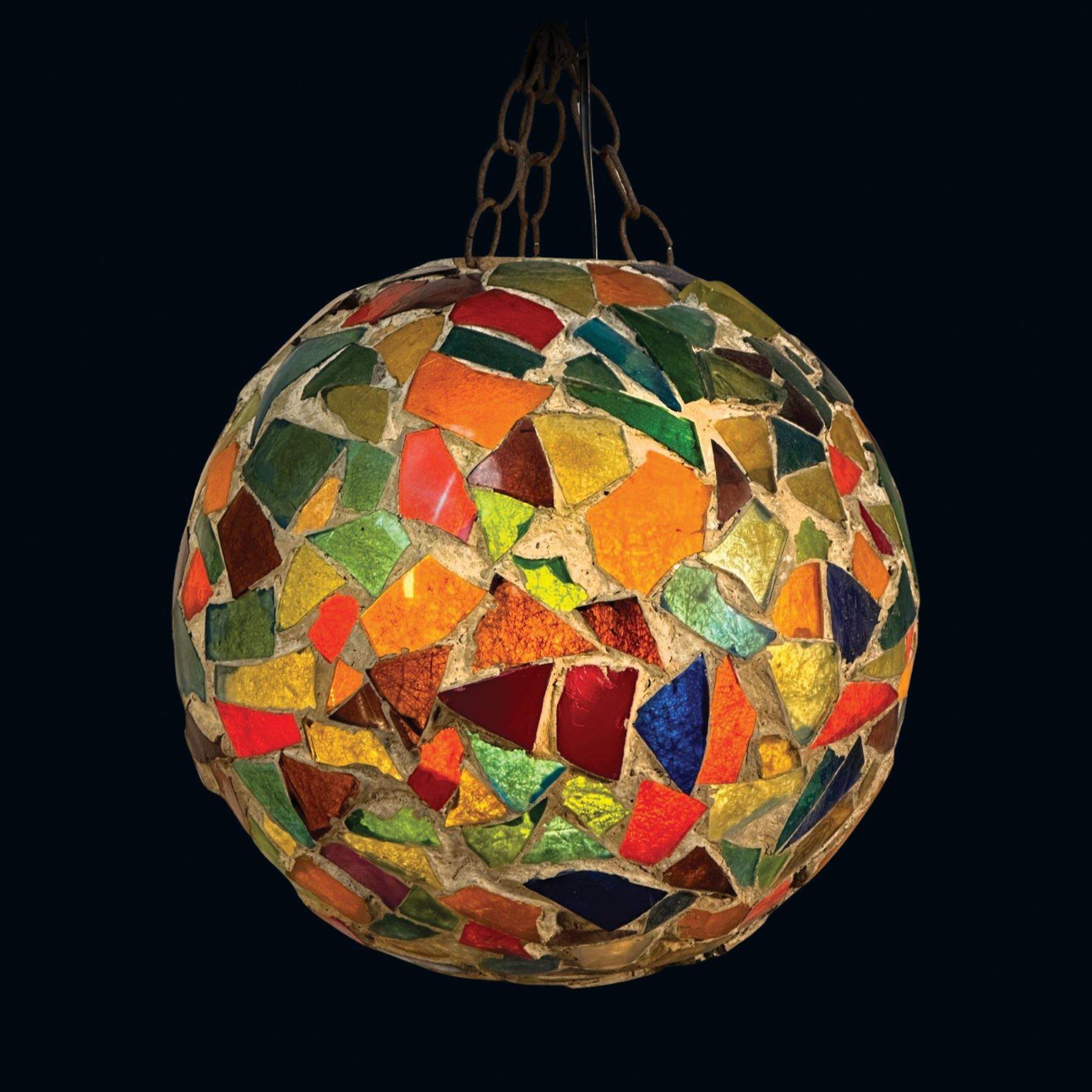 (1960s)* Chunk lamp collectors have probably not come across this before! This lamp was collected by Sven at the 1994 The TIKIS expedition. Vintage brochure photos show this lamp hanging in the lava tube cavern dining areas of the original TIKIS location in Monterey Park. Later, Danny Balsz moved it with the rest of the decor salvage to the new TIKIS II location at Lake Elsinore. This seemingly custom made lamp probably originates from the Sea & Jungle shop. Classic mid-century Poly-Pop! VG+ with typical wear. Heavy lamp. 14" globe with swag chain.