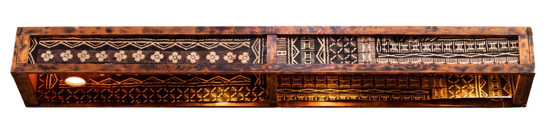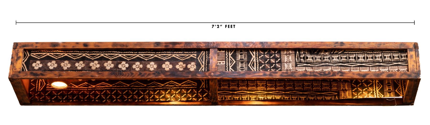(1940-50s) From one of the most legendary commercial locations in Tikidom comes this case-study Poly-Pop light fixture. There is perhaps no more influential bar-restaurant to this genre than Don the Beachcomber in Hollywood, California. Artifacts are few and far between. Beautiful Tapa cloth design work is the focal point of this long light box with solid wood burned grain frame pieces and individual light fixtures. Cloth and wood with electric fixtures. All original, this would be the perfect item to accent a home or commercial bar location...it certainly has the DNA of greatness! Purchased directly from Don the Beachcomber during their famed closure sale. 85.5"x12.75"x8.5". VG+ with typical wear. Has not been tested.