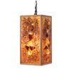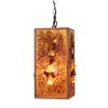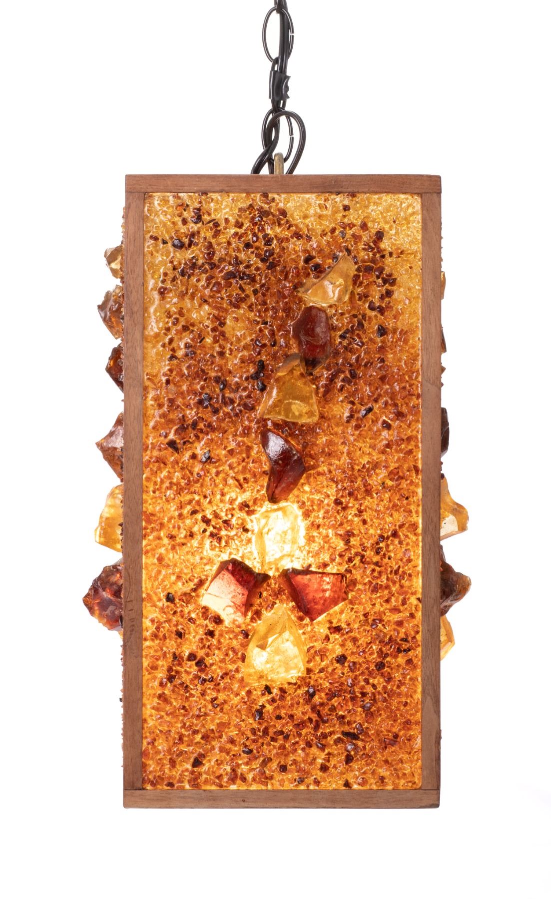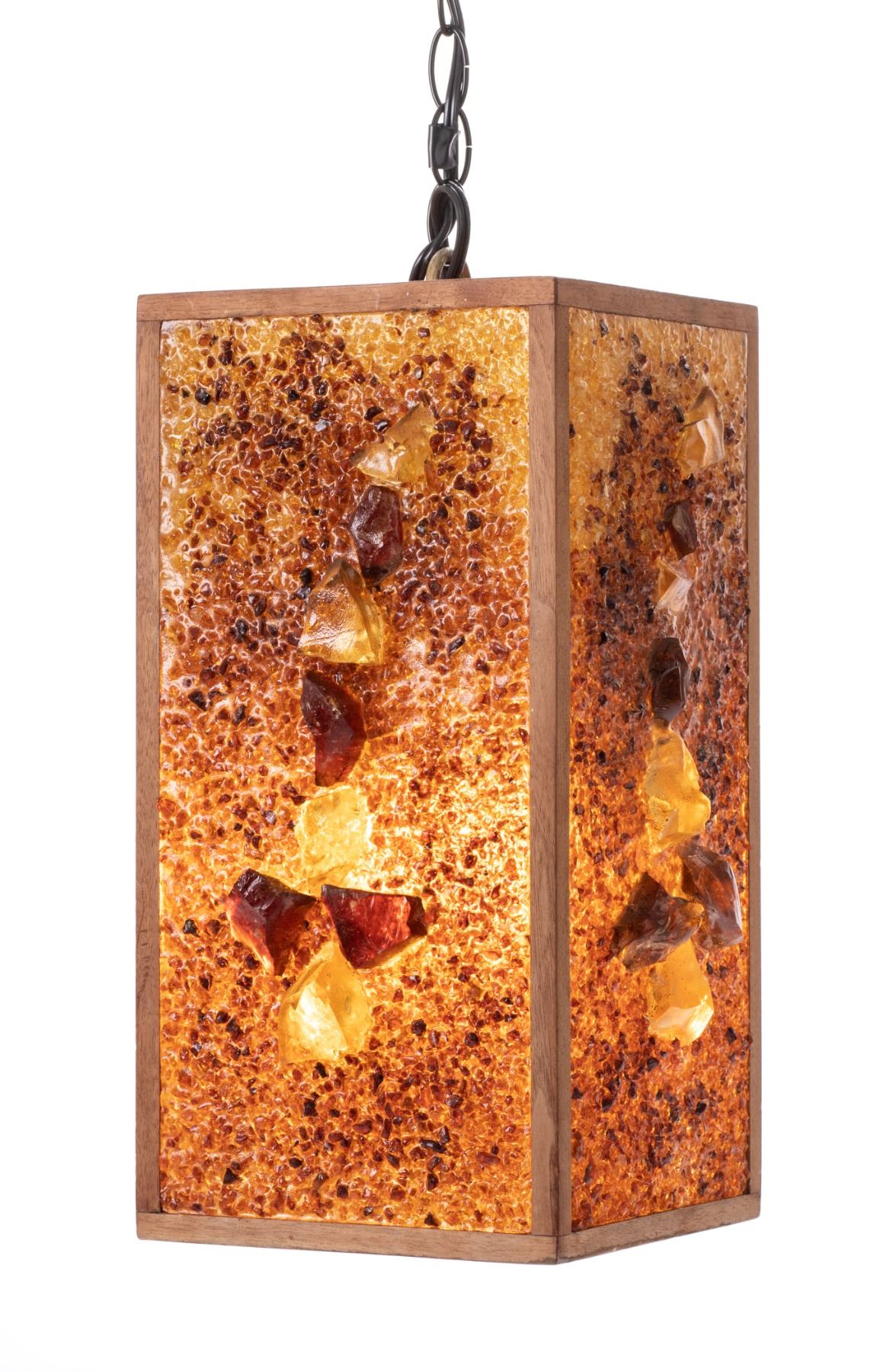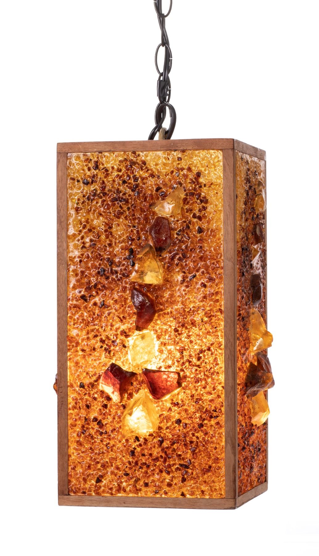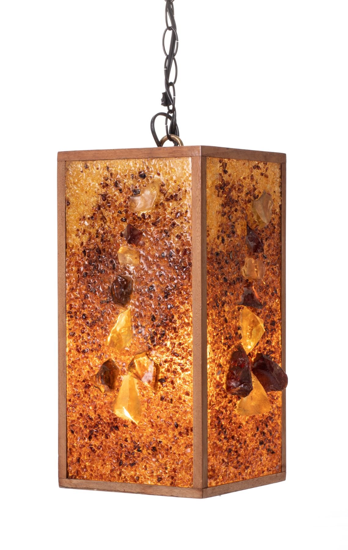 (1960s) Absolutely striking centerpiece for that perfect Hollywood Regency swinger home! Create a warm, inviting ambiance to any room with this rectangular hanging swag lamp. Crushed ombre resin pieces adorned with an alignment of larger chunks and framed with solid wood. 16.25"x8.5"x8.5". VG+.
