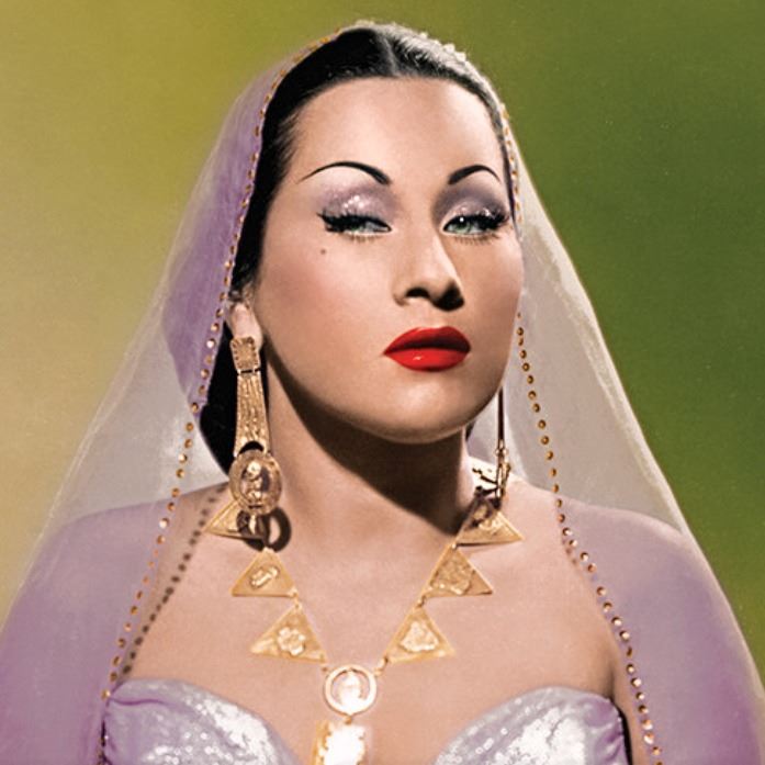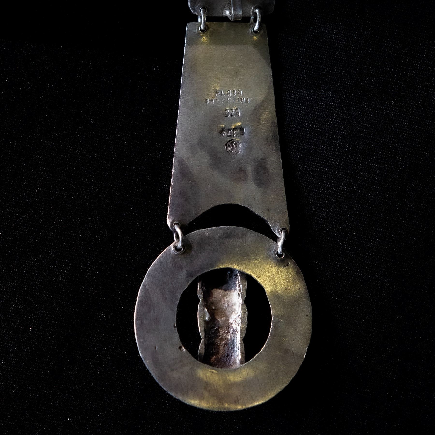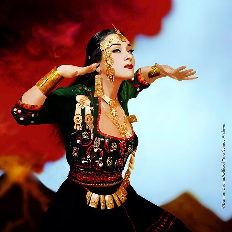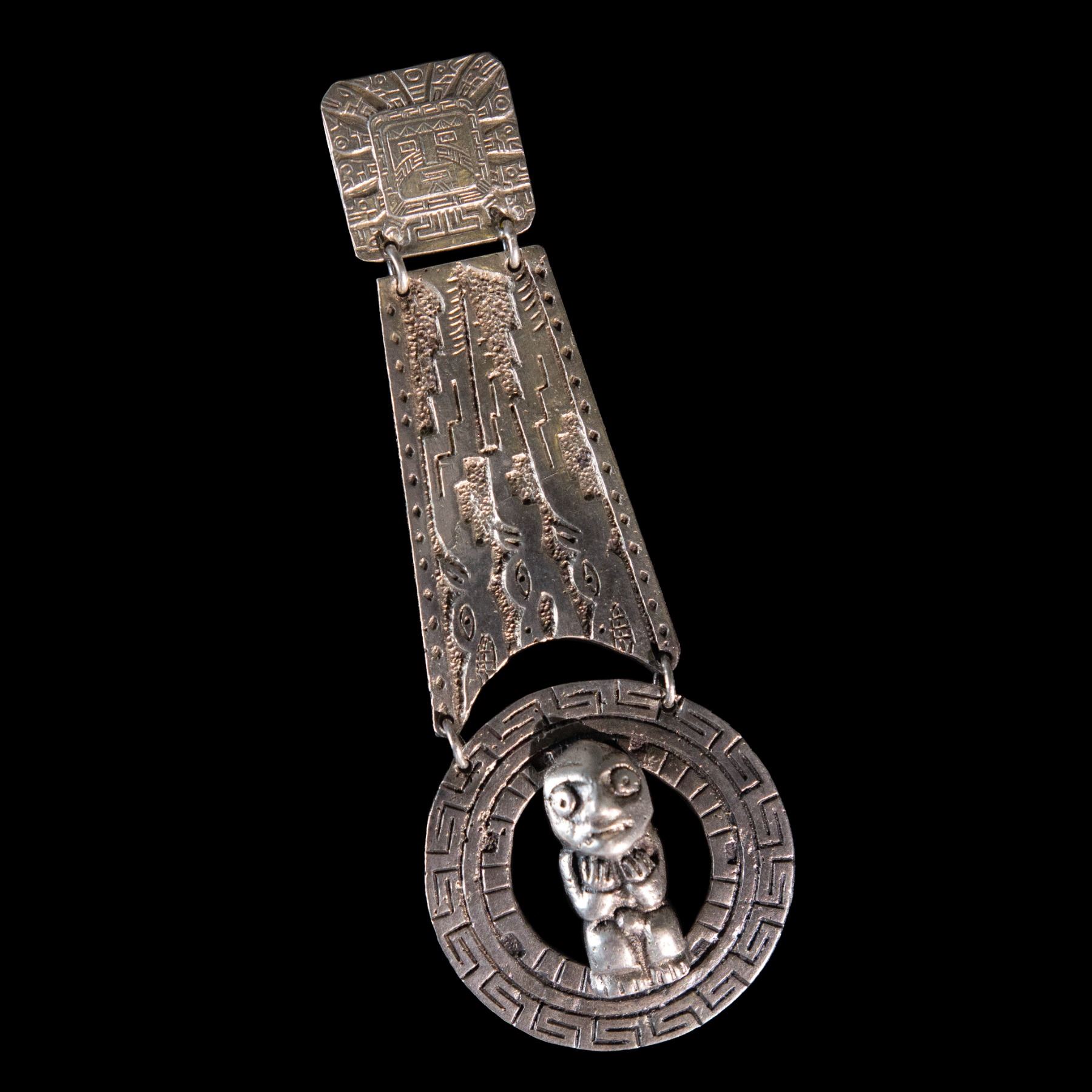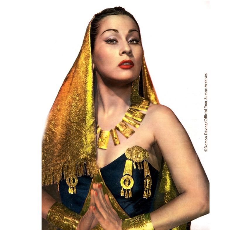 (1940s) Here is an extremely rare opportunity to own a Holy Grail of Exotica! One single Yma Sumac personally owned costume earring from her "Inca Jewel" collection. Next to her otherworldly voice and piercing beauty, perhaps no other item defines the Exotica icon of Yma more than her costumes. Note: the color photos shown for reference dipect these pieces as gold in color. That was actually done in a colorization process to 'amp' up the cover and promo art. The true color of theses costume pieces were silver. The mate to this pair was converted to a pin broach and is retained by the Yma Sumac Archives, thus making this the only specimen in the available in the world. The idea of a resurrected ancient Inca princess was her persona and this physical costume prop is hard evidence that is wasn't all just a dream. Yma was a real person and her performance of that persona was fact, not fiction. Yma wore this Inca design earring in countless photo shoots and personal appearances at clubs such as The Mocambo, Ciro's, The Trocadero and Don the Beachcombers is the Golden Age of Hollywood and Broadway. This piece is stamped "PLATA ESTERLINA 925 - PERU" on the back. From the official YMA SUMAC ARCHIVES collection, the piece is accompanied with a signed certificate of authenticity from curator, Damon Devine. Photos of Yma wearing this earring will be furnished with the item. 3.75"x1.5". VG+.