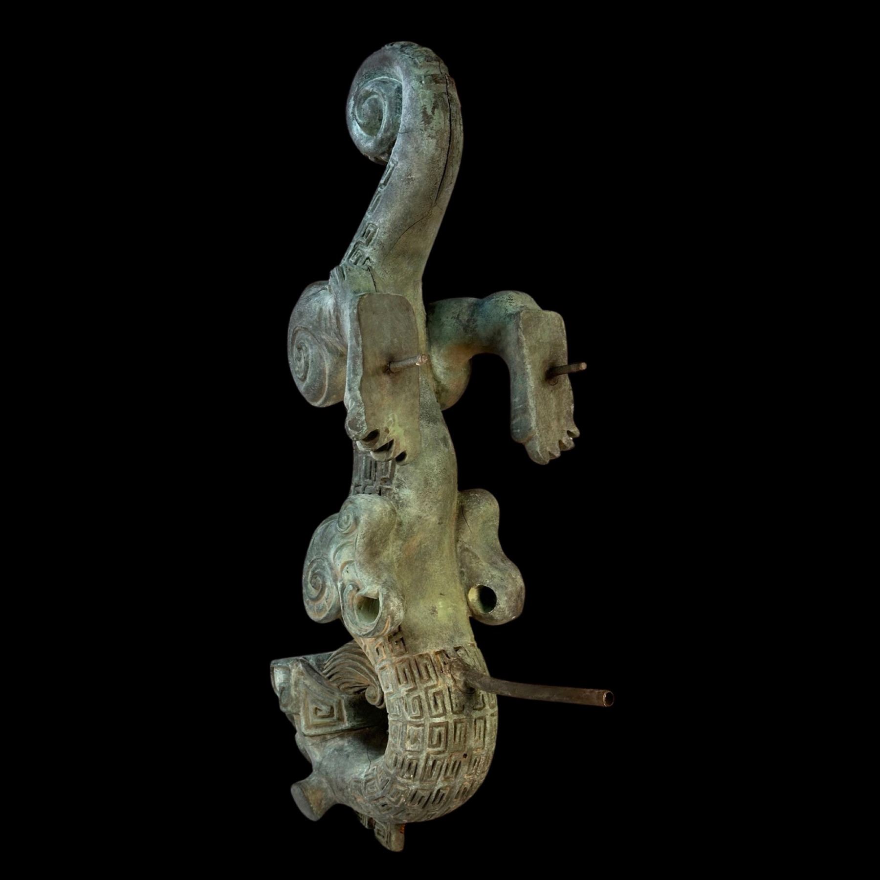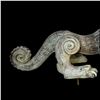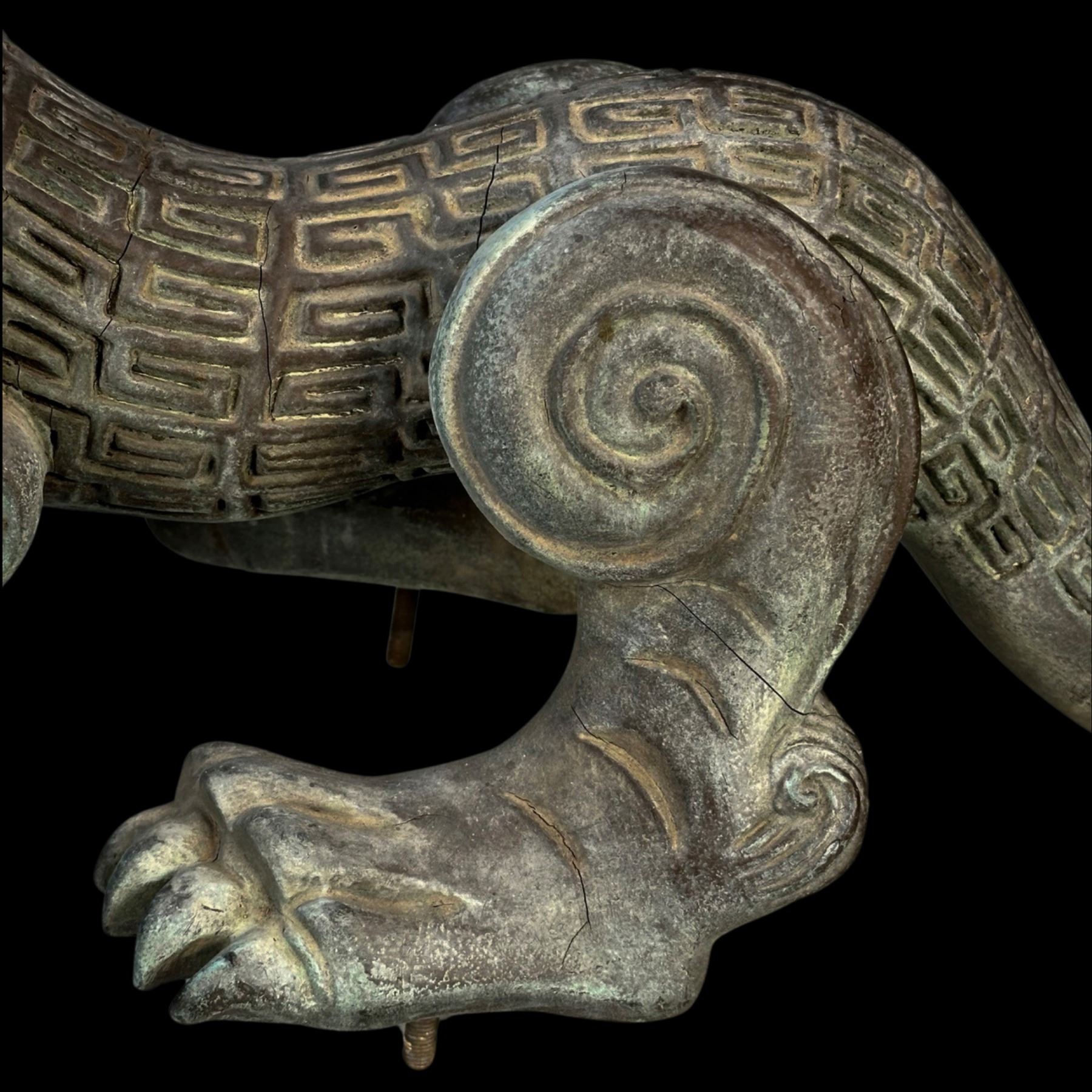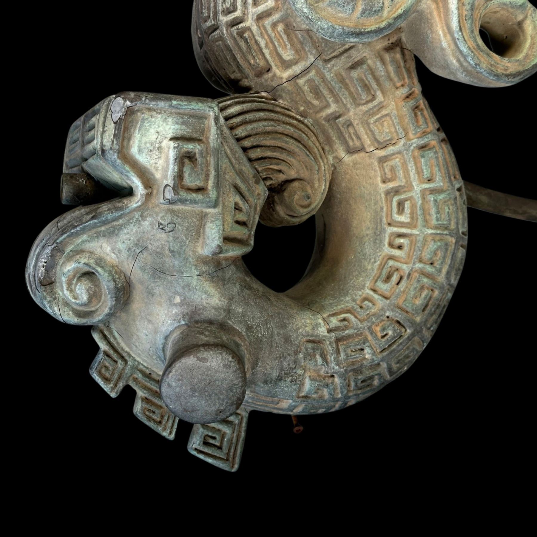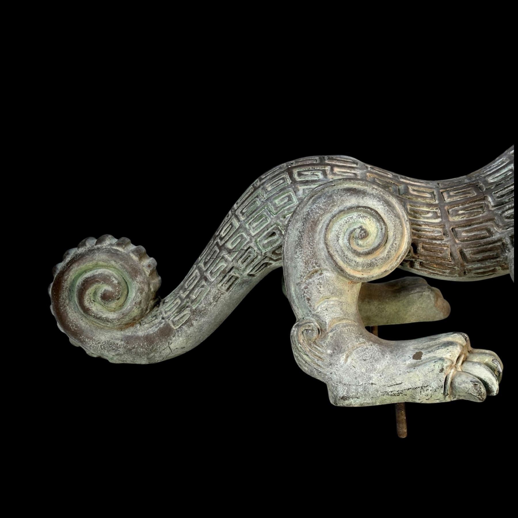 (1960s) This amazing piece recalls the golden era of theatrical Chinese restaurant dining. This stylized dragon water sconce would be mounted upright and most probably emitted water from its mouth into a catch or pond nearby. Made of a fiberglass composite material with brass hardware. Would make an excellent accent piece to any Poly-Asian decor. VG+ with some stress cracking in the composite. Does not detract. 36"x15"x7".