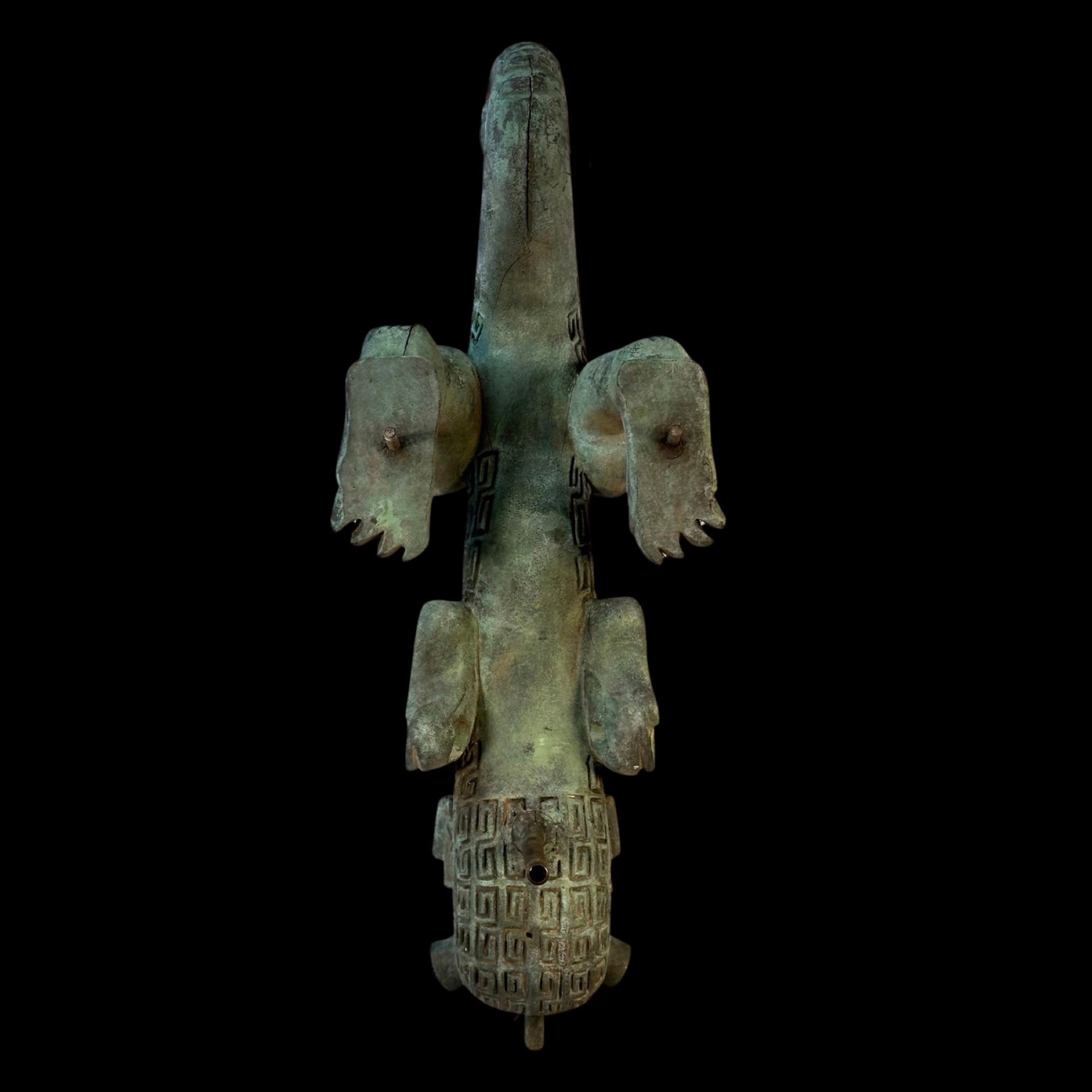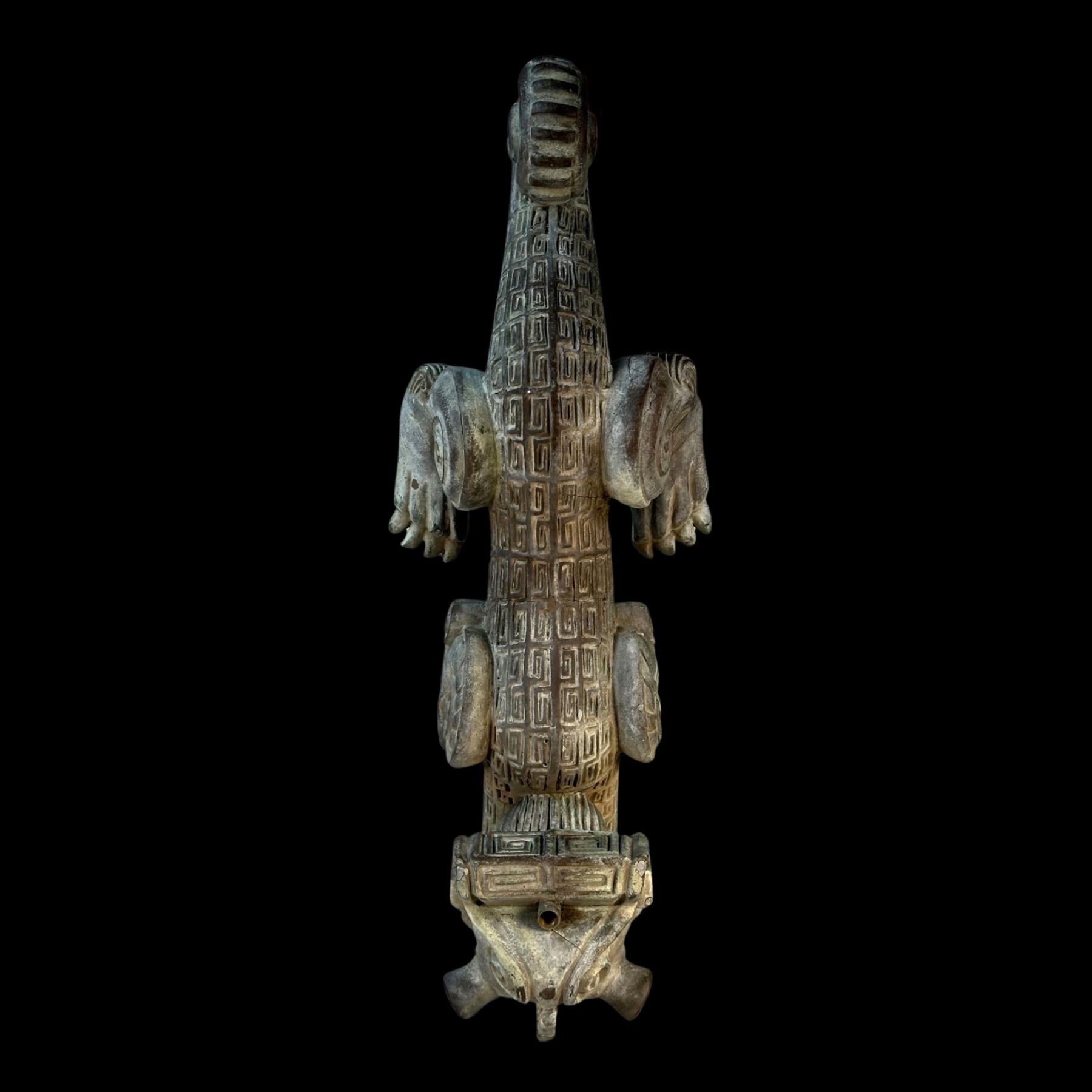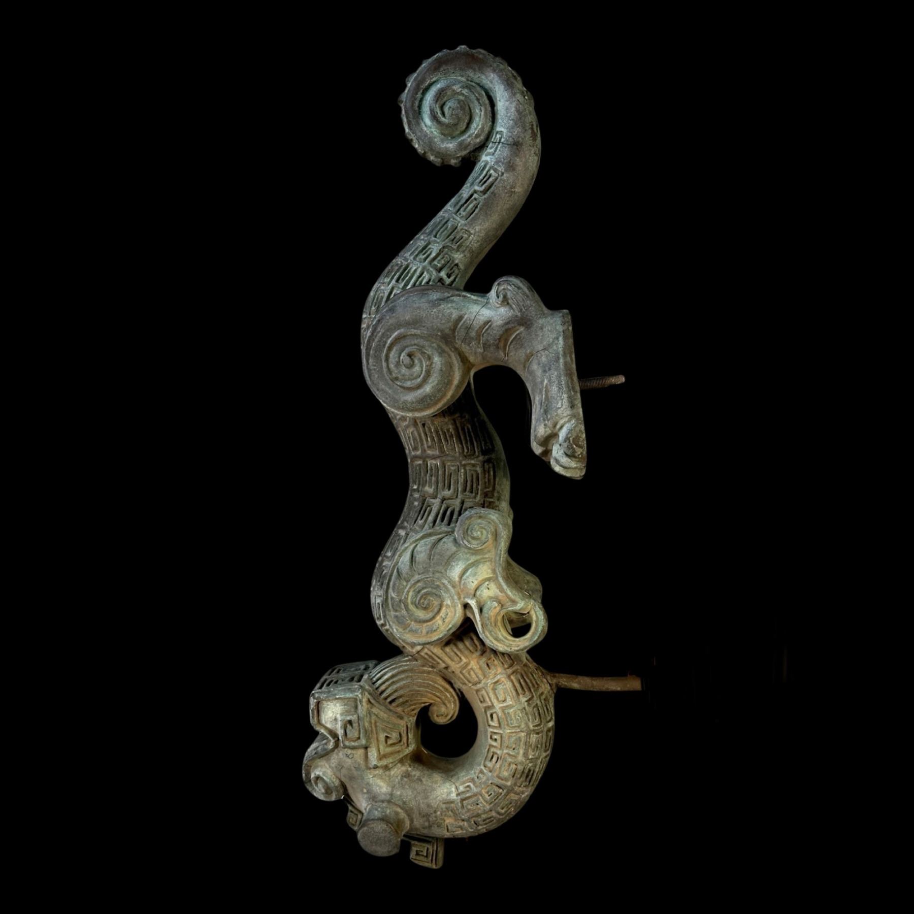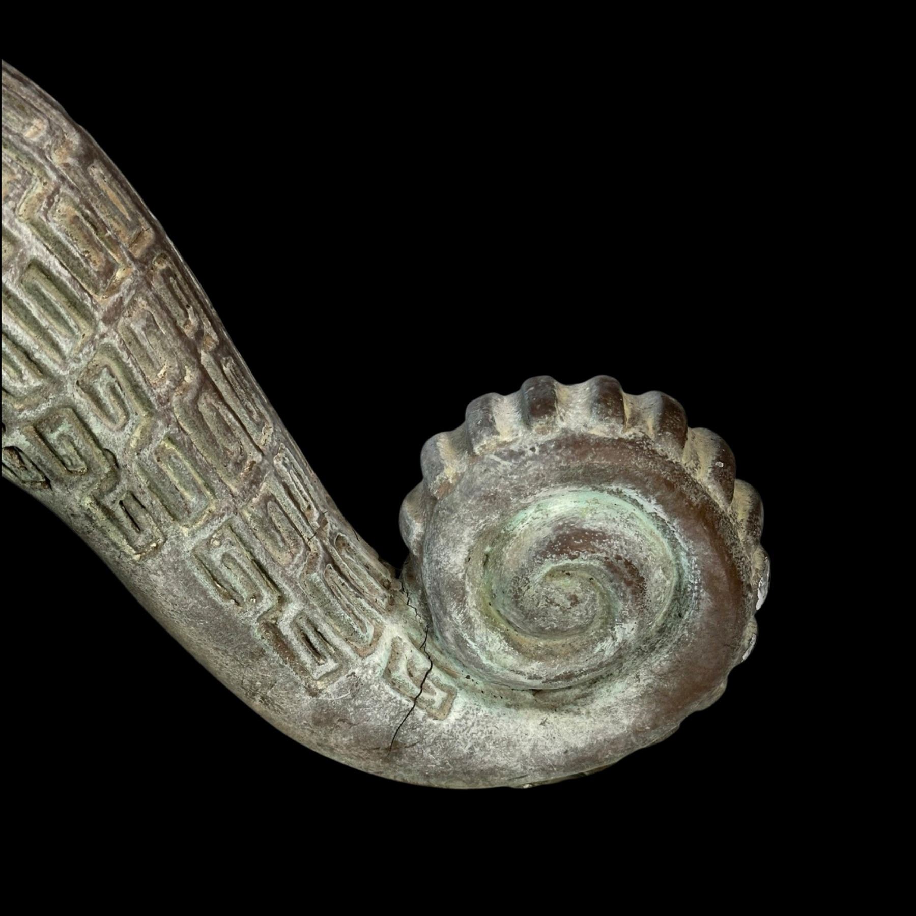 (1960s) This amazing piece recalls the golden era of theatrical Chinese restaurant dining. This stylized dragon water sconce would be mounted upright and most probably emitted water from its mouth into a catch or pond nearby. Made of a fiberglass composite material with brass hardware. Would make an excellent accent piece to any Poly-Asian decor. VG+ with some stress cracking in the composite. Does not detract. 36"x15"x7".