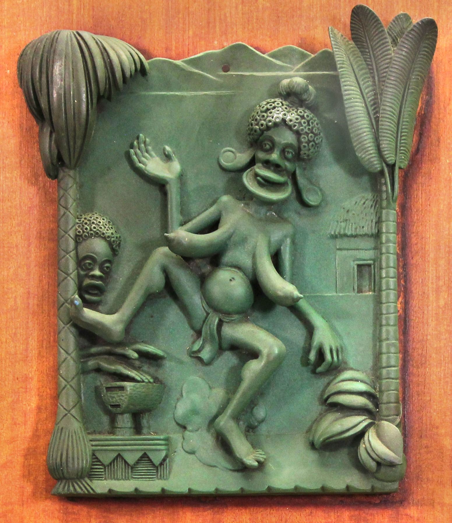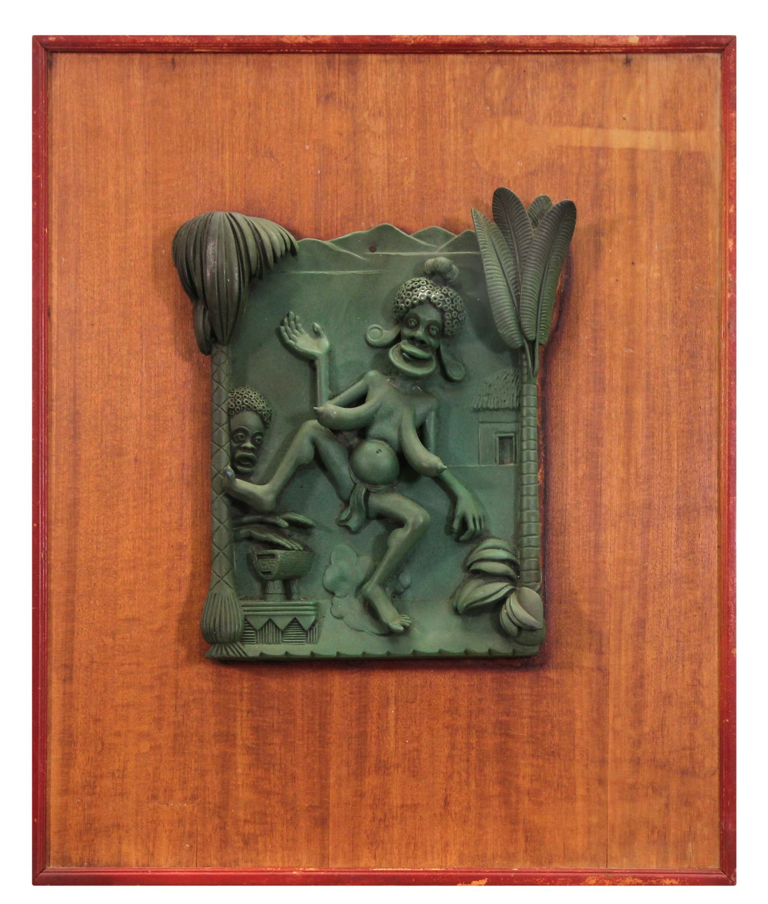 (1950s) Fascinating molded rubber cartoony native wall hanging features the image of a semi-nude woman dancing to a male conga drum player against palm trees and huts. Chris Mueller was an incredibly accomplished sculptor in Hollywood as well as architectural decor in Los Angeles and San Francisco. Mueller and his father, whom he trained under sculpted a good deal of the 1939 Pan Pacific Exposition still standing today in Exposition Park. Mueller also sculpted many famous Universal Monsters in the 1940s and 50s. Walt Disney brought on Mueller to sculpt much of early Disneyland including the JUNGLE CRUISE ANIMALS, the PETER PAN FLYING GALLEONS, the PHANTOM BOATS, decor on SLEEPING BEAUTY CASTLE and so much more...much of that is still in use at the parks today! Chris was a Polynesian freak and loved the genre. He had a wonderland built in his personal backyard in Burbank, CA. This novelty piece was most probably done for that. Although, highly insensitive culturally, it's a stunning piece and the sculpt is exquisite. The rubber is in excellent shape for being over 70+ years old. Full wooden frame and backing. Frame:15"x17.5" Hanging:8"x9.5". VG slight stain on upper right wood backboard.