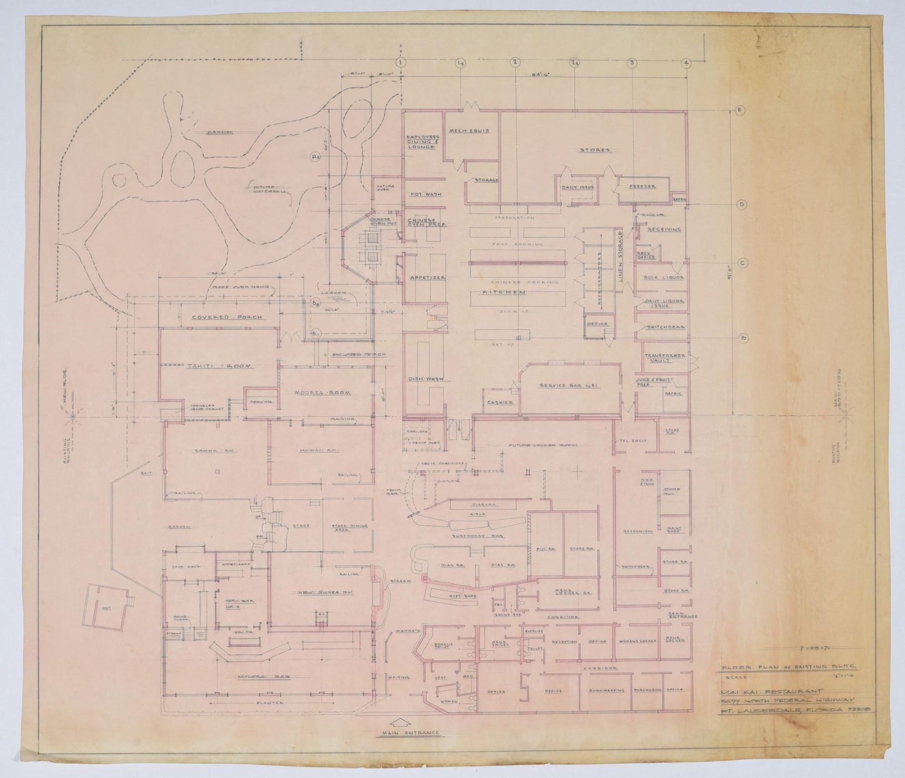(1971) Here is an absolute treasure of Polynesian Pop history! This large scale, hand-drawn floor plan for the entire MAI-KAI building interior with all dining rooms, bars, stage, gardens, patios, restrooms, offices, service bars, kitchens and storage areas. This was created in 1971 (dated 7-29-71) as an update to the last, and less accurate floor plan from the early 1960s. Special noted features are THE SURFBOARD BAR, NEW GUINEA ROOM, MOLOKAI BAR, HAWAII ROOM, SAMOA ROOM, TAHITI ROOM, MOOREA ROOM, CHINESE OVEN ROOM, THE GIFT SHOP and more. Hand drawn to scale, it gives an excellent perspective on the machinations of this complex operation and how the many rooms function with one another. This was prepared on the outset of the 1971 renovations which included the forthcoming Bangkok Room and related areas such as the upgraded customer restrooms which still stand to this day. Never has such an important document to the commercial Polynesian Pop business been on offer. This large piece of art is drawn with graphite and colored pencil on drafting paper stock and is conservation mounted on archival backing. VG+ with minor wear and toning. 34"x30".