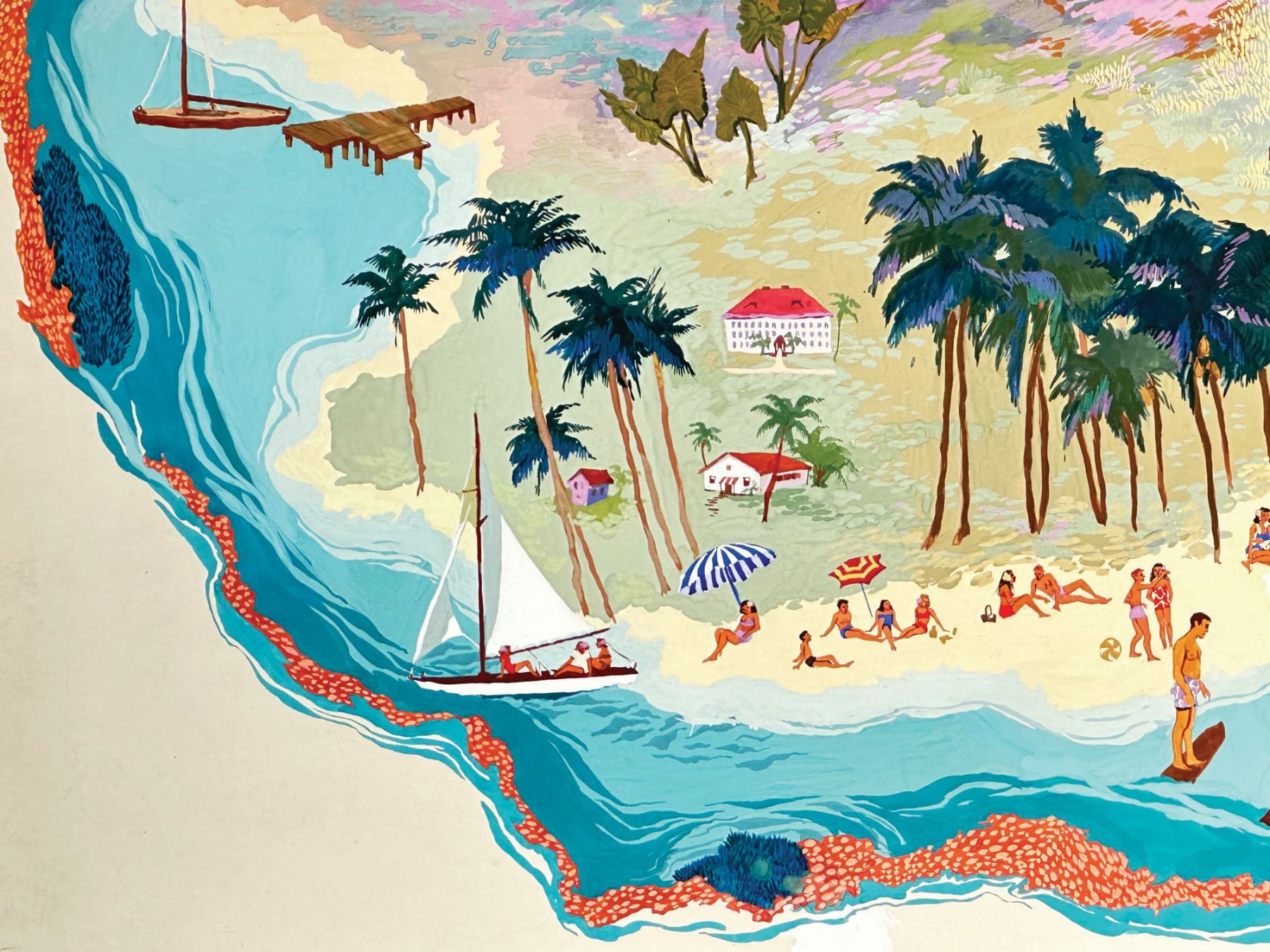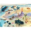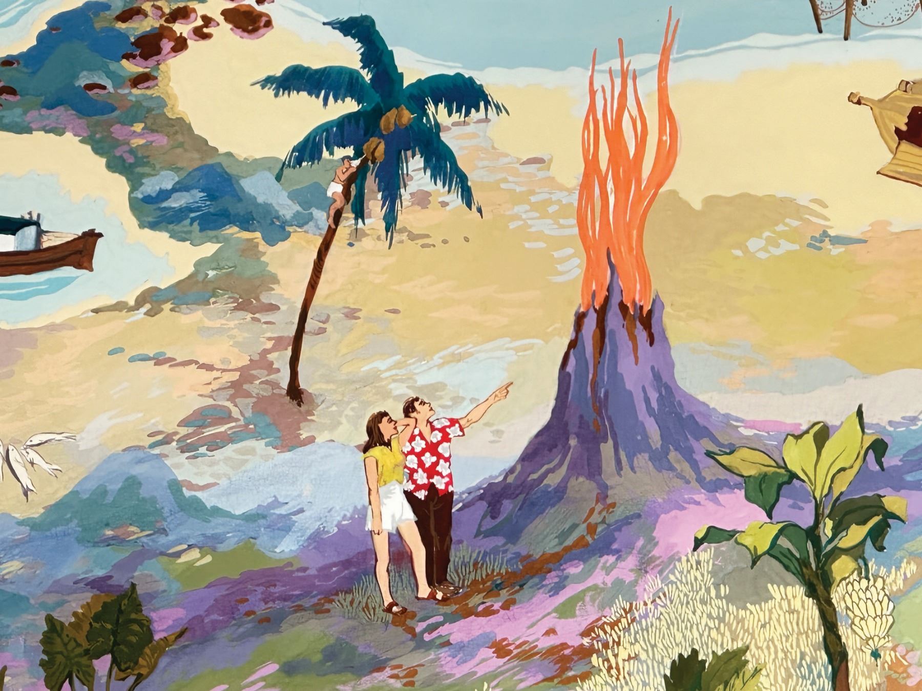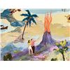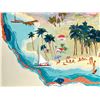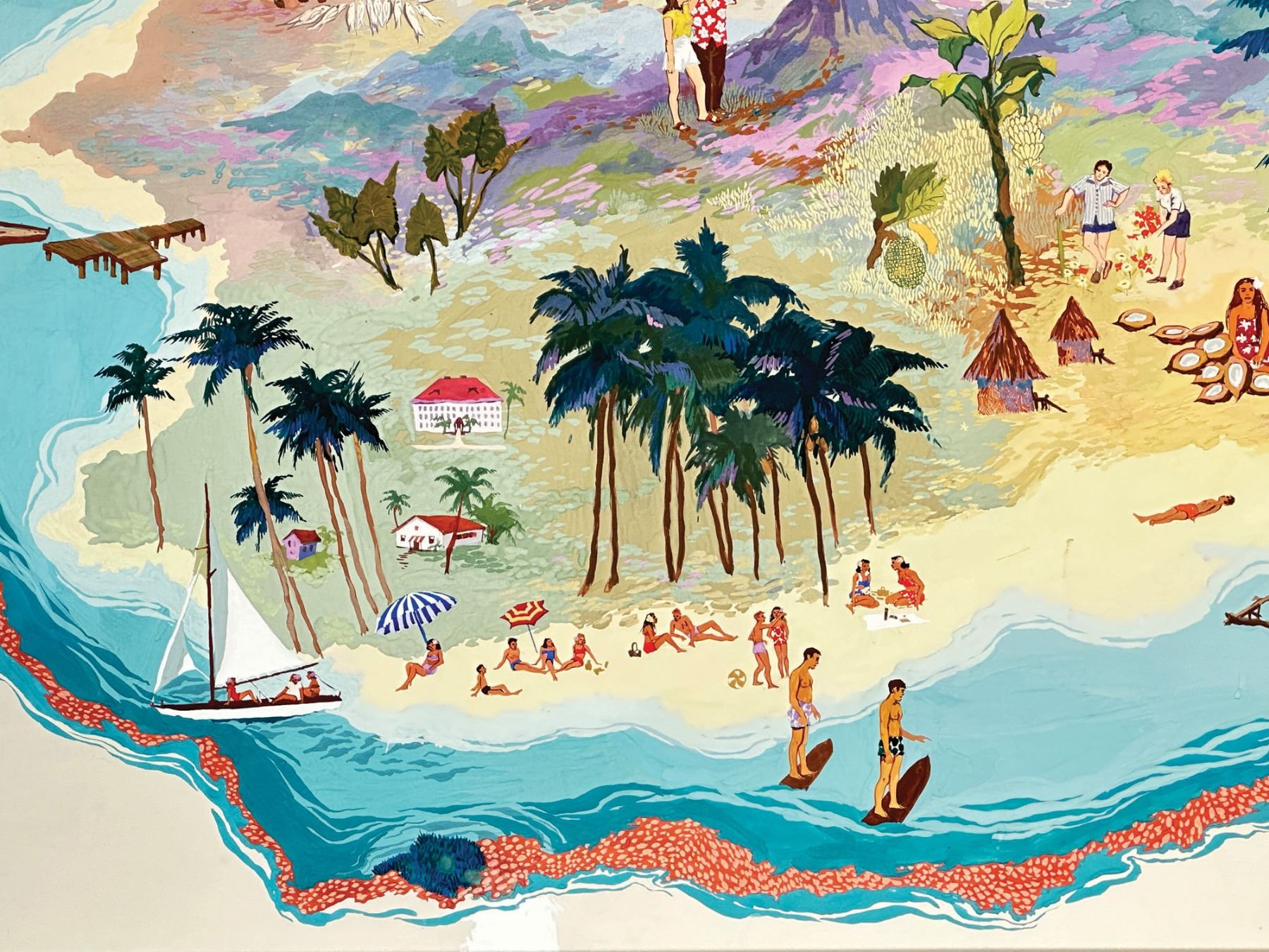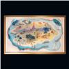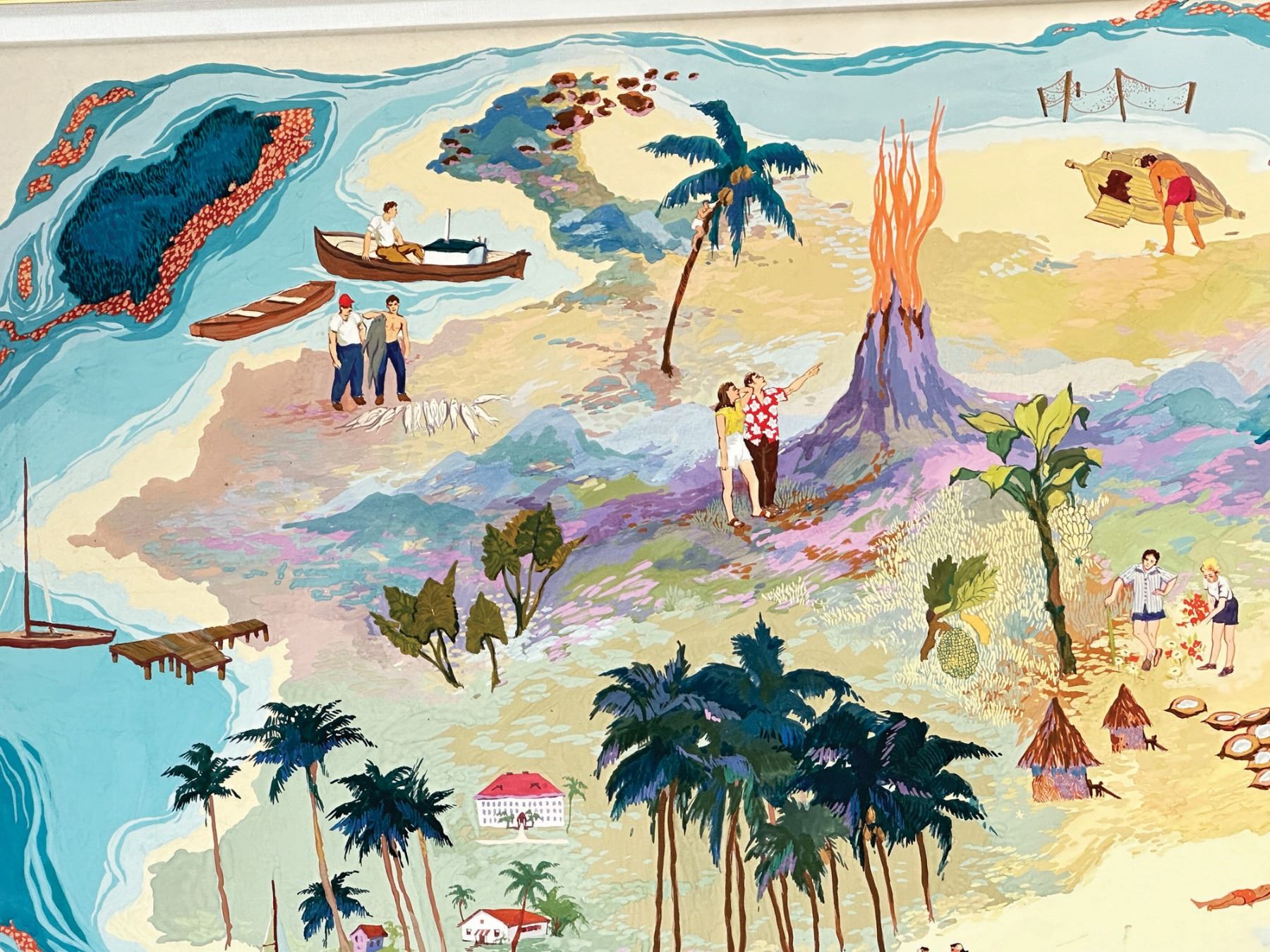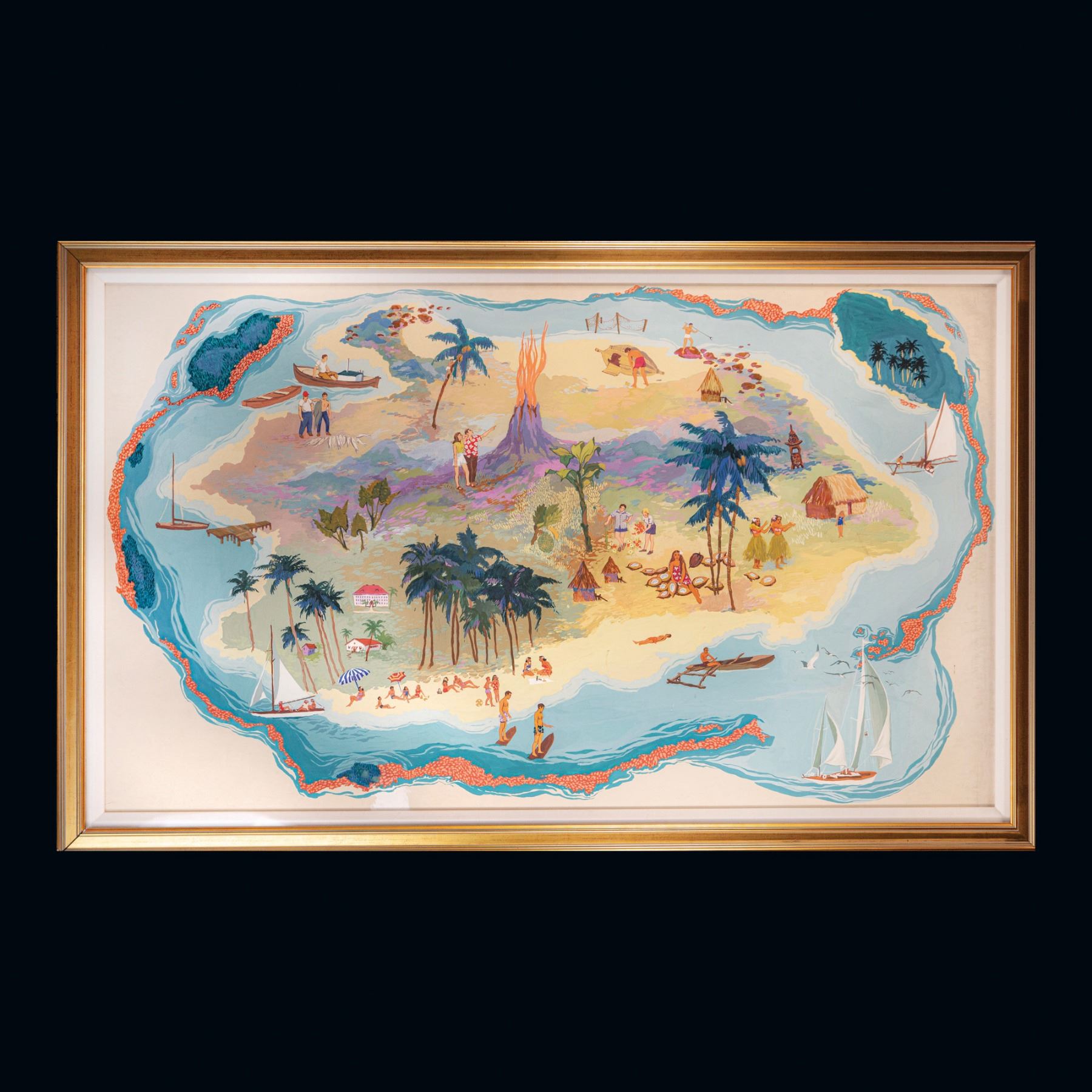 (1950s) Absolutely stunning piece of original artwork done for either a travel brochure or poster of the period from the late 1940 thru the mid 1950s. Artist unknown. Classic map-story art featuring the many activities and natural features of an atoll in the South Pacific. Tourists, native dancing, fishing and harvesting, along with recreational sailing and even an active volcano are depicted. The overall size of this original is impressive and would add an incredible conversation piece to the home of any Polynesian Pop collector. VG+ and uninspected out of frame. 27.5"x44" frame, 23.5"x40" opening.