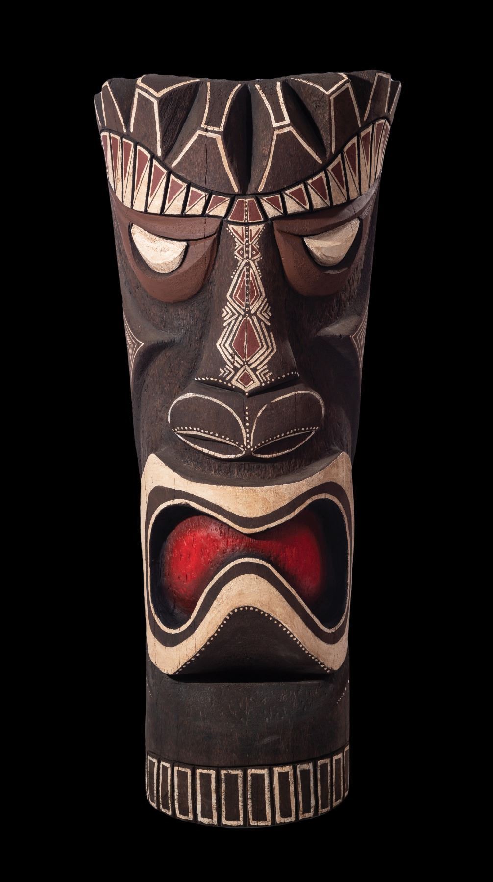 (2000s) A ferocious OA original by LeRoy Schmaltz. A classic generic "war god" type tiki figure with a flare at the head. Beautifully polychromed. 50"x22". VG+ with typical wear.