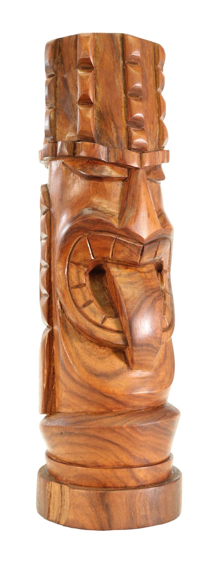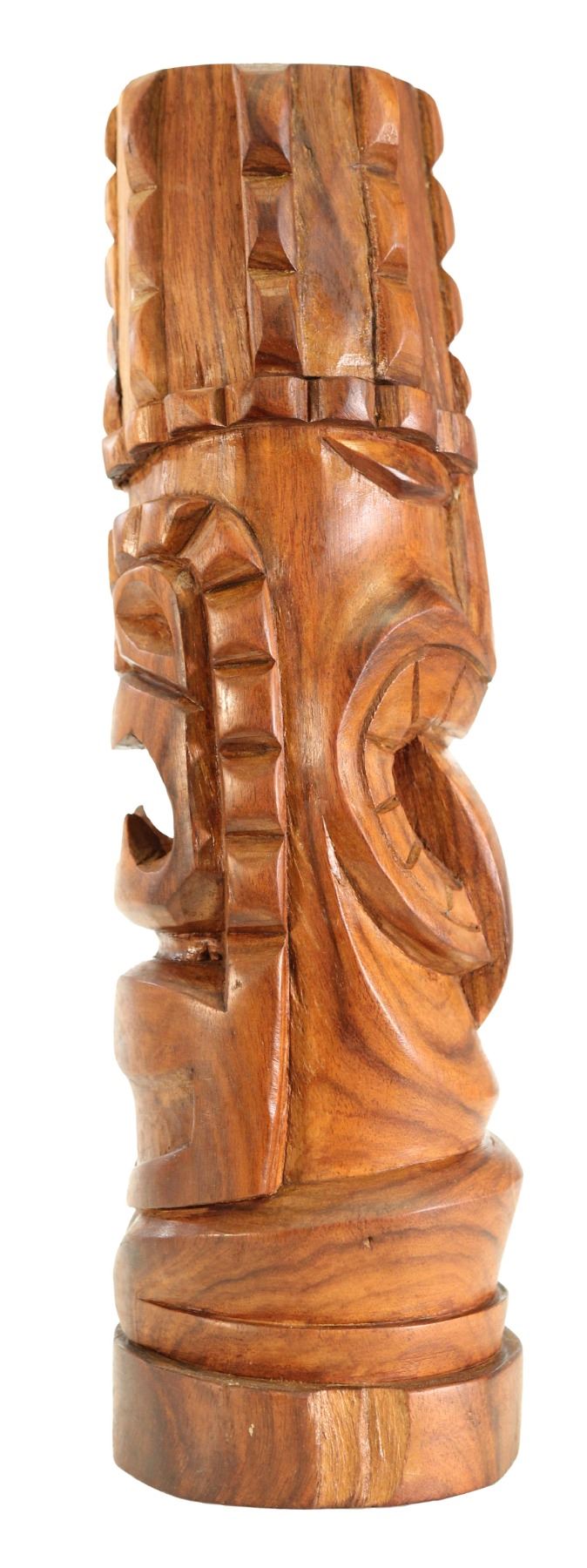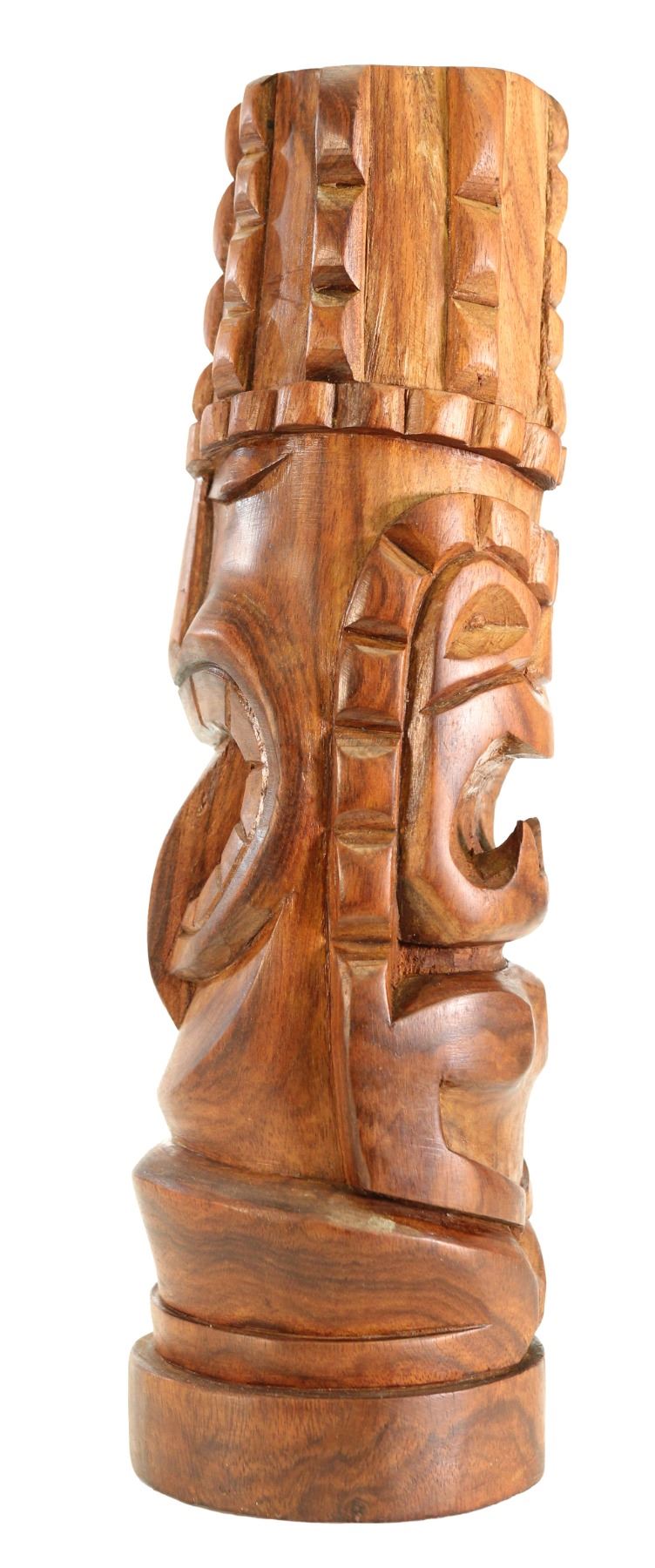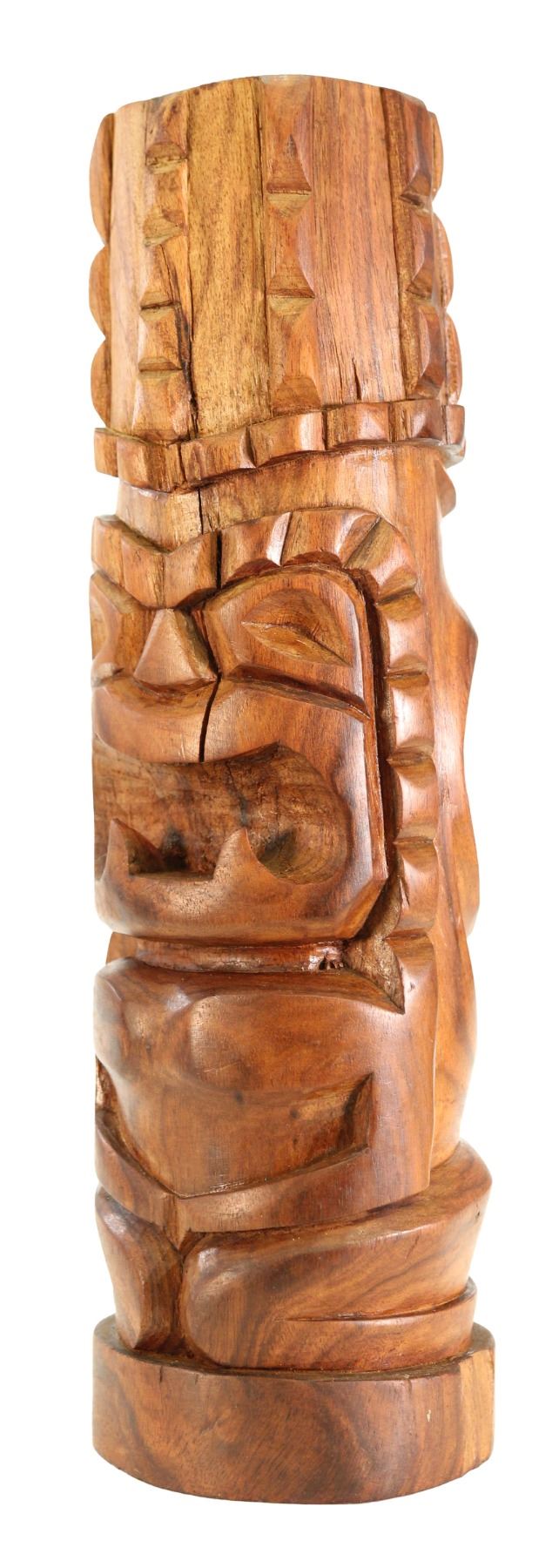 INTERESTING CARVED TWO-SIDED TIKI POLE WITH WARRIOR OUTSTRETCHED TONGUE.