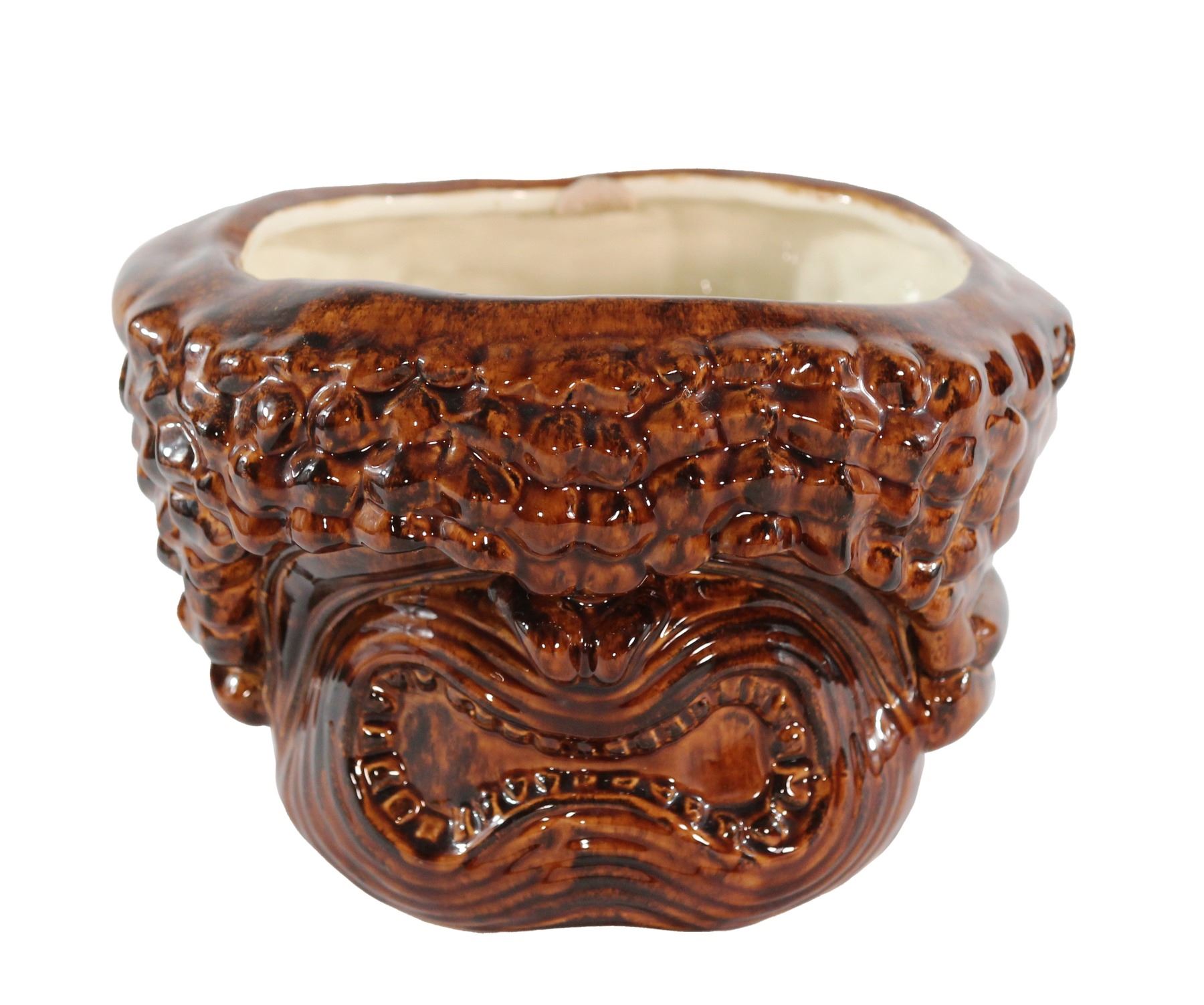 The face of KU:Tiki God of War is represented in this warm brown ceramic planter. Produced by the Jamar Mallory Company for both commercial applications and home hobbyist applications. Suitable for indoor or outdoor plants. 7"x10.5"dia. VG+.