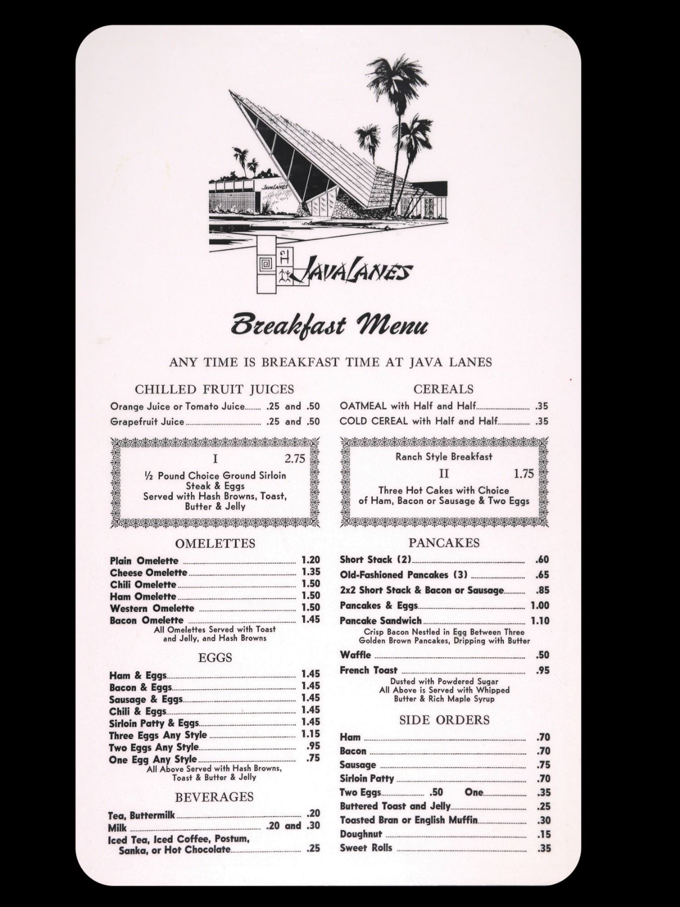 (1960s)* Food menu for the Long Beach, CA diner. VG+ with light creasing. 8.5"x14".