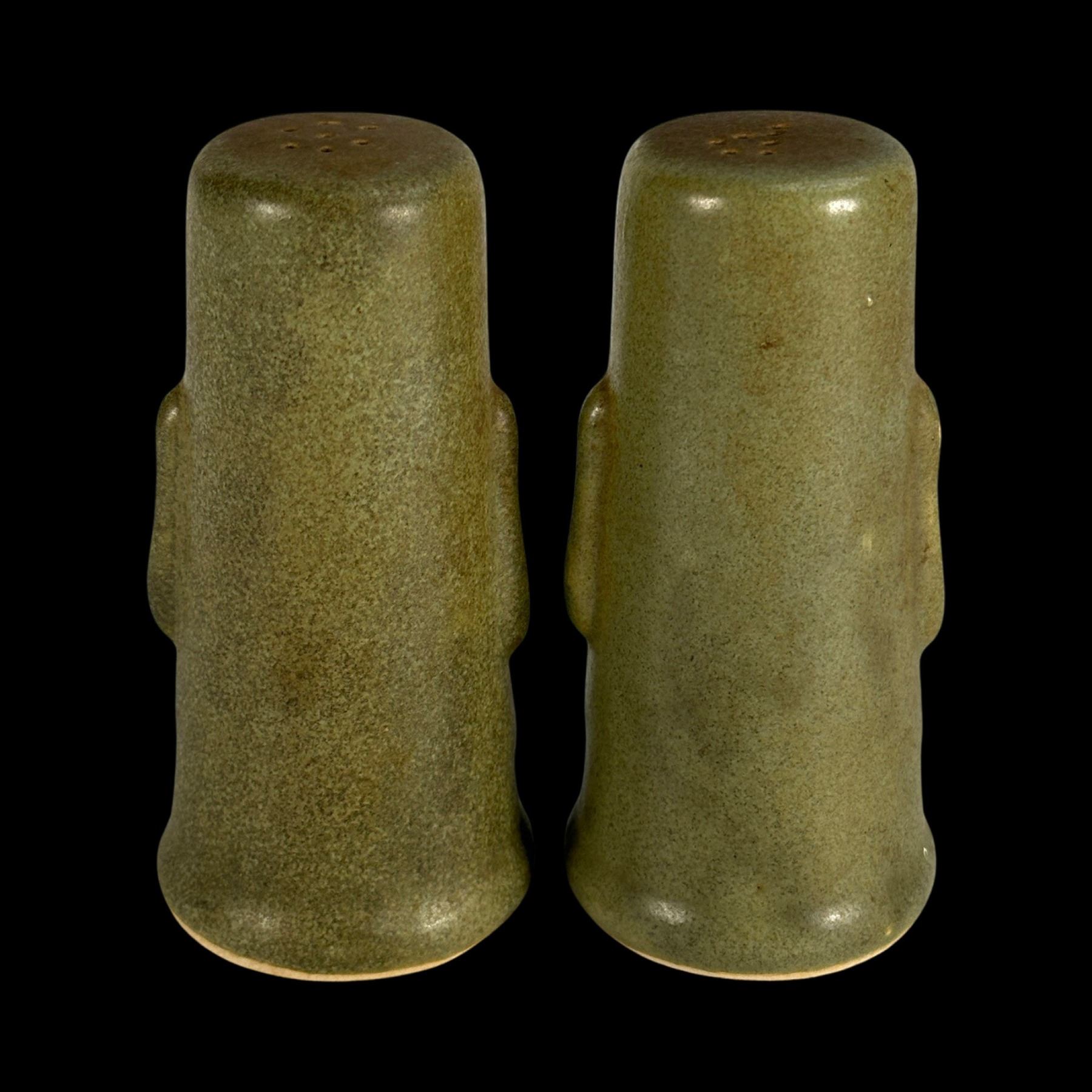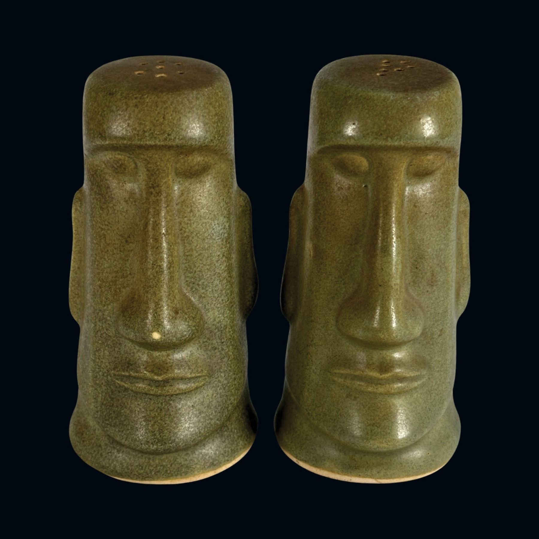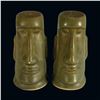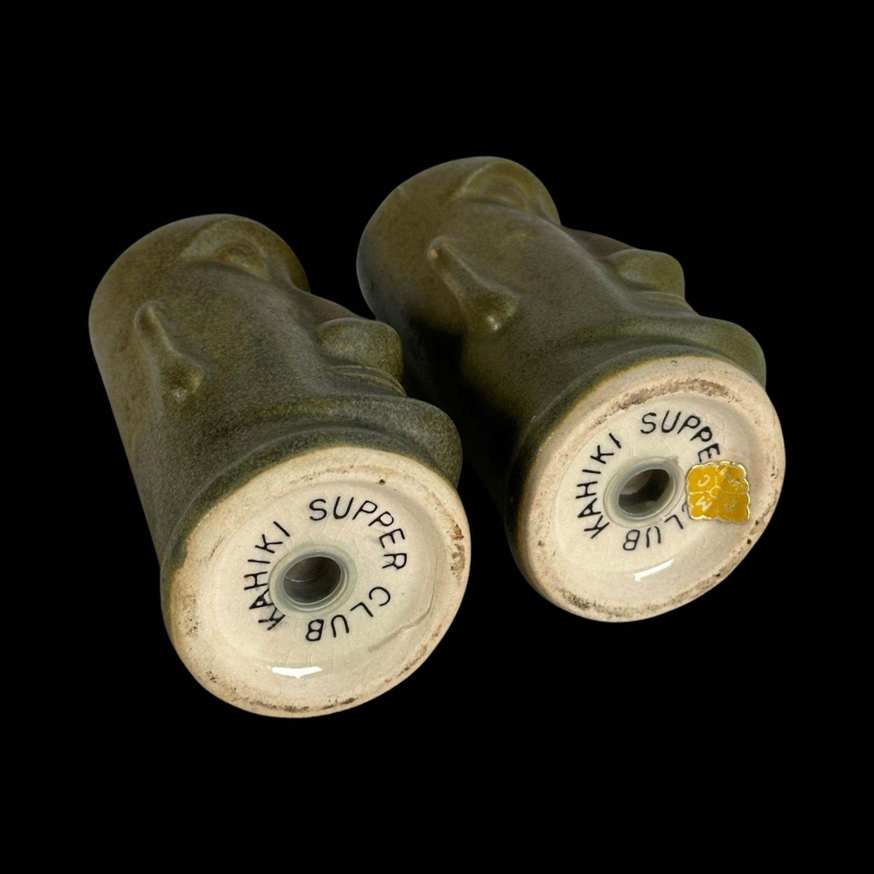 (1960s)* These were sold at the Kahiki's Beachcomber gift shop. The Moai was the logo Tiki of the Kahiki. VG+ with a light glaze flaw on the tip of one nose. Reatins OMC production sticker. 2.5"dia x 4.25" each.