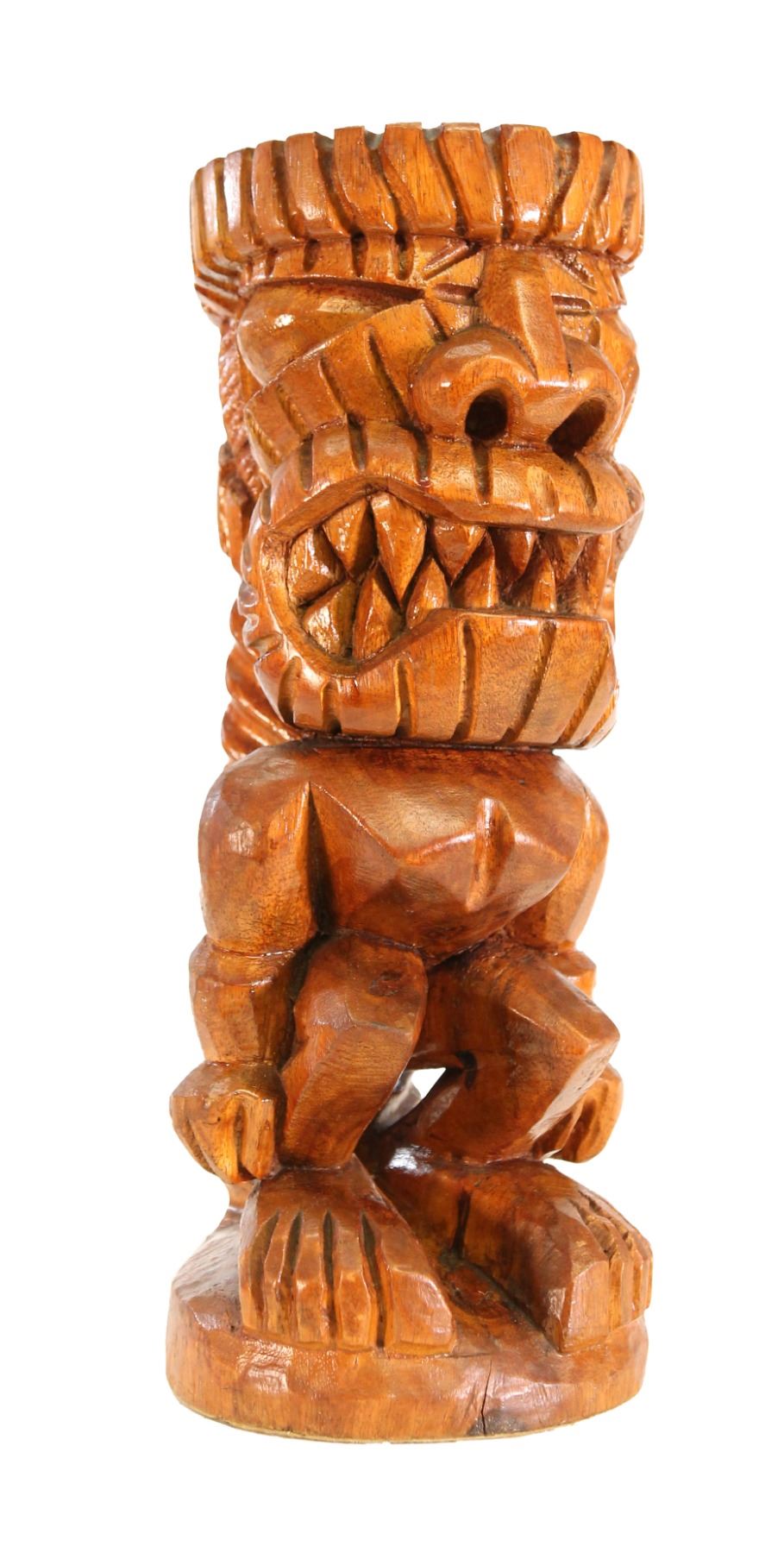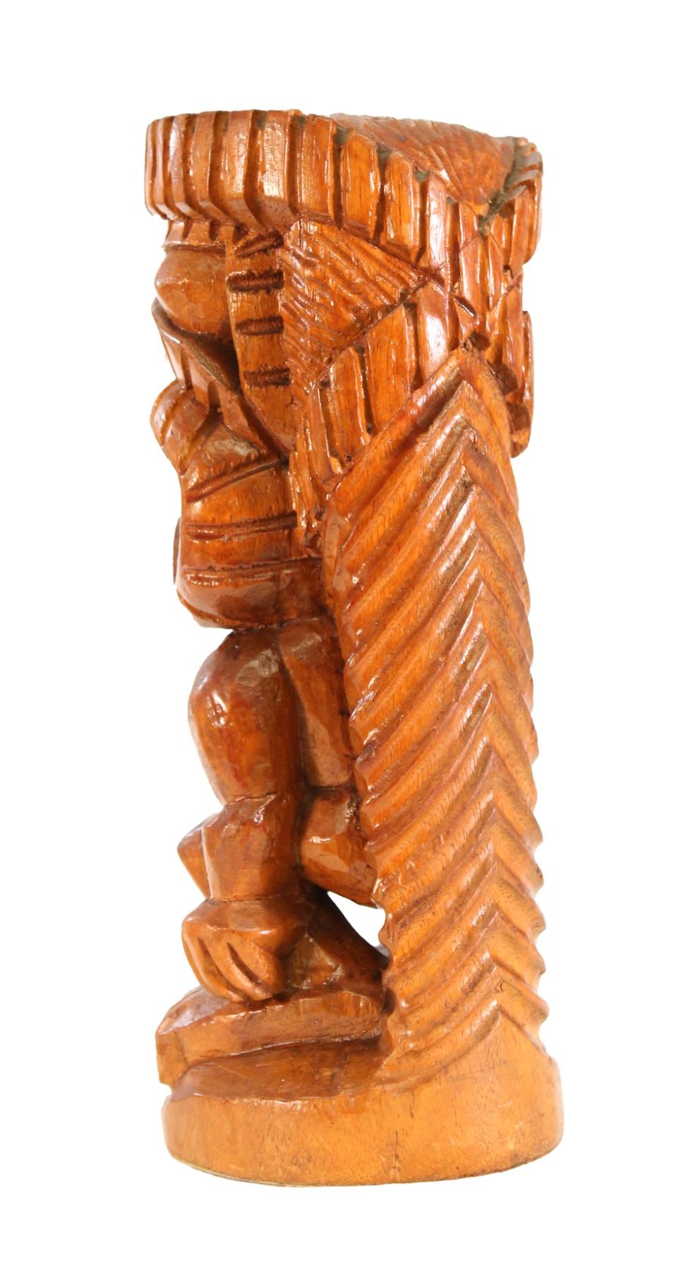 (1967). Wonderfully detailed, hand carved Tiki figure featuring a wide nose and mouth with unusually sharp teeth. Extremely uncommon from the standard Tiki idol image with squared teeth. Item includes label with "C. Silva." Solid wood. 14"x5.5". VG+ with typical wear.