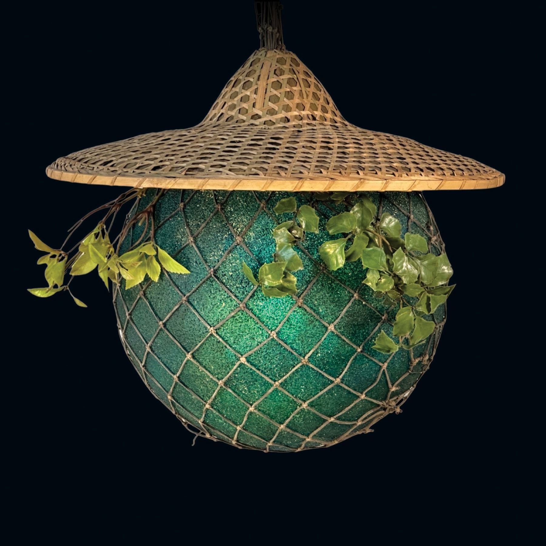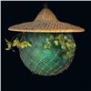 (1960s)* Another great lamp from Kelbo's in Los Angeles. This large fiberglass fish float is coated in resin and gravel and is hung in netting, topped with a large "Coolie Hat" as described in the OA catalog. Original plastic foliage is attached. VG+ with typical wear. 16"dia.