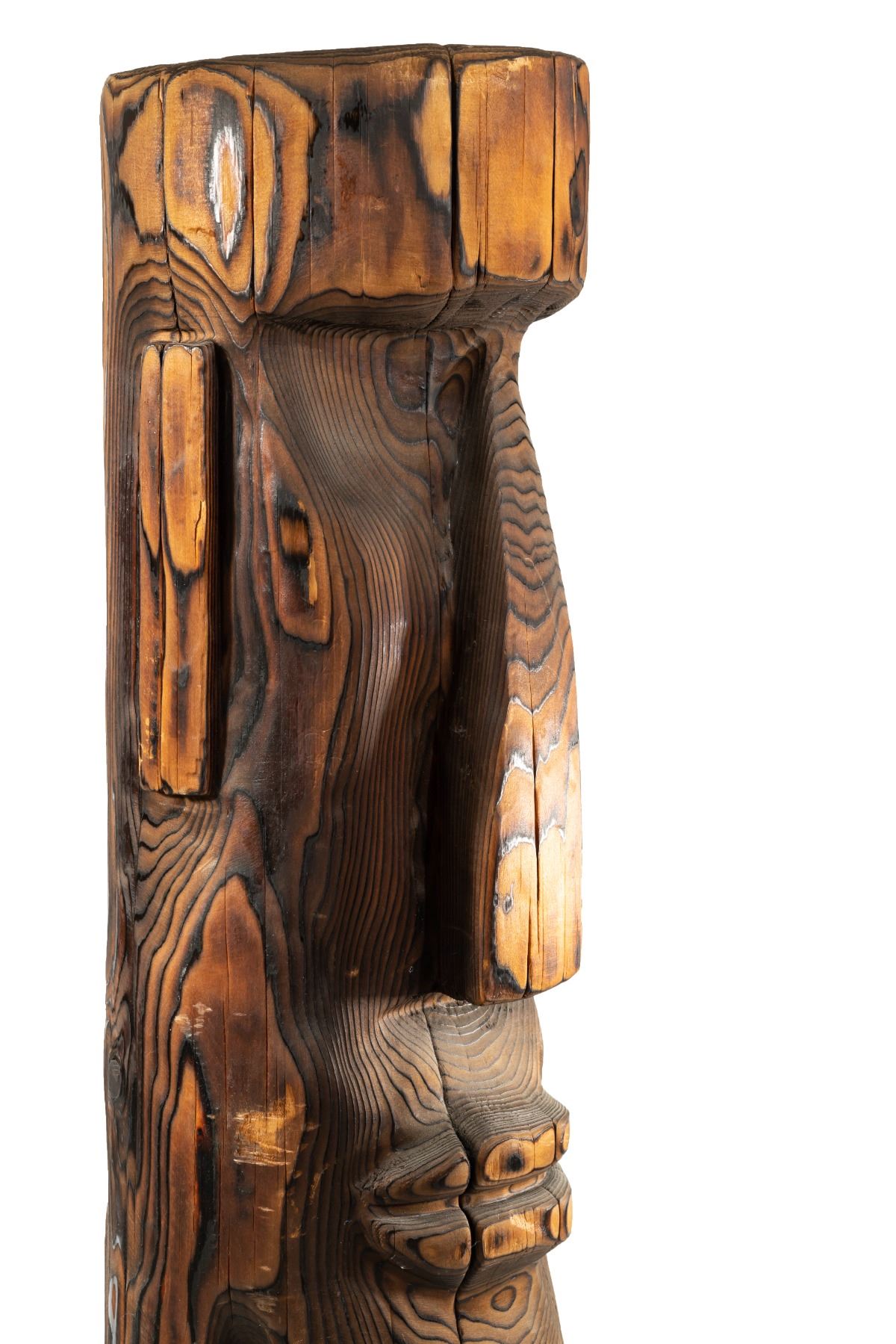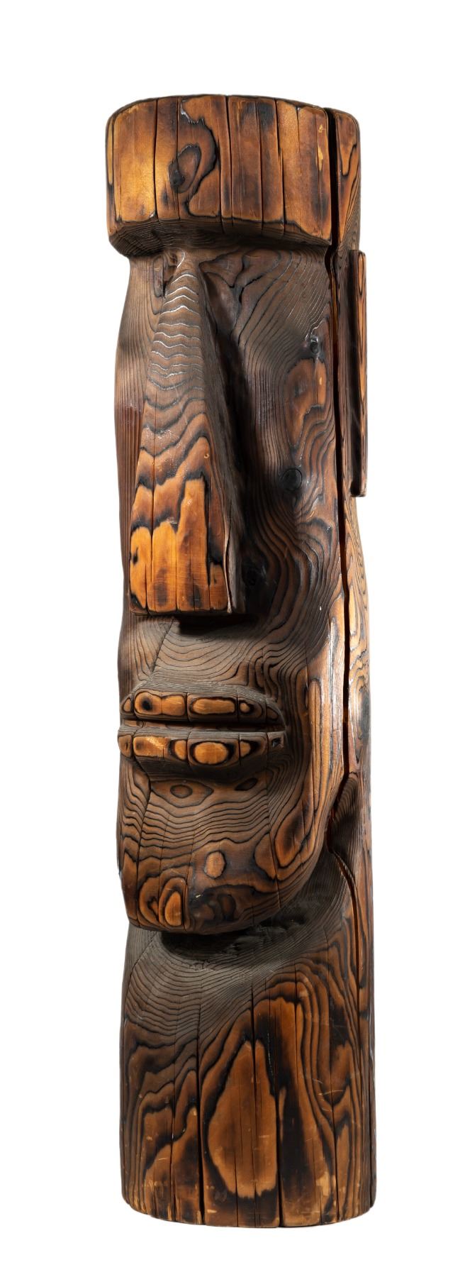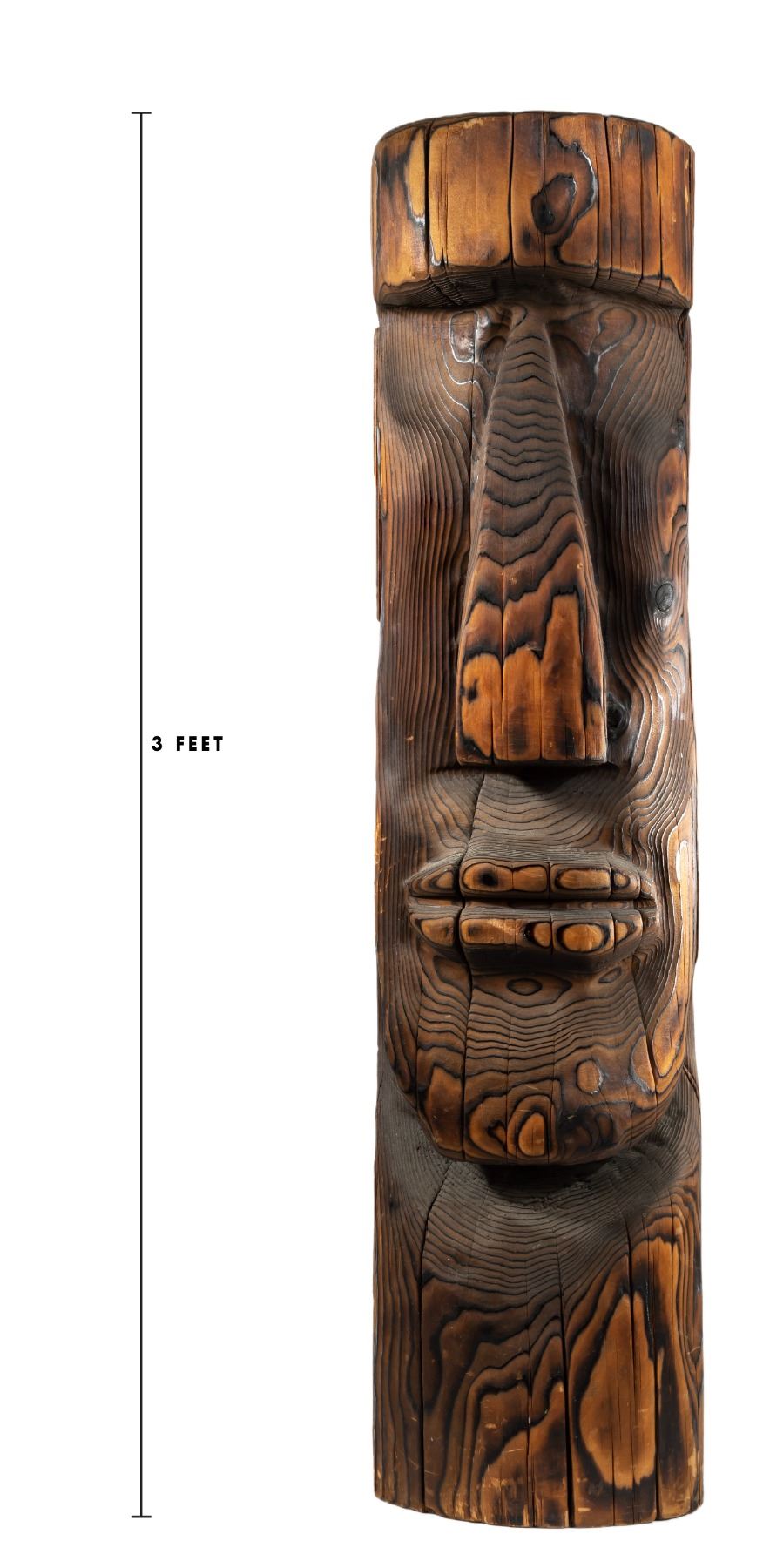 (2000s) Created by master carver, KEN PLEASANT, heir apparent and successor to WITCO god, WILLIAM WESTENHAVER. Hand-carved Moai Tiki features smooth, solid wooden sculpting with burned grain to enhance the facial features and create an interplay of light and shadow.36.5"x9". VG.