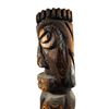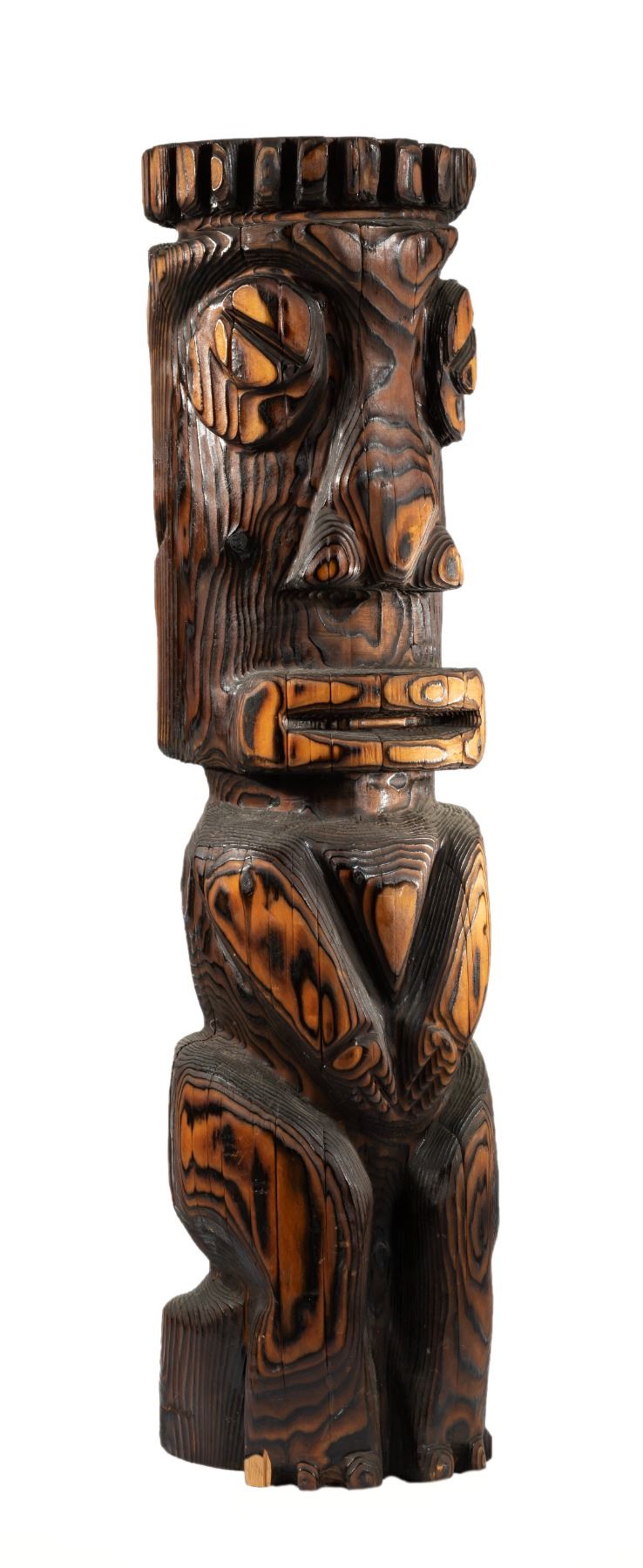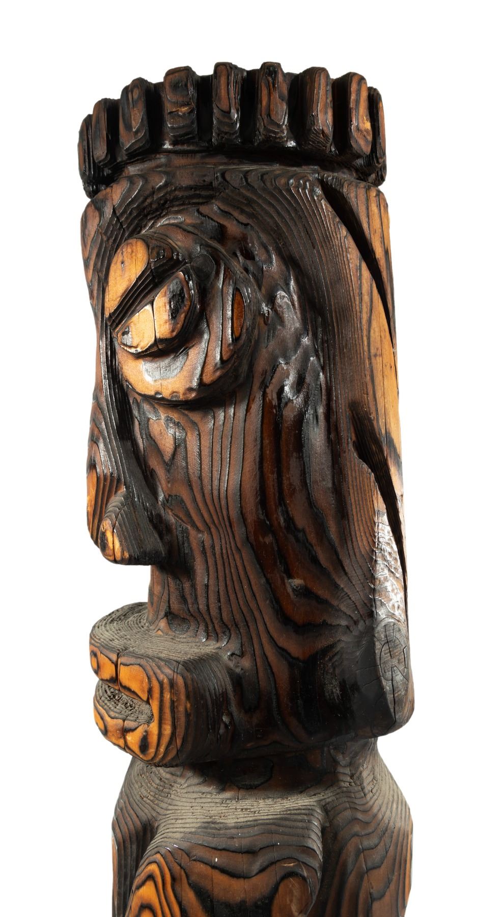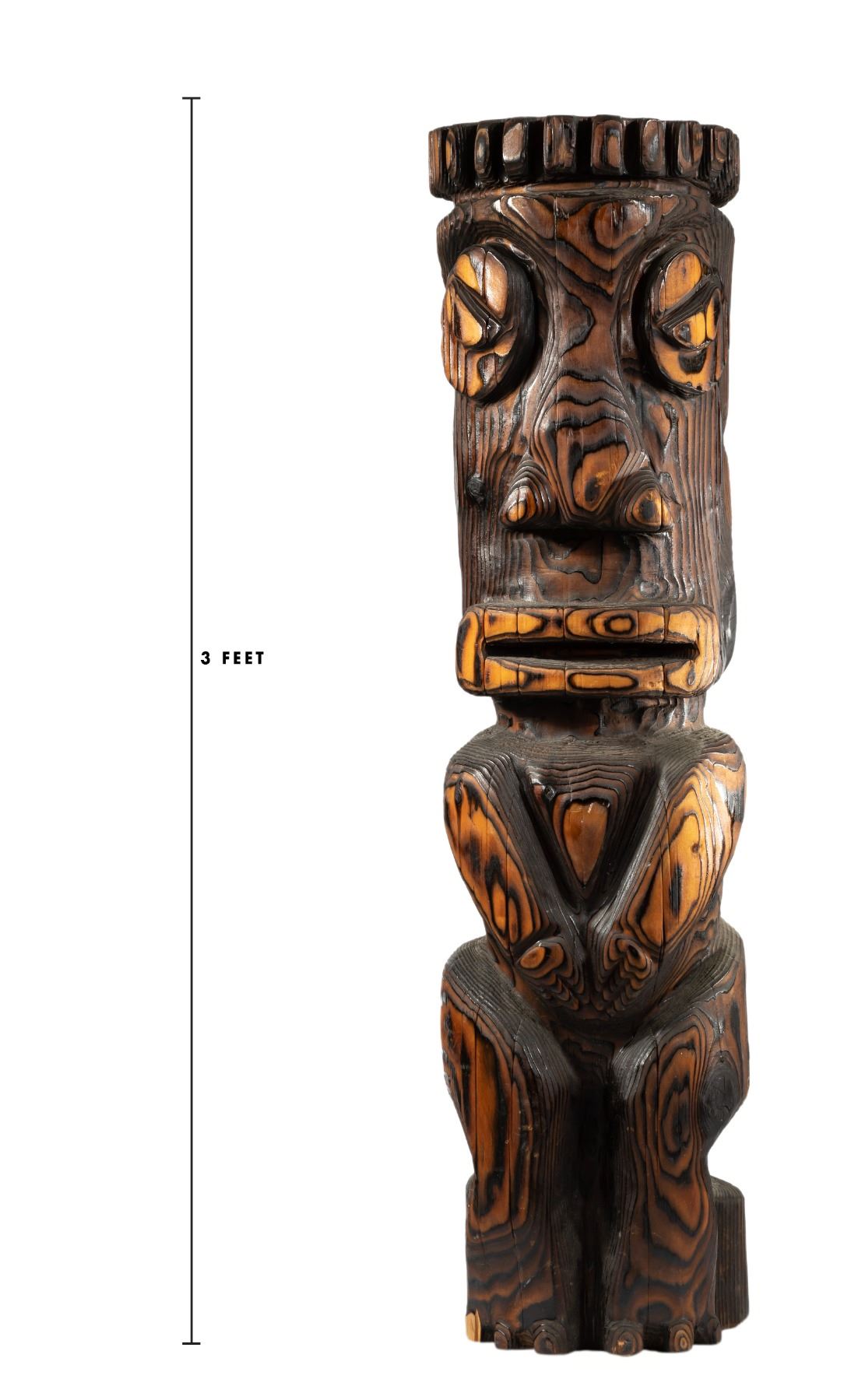 (2000s) Expertly handcrafted Tiki statue features a stoic guardian made of burned grain wood with sophisticated detail. Light grain enhances the facial features, which is adorned with a solid crown. 35"x9.5". VG+.