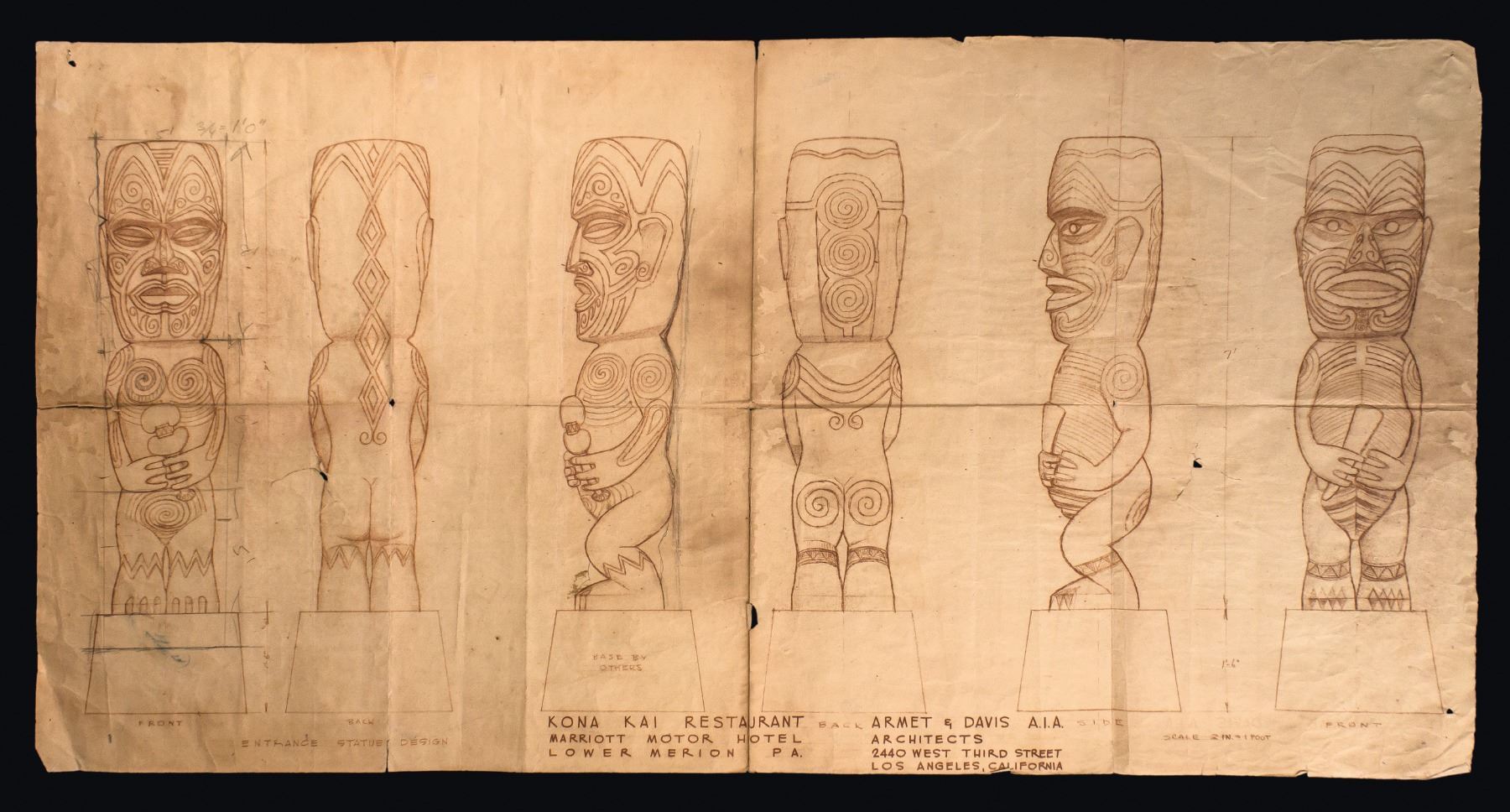 (1961) Here is the grandaddy of Tiki design drawings. This figure was created by Oceanic Arts working with Armet & Davis architecture firm for the flagship location of Marriott’s KONA KAI chain in Phildelphia, PA. This massive Maori tiki was first created for Kona Kai, Philly. Later, it was recreated for both the InterContinental Resort Tahara’a in Tahiti. Later, it was again reused for the Kona Kai location in Chicago, Illinois. This is a historic browline print of the original. 21.5”x42.5”. VG+ with edge creasing, folds and general wear.
