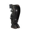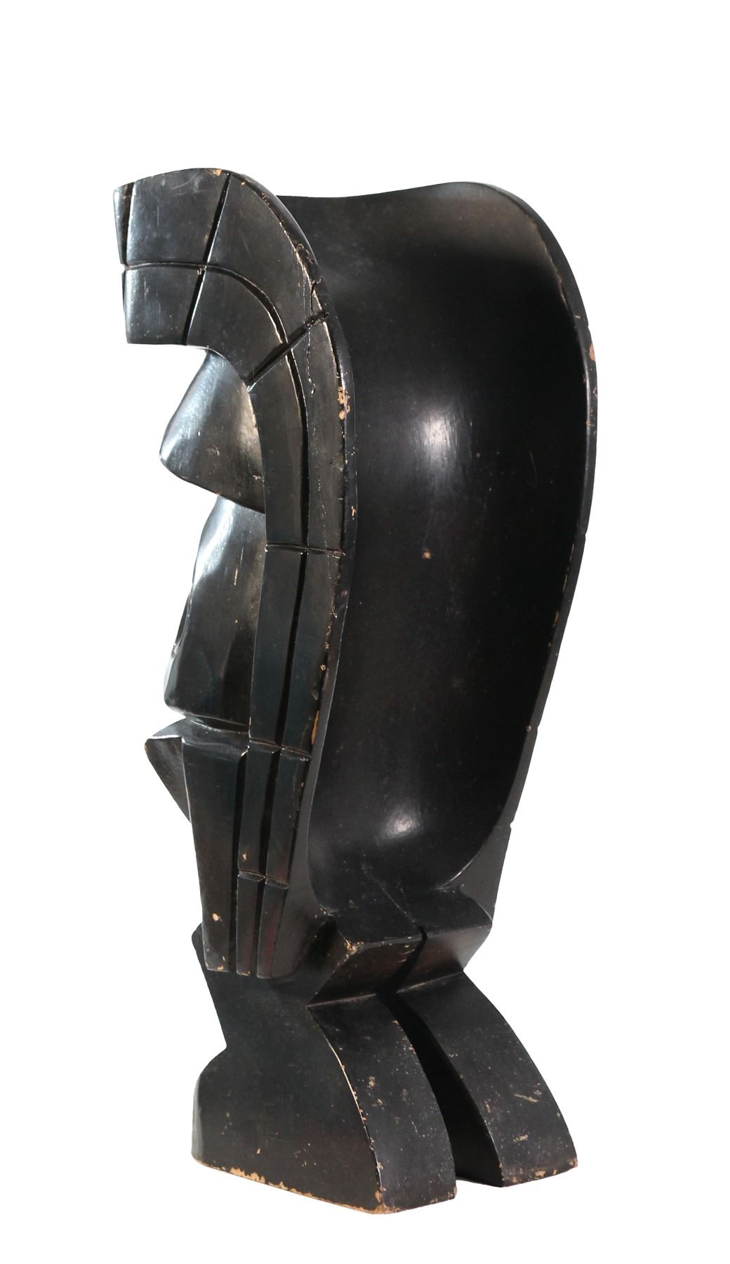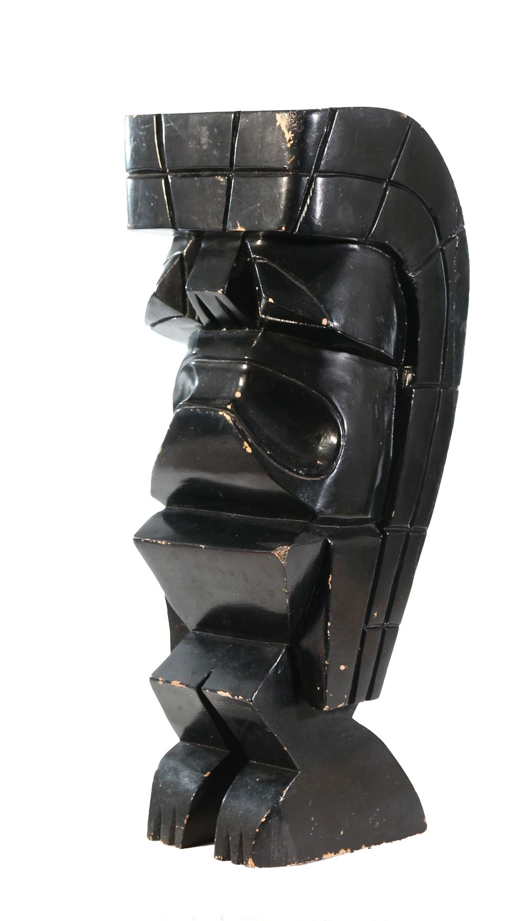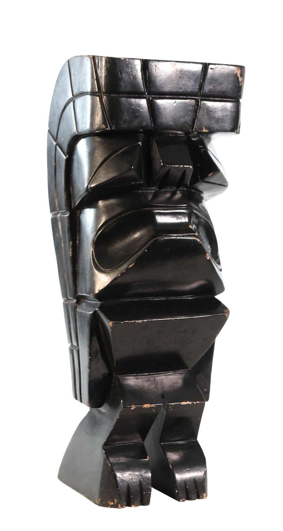 (1960s) Impressive, large Hawaiian War God Tiki idol painted black features a geometric design shape and brick-style crown. Imported by "Asia Joe", a colorful proprietor at THE INTERNATIONAL MARKET PLACE in Waikiki. Painted wood. A substantial piece. 18.5"x7". VG some paint chipping on edges.