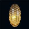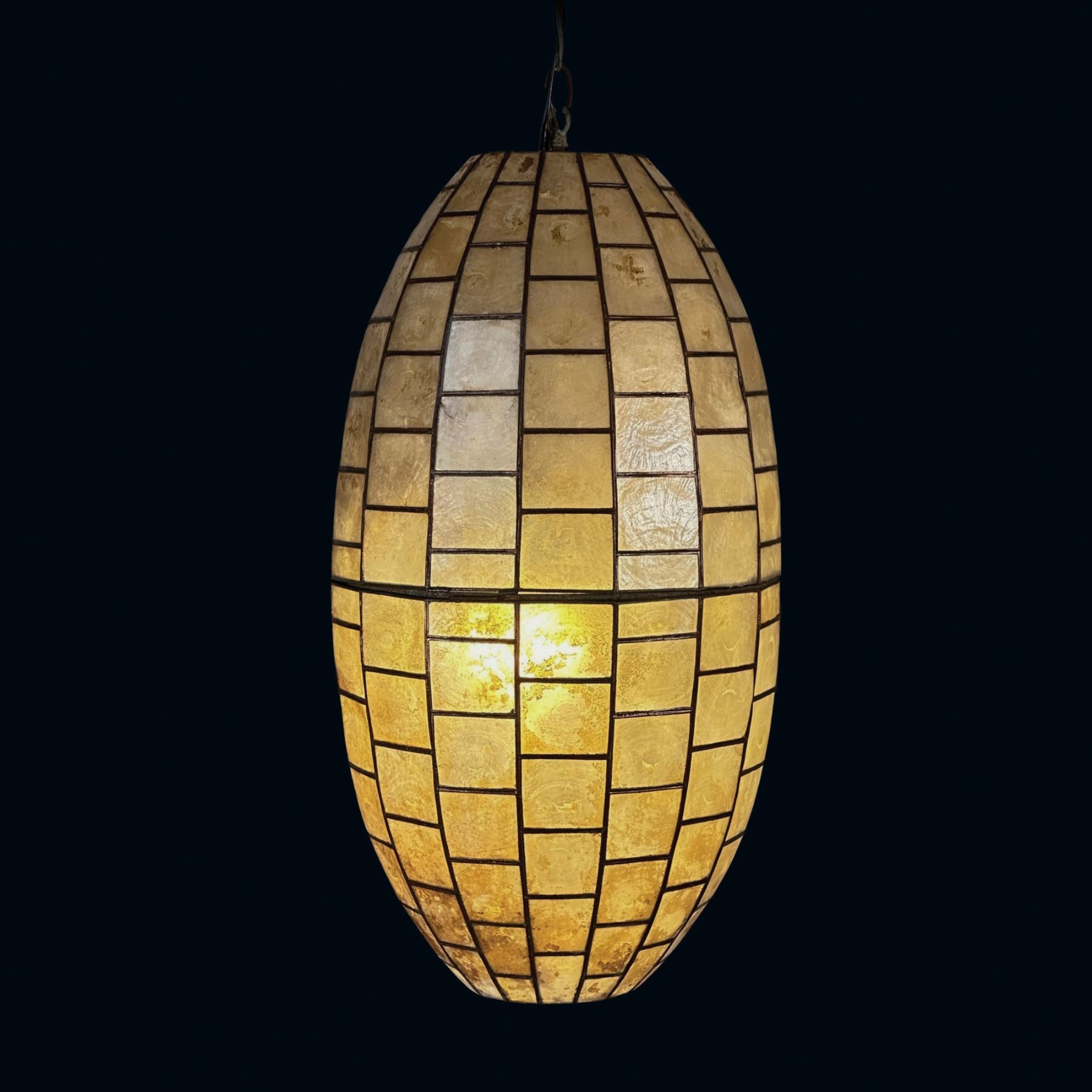 (1950s)* These capiz shell lamps were a staple of commercial Polynesian Pop decor during the 'Tiki Era' of the 1950s thru the 1970s. Made in Taiwan, the amount of labor and craftsmanship this lamp required was immense, especially for the price one finds them at in vintage catalogs. Gaze upon any good Polynesian restaurant interior postcard from the era and one of these amazing lamps is sure to be found. Because of their fragile nature, vintage commercial examples are extremely uncommon today. New drop electrical socket is provided. VG+ with typical wear and patina. 13"dia x 26".