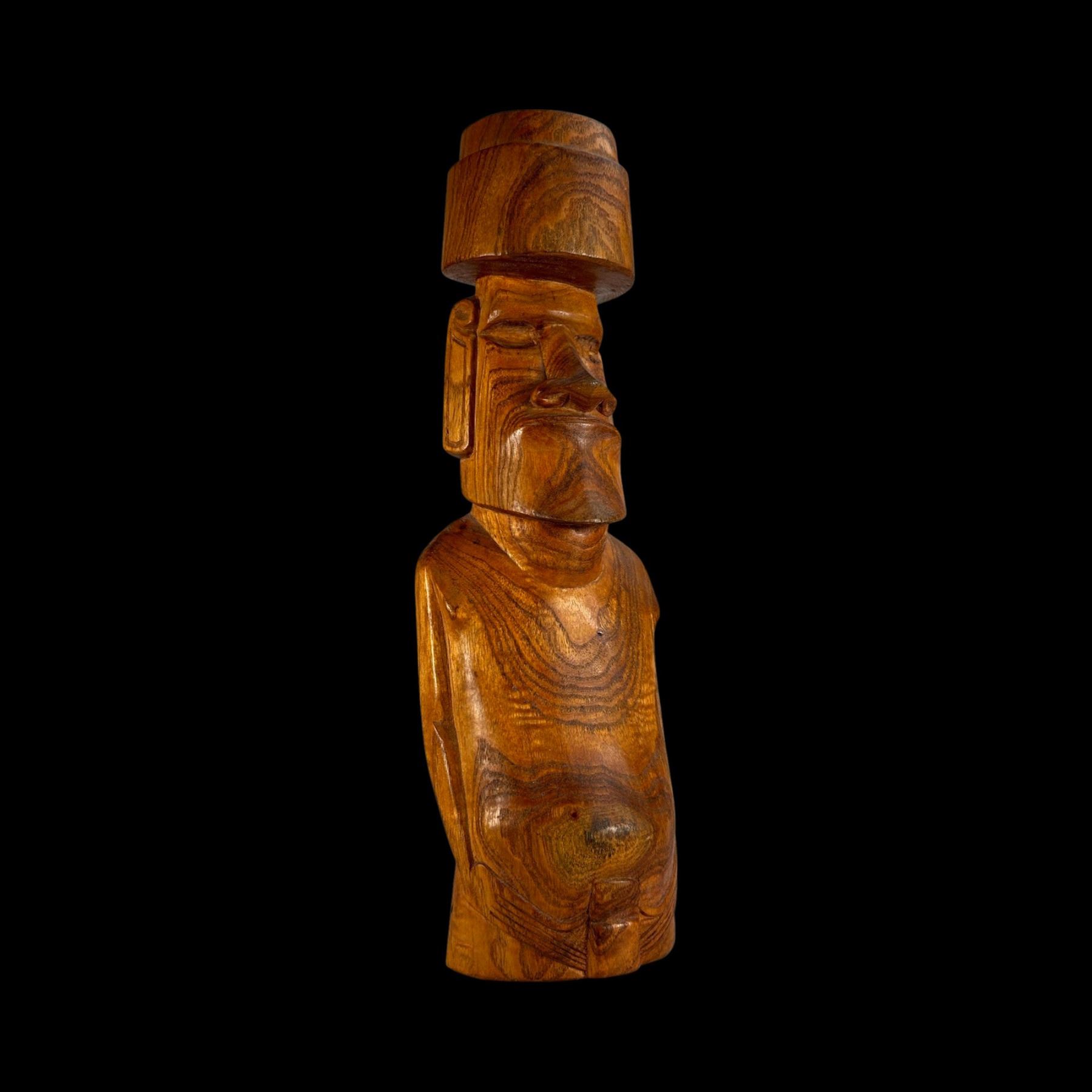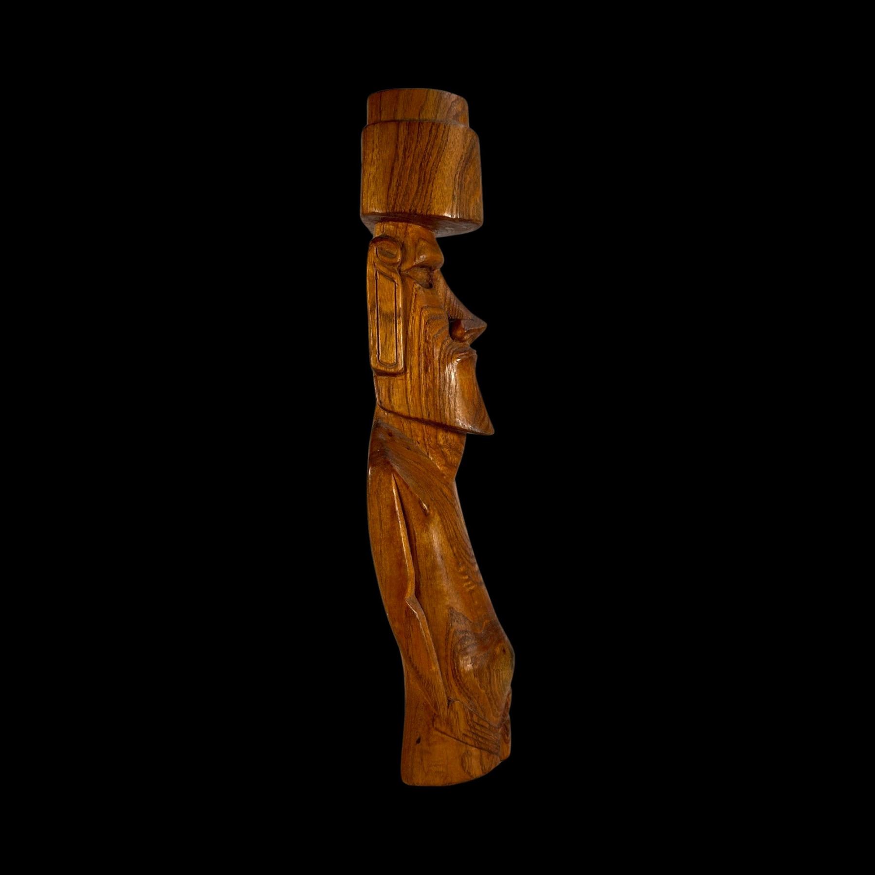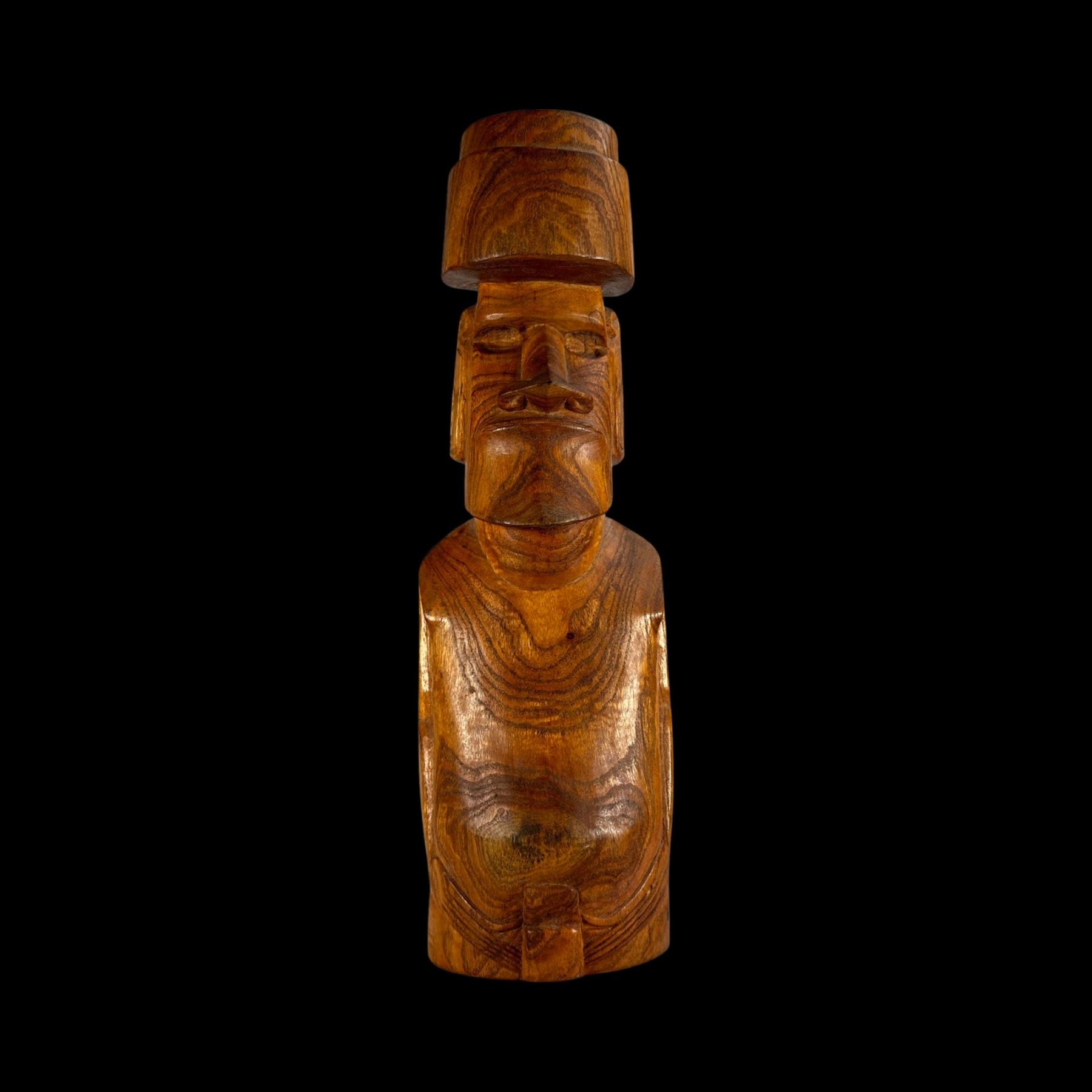 (1960s) A very imposing rendering in hardwood of an Aku Aku Moai as seen on Easter Island. Complete with topknot and carved tattoo markings on the back of the figure. VG+ with minor wear. 5.5"x17.75"x4".