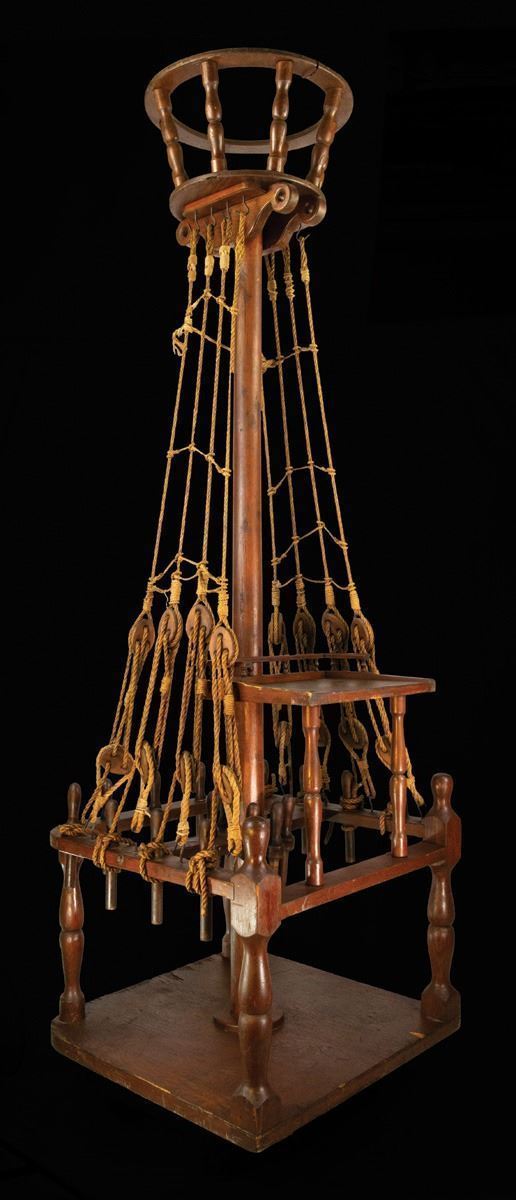 (1960s) This is a stunner of decor piece. If you have the room, this is the way to go, if you're going all in! The ship's mast is topped with a crow's nest, complete with rope shroud ladder rigging and dead-eyes, belaying pins in railing racks. General wear to some of the wood, but overall excellent condition. Very large and bulky. Special freight considerations.109"x36"x36".VG+ with typical wear from use.