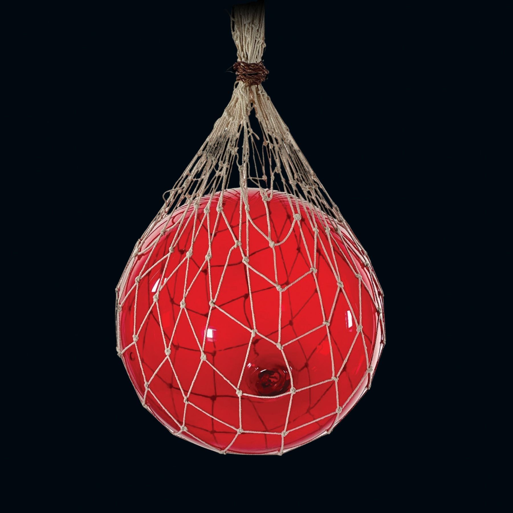 (1950s)* Another rare Japanese solid hand-blown fishing float in a super rich red glass. This is a much higher quality than the modern machine blown glass floats of today. Slung in netting to hang. Not made for lighting. VG+. 12"dia.