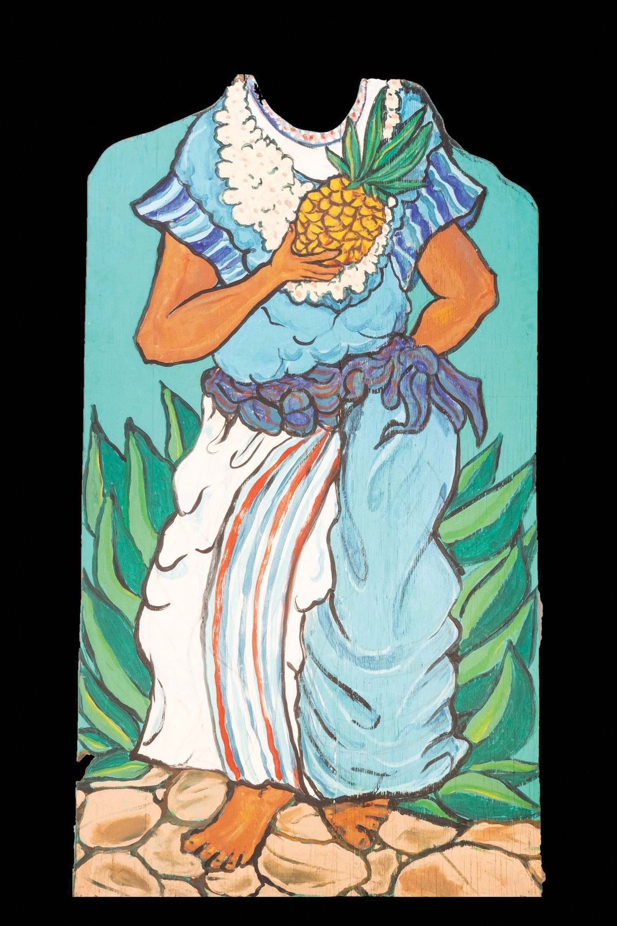 (1970s) A hand carved and painted Hawaiian Pineapple Wahini photo-op flat by LeRoy Schmaltz. Comes with custom stand. 58"x32". VG+ with typical wear.
